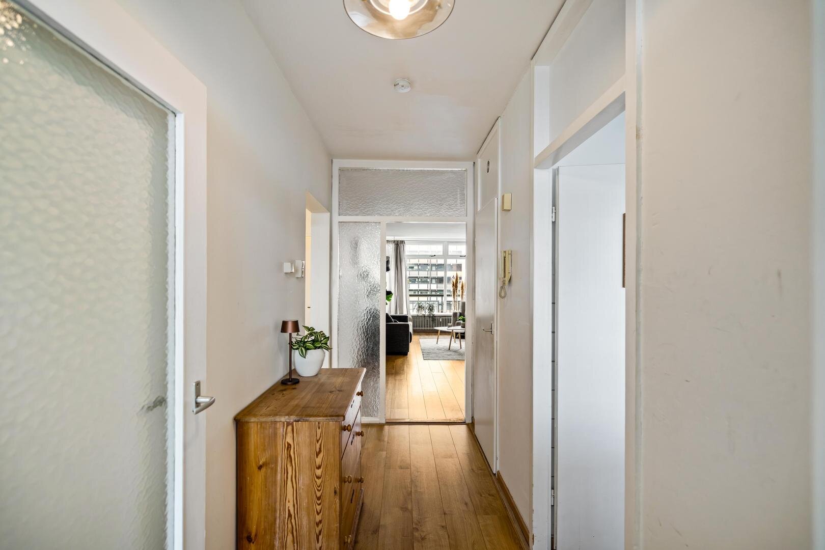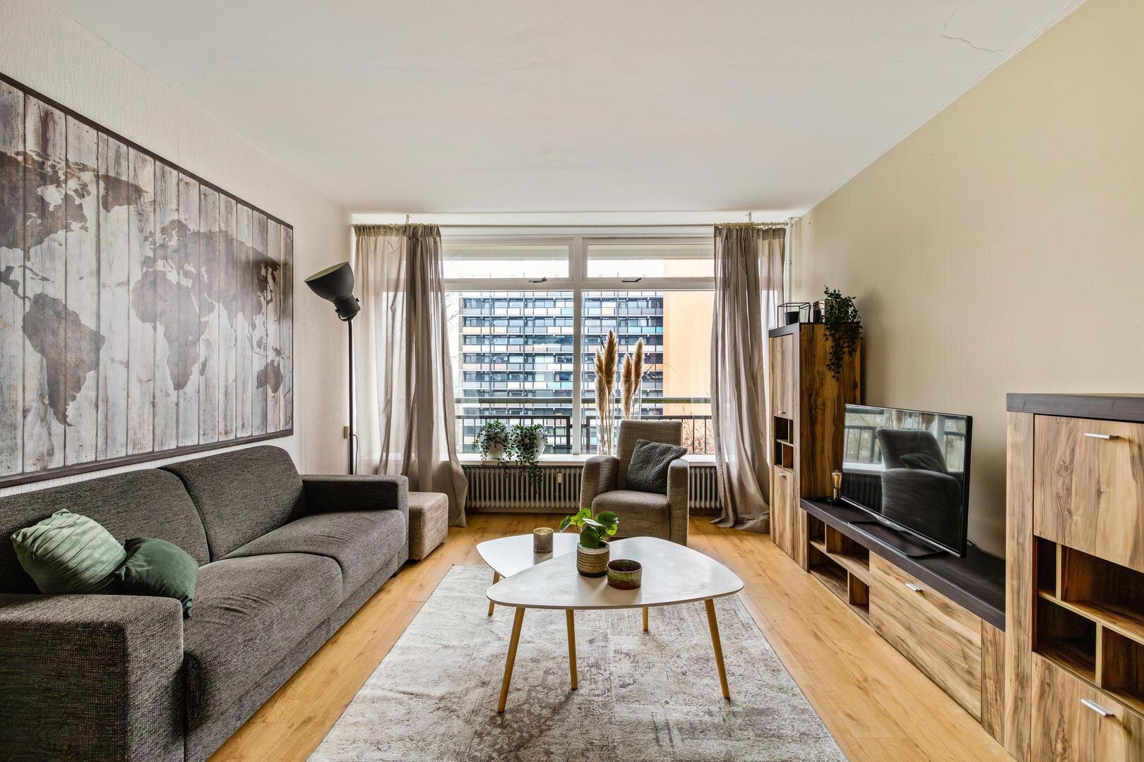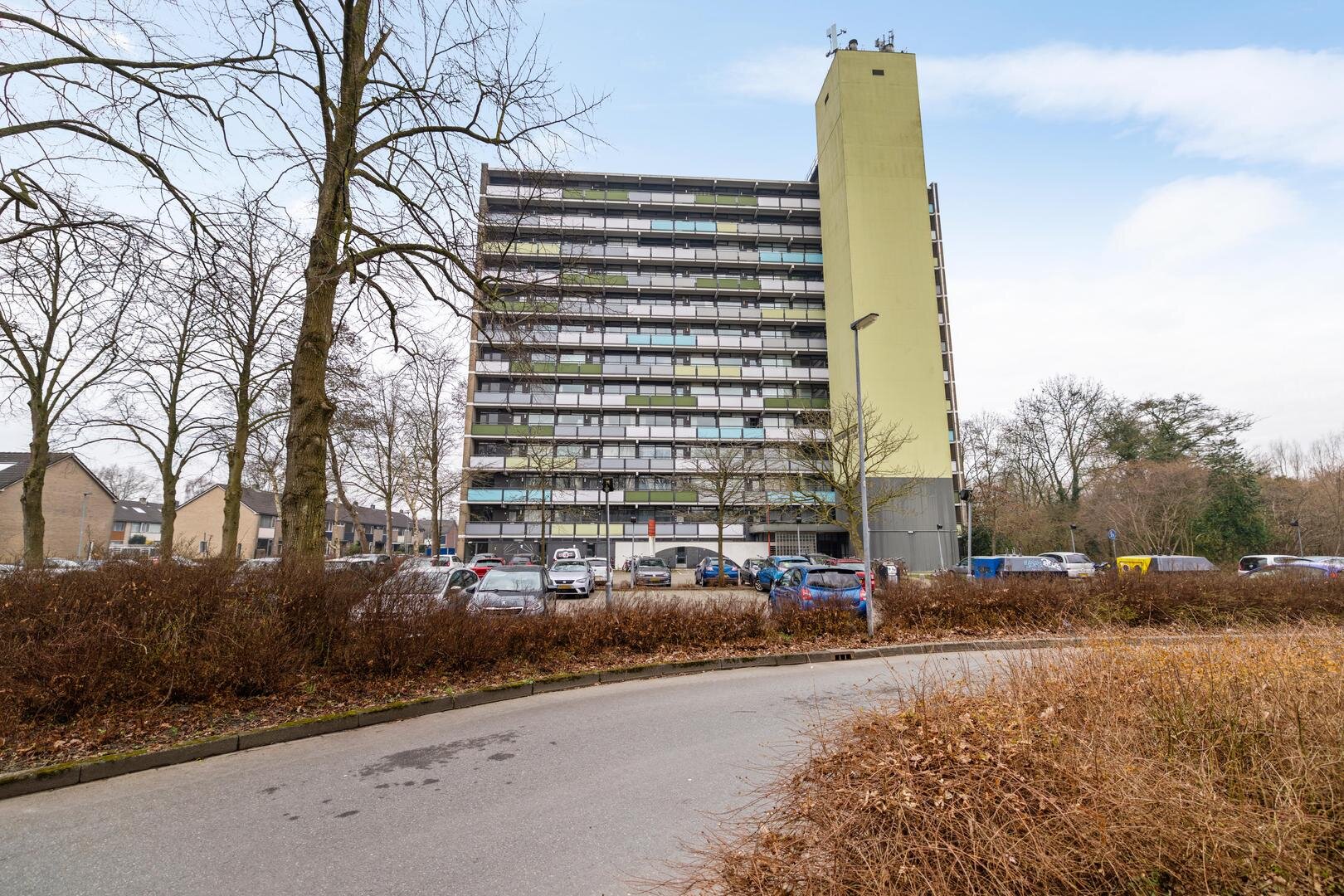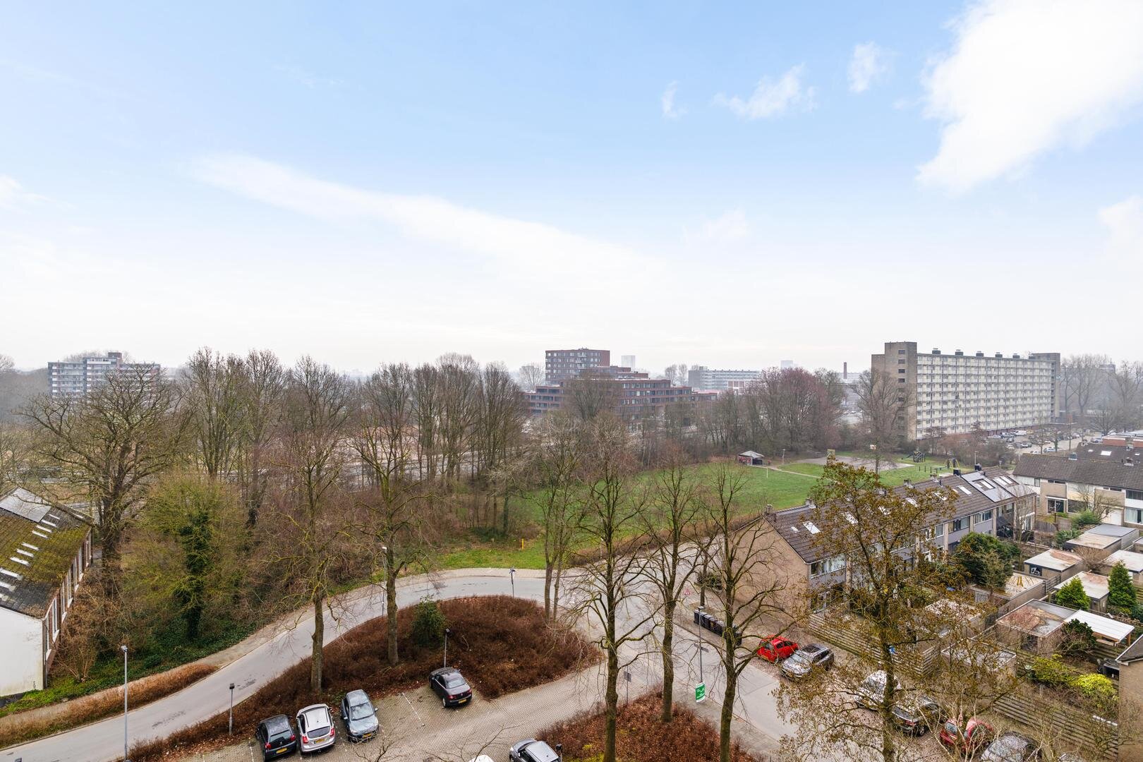 Centrale hal met intercom, brievenbussen, trappenhuis en twee liften.zevende verdieping : Entree met vaste kast en meterkast. Vanuit hier kom je in de hal met toegang tot de berging van 3m² en toegang tot de dichte ruime keuken van 8,5m² voorzien van een keukenblok, wasmachine, droger, vaatwasser gasfornuis met oven en een koelvriescombinatie wat allemaal achter blijft! Vanuit de ruime lichte woonkamer van ca. 26 m² heb je een heerlijk vrij uitzicht over de wijk. De woonkamer beschikt ook over grote raampartijen wat bijdraagt aan het ruimtelijke gevoel. Vanuit de hal zijn ook het toilet met fonteintje en de moderne badkamer met douche en wastafel bereikbaar.Tot slot telt de woning 2 ruime slaapkamers van ca. 13 m² met aan de achterzijde toegang tot het balkon gelegen op het westen.* Heerlijk wonen met vrij uitzicht