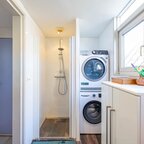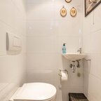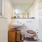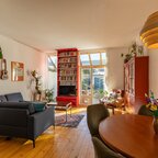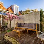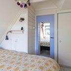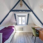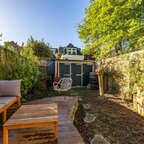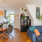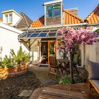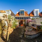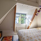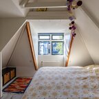 Op de verdieping geeft de overloop toegang tot twee slaapkamers en de badkamer. De slaapkamer aan de voorzijde is circa 6 m² en beschikt over veel bergruimte achter de knieschotten. De slaapkamer aan de achterzijde is circa 7 m² en is voorzien van ingebouwde kasten. De badkamer van circa 5 m² is uitgerust met een douche, wastafel, tweede toilet en de aansluiting voor de wasmachine.De prachtig aangelegde achtertuin ligt op het zuiden. Dankzij de openslaande deuren lopen binnen en buiten naadloos in elkaar over. De overkapping, uitgevoerd met transparante zonnepanelen, maakt deze buitenruimte extra bijzonder. De duurzaam aangelegde tuin ademt rust en sfeer en is een heerlijke plek om volop van de zon te genieten.- Sfeervolle schipperswoning uit 1896