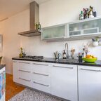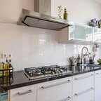 Entree/hal met toilet. De woonkamer met open keuken van circa 32 m² is speels ingedeeld dankzij de schuine scheidingswanden. De grote raampartijen, openslaande deuren naar de tuin en de warme houten vloer zorgen voor veel lichtinval en maken dit tot een heerlijke leefruimte. Aan de voorzijde van de woning bevindt zich de keuken. Dankzij de schuine opstelling geniet je hier van veel privacy. De keuken is voorzien van een 4-pits gasfornuis, afzuigkap, vaatwasser, koelkast, vriezer, een ingebouwde oven en magnetron.Eerste verdieping