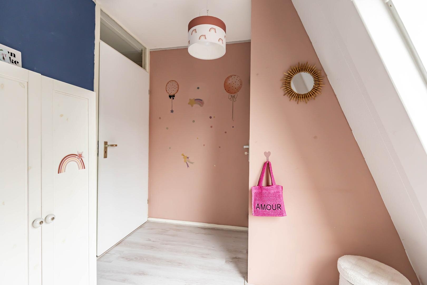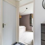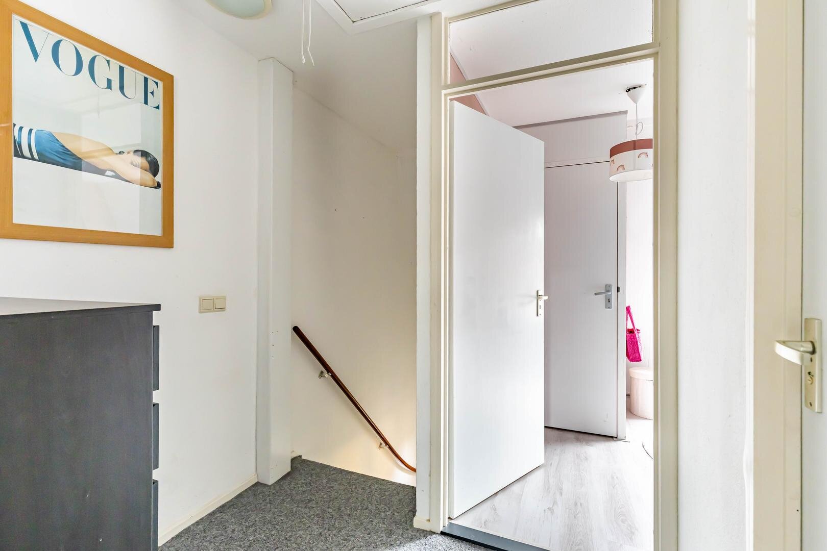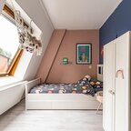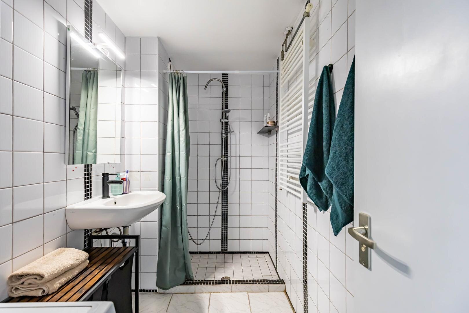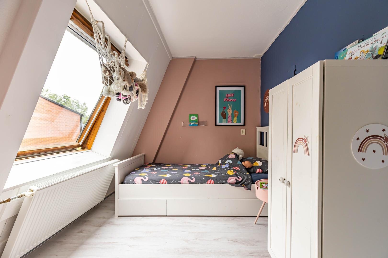 Hier bevinden zich twee slaapkamers van circa 7 m² en 14 m². De kleinere slaapkamer ligt aan de voorzijde en beschikt over een vaste kast. De grotere kamer aan de achterzijde biedt uitzicht op de tuin. De badkamer is uitgerust met een inloopdouche, wastafel en aansluiting voor de wasmachine.Zolder: