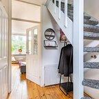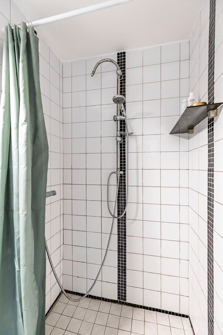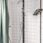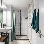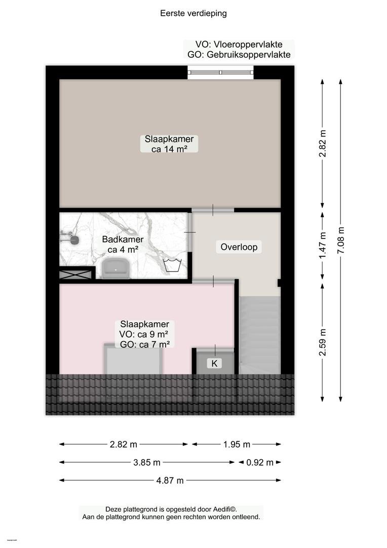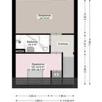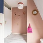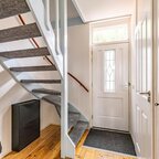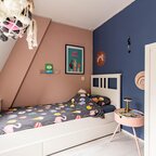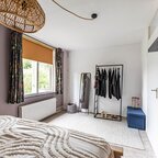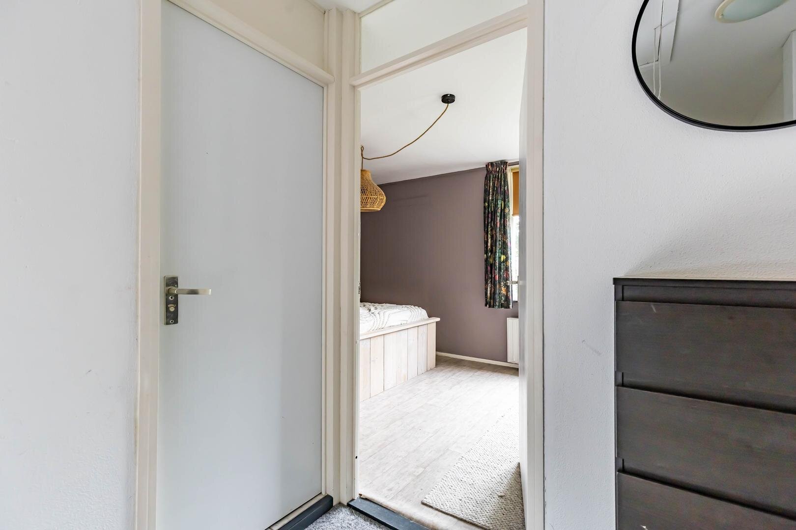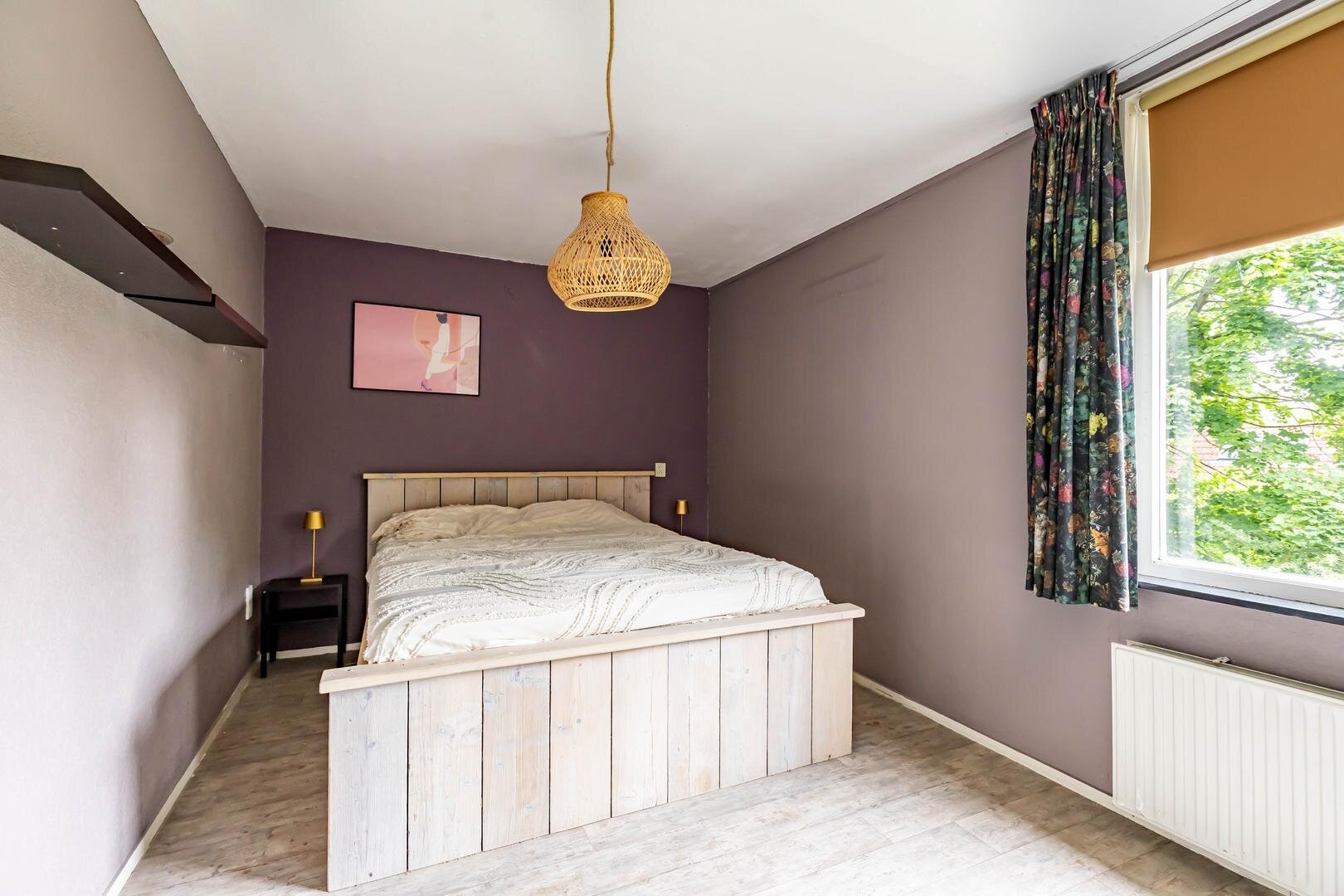 Hier bevinden zich twee slaapkamers van circa 7 m² en 14 m². De kleinere slaapkamer ligt aan de voorzijde en beschikt over een vaste kast. De grotere kamer aan de achterzijde biedt uitzicht op de tuin. De badkamer is uitgerust met een inloopdouche, wastafel en aansluiting voor de wasmachine.Zolder: