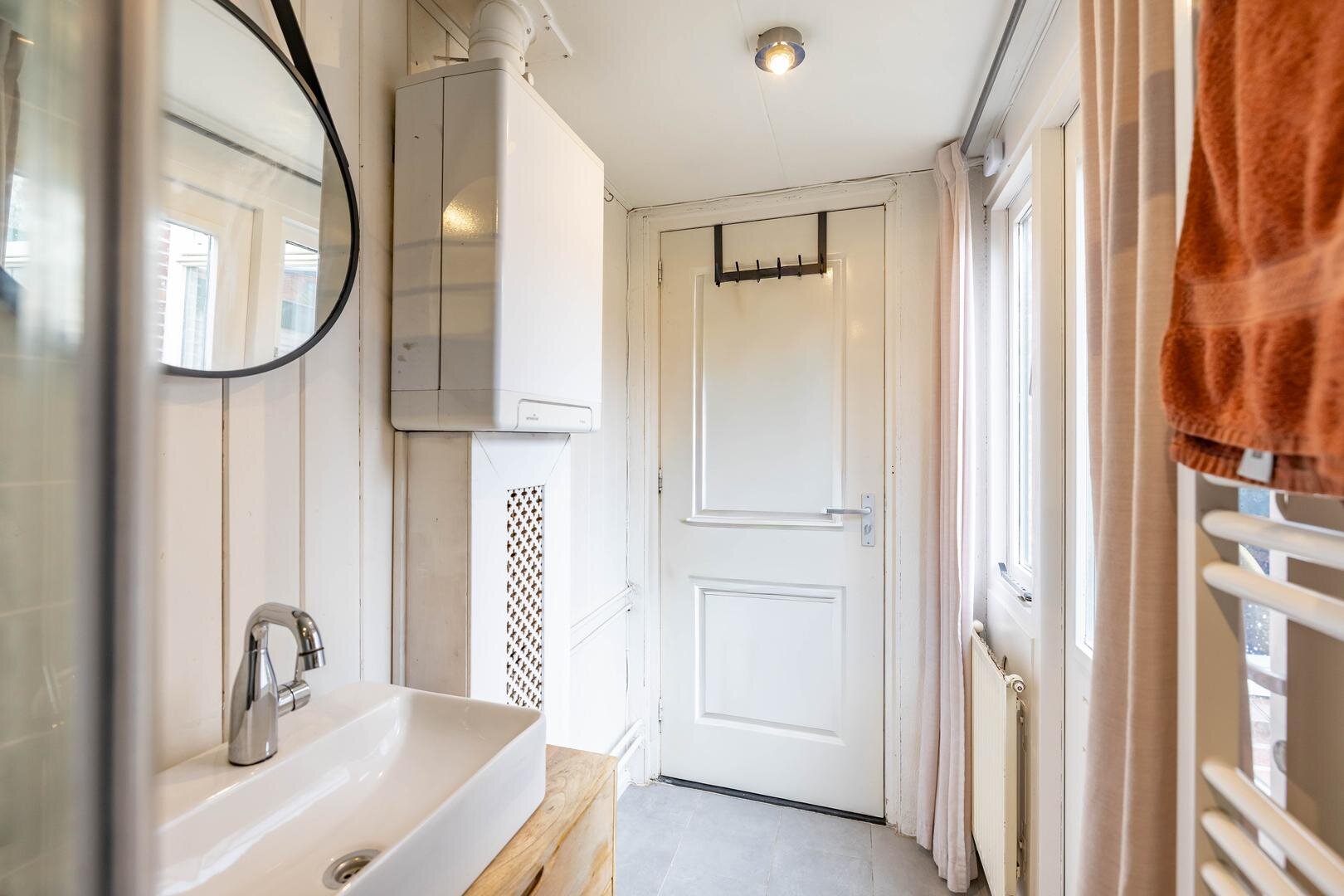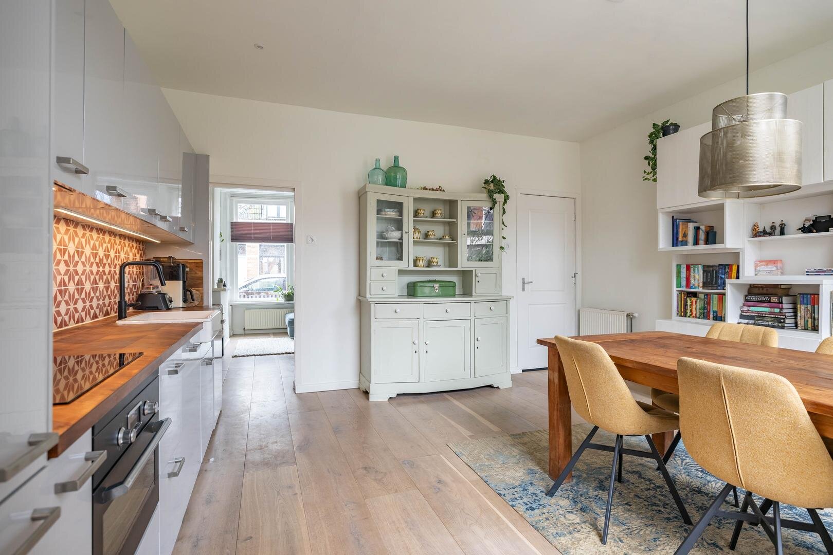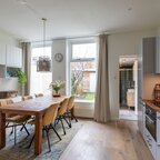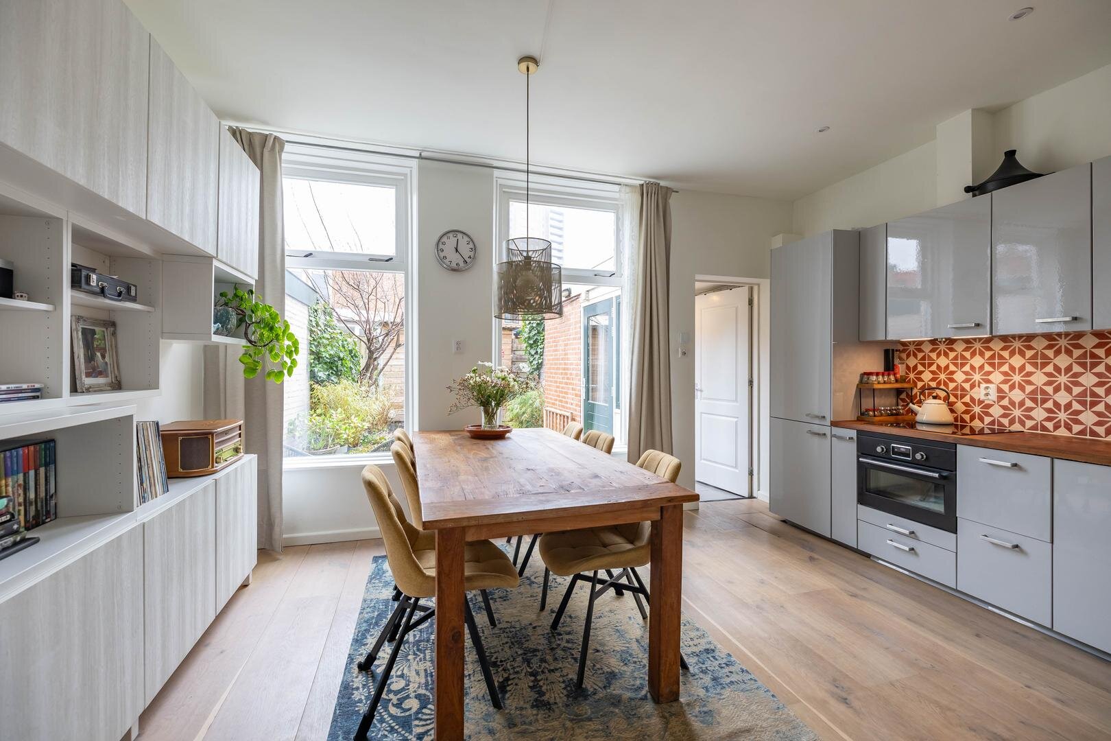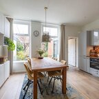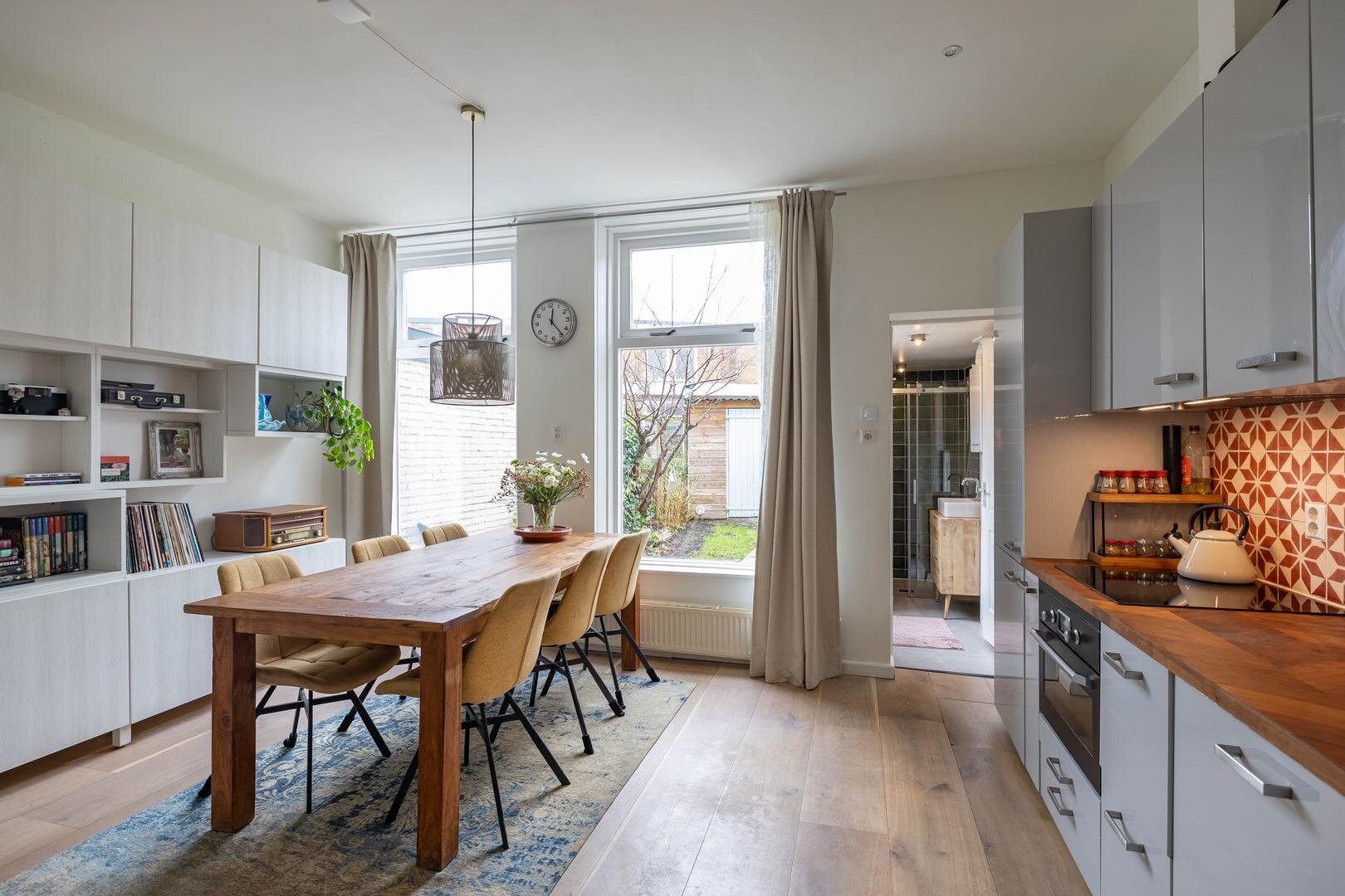 Entree met meterkast en separaat toilet, met toegang tot de ruime leefkeuken. De halfopen keuken van ca. 20,5 m² is voorzien van een moderne en smaakvolle keukenopstelling. De keuken beschikt over een 4-pits inductiekookplaat, afzuigkap, vaatwasser, koel-vriescombinatie en wasmachineaansluiting. De lichte woonkamer van 15 m² heeft een fijne, authentieke sfeer, mede dankzij de houten vloeren op de begane grond. Aan de achterzijde bevindt zich de moderne badkamer, voorzien van een inloopdouche, wastafel en de cv-opstelling.Eerste verdieping