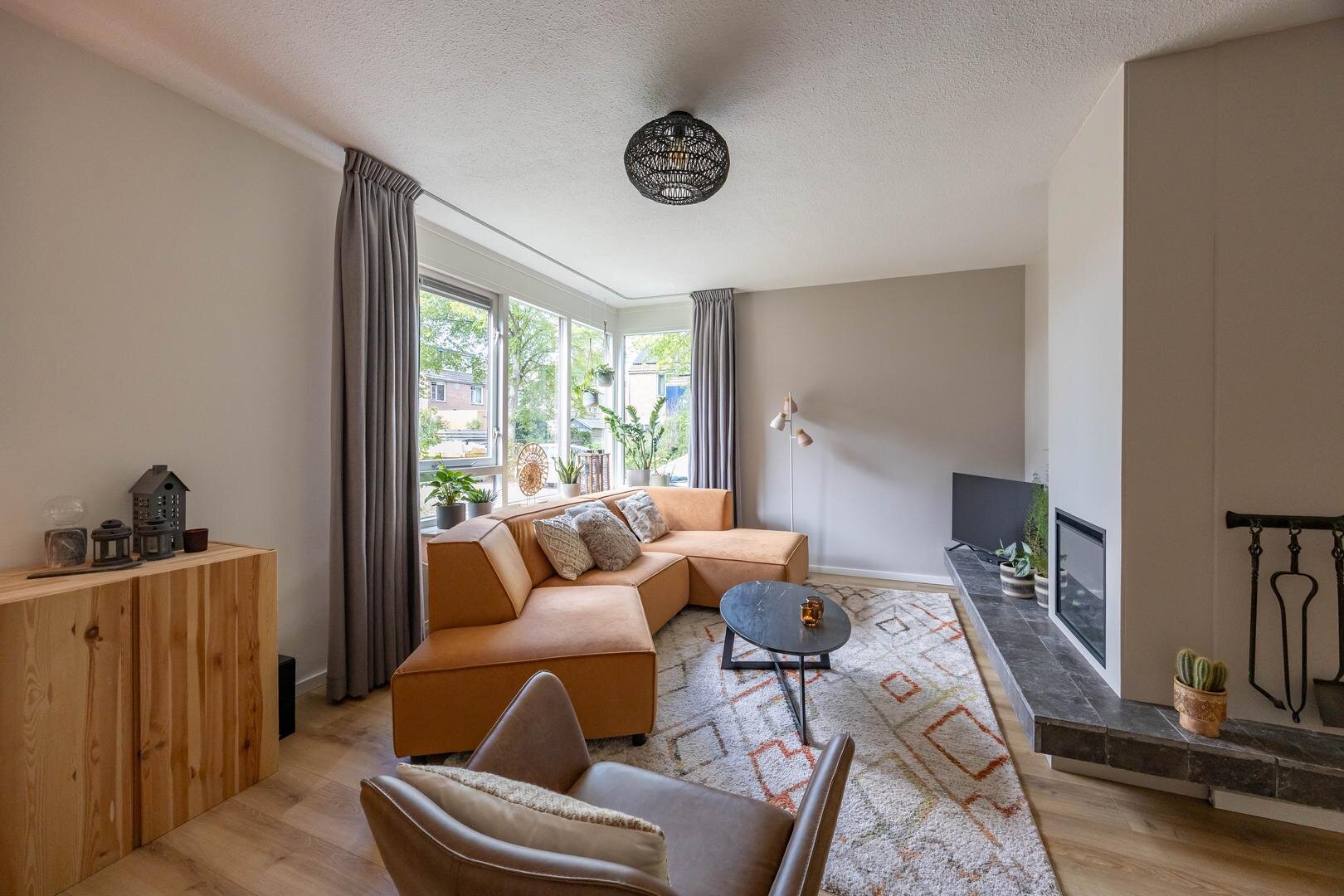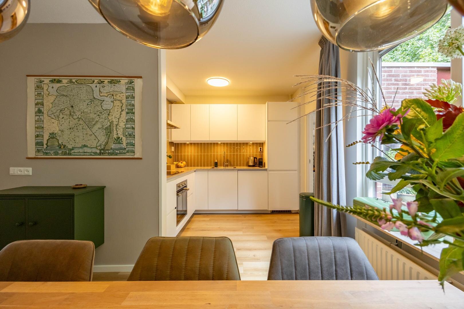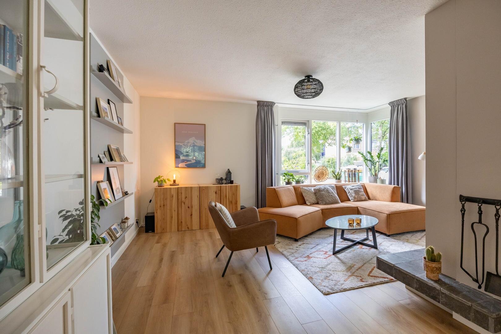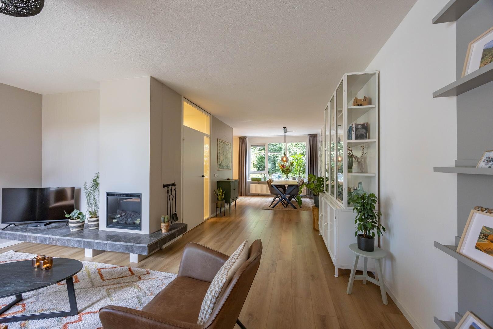 Begane grond: Entree/hal met trapopgang, meterkast, vaste kast en modern toilet. Vanuit de hal stap je de ruime en lichte woonkamer in van ca. 44 m², voorzien van een sfeervolle laminaatvloer en strakke wandafwerking. Aan de voorzijde bevindt zich het zitgedeelte met een elektrische sfeerhaard en de mogelijkheid om een houtkachel terug te plaatsen. Aan de achterzijde is het eetgedeelte, grenzend aan de open keuken. Via de keuken is er toegang tot de bijkeuken met wasmachineaansluiting. De moderne keuken is uitgerust met diverse inbouwapparatuur, waaronder een 4-pits inductiekookplaat, oven, koel-vriescombinatie, vaatwasser en afzuigkap. De aangebouwde garage is bereikbaar via de bijkeuken én vanaf de oprit.Eerste verdieping: Vanaf de overloop zijn alle vertrekken op deze verdieping toegankelijk. Aan de voorzijde bevinden zich twee slaapkamers van één van ca. 12 m² en één slaapkamer van ca. 10 m² met een praktische kastenwand. Aan de achterzijde ligt een royale slaapkamer van ca. 15 m². De moderne badkamer is voorzien van een ruime inloopdouche, een wastafelmeubel en een tweede toilet. Via de overloop is er toegang tot de trap naar de tweede verdieping.Tweede verdieping: Op de overloop bevinden zich de CV-opstelling en toegang tot een ruime slaapkamer van ca. 13 m², met extra bergruimte achter de knieschotten.De groene achtertuin ligt op het noordoosten en biedt volop rust en privacy, een fijne plek om tot jezelf te komen.* stijlvolle en instapklare gezinswoning
