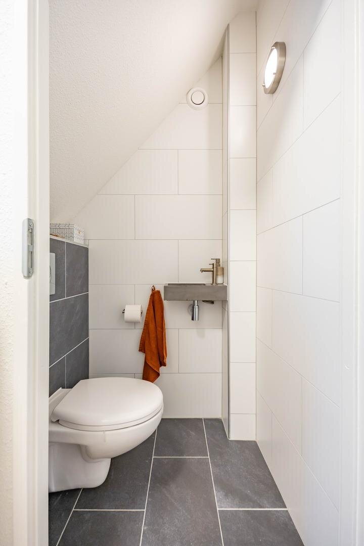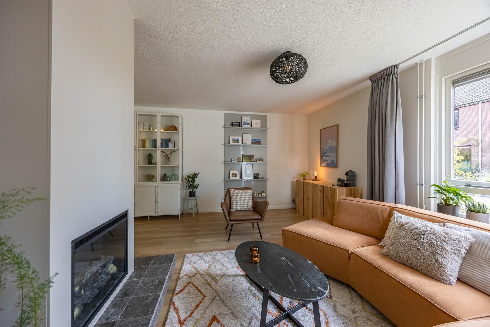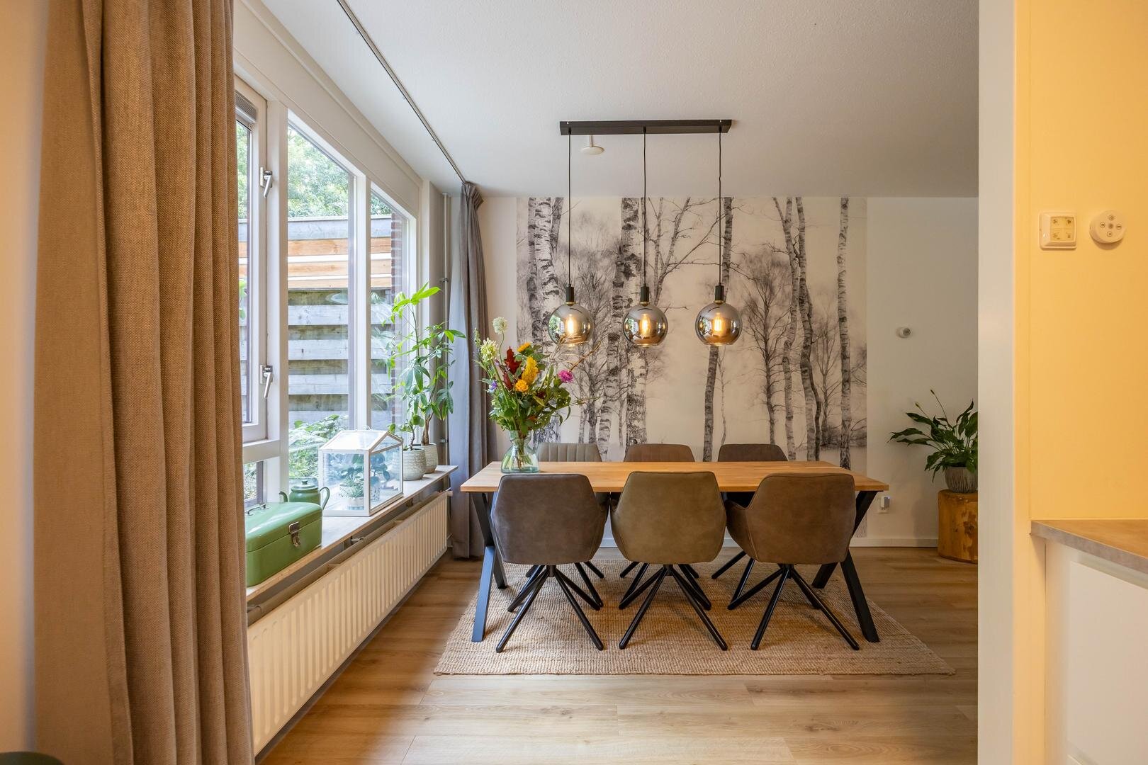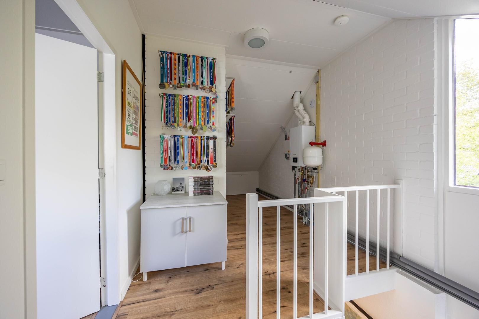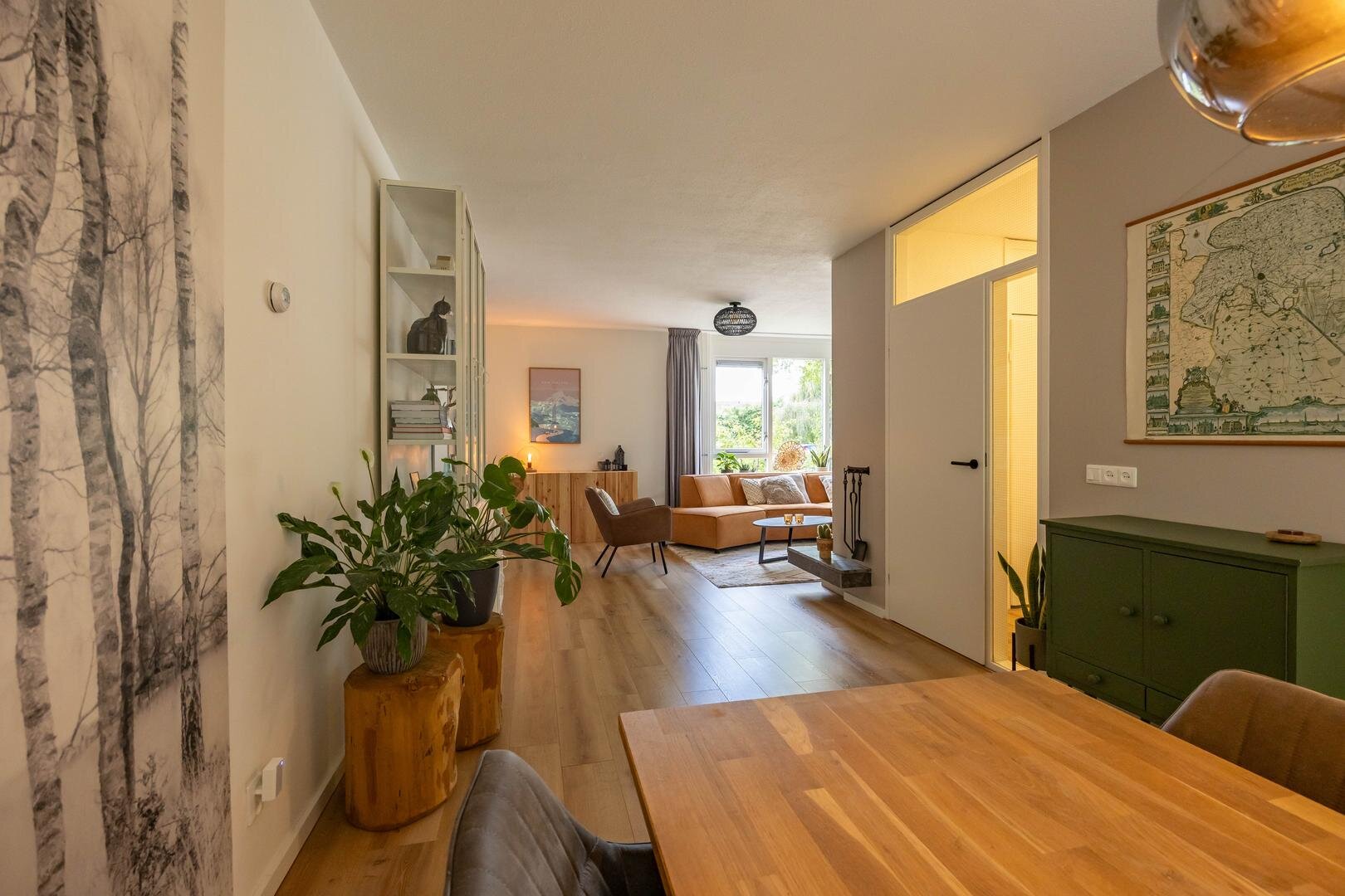 Begane grond: Entree/hal met trapopgang, meterkast, vaste kast en modern toilet. Vanuit de hal stap je de ruime en lichte woonkamer in van ca. 44 m², voorzien van een sfeervolle laminaatvloer en strakke wandafwerking. Aan de voorzijde bevindt zich het zitgedeelte met een elektrische sfeerhaard en de mogelijkheid om een houtkachel terug te plaatsen. Aan de achterzijde is het eetgedeelte, grenzend aan de open keuken. Via de keuken is er toegang tot de bijkeuken met wasmachineaansluiting. De moderne keuken is uitgerust met diverse inbouwapparatuur, waaronder een 4-pits inductiekookplaat, oven, koel-vriescombinatie, vaatwasser en afzuigkap. De aangebouwde garage is bereikbaar via de bijkeuken én vanaf de oprit.Eerste verdieping: Vanaf de overloop zijn alle vertrekken op deze verdieping toegankelijk. Aan de voorzijde bevinden zich twee slaapkamers van één van ca. 12 m² en één slaapkamer van ca. 10 m² met een praktische kastenwand. Aan de achterzijde ligt een royale slaapkamer van ca. 15 m². De moderne badkamer is voorzien van een ruime inloopdouche, een wastafelmeubel en een tweede toilet. Via de overloop is er toegang tot de trap naar de tweede verdieping.Tweede verdieping: Op de overloop bevinden zich de CV-opstelling en toegang tot een ruime slaapkamer van ca. 13 m², met extra bergruimte achter de knieschotten.De groene achtertuin ligt op het noordoosten en biedt volop rust en privacy, een fijne plek om tot jezelf te komen.* stijlvolle en instapklare gezinswoning