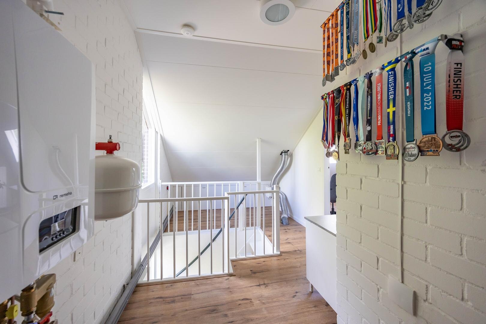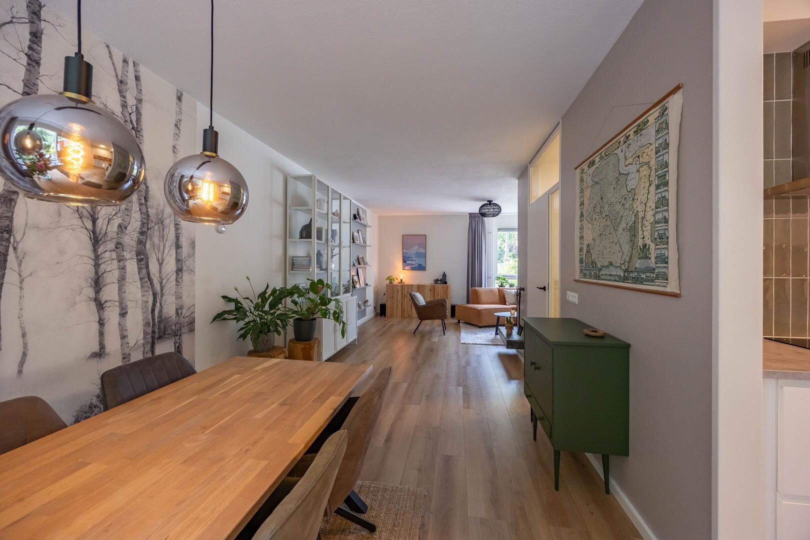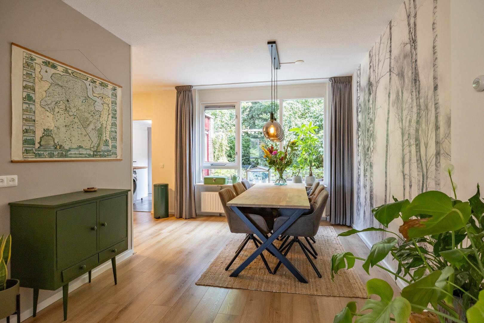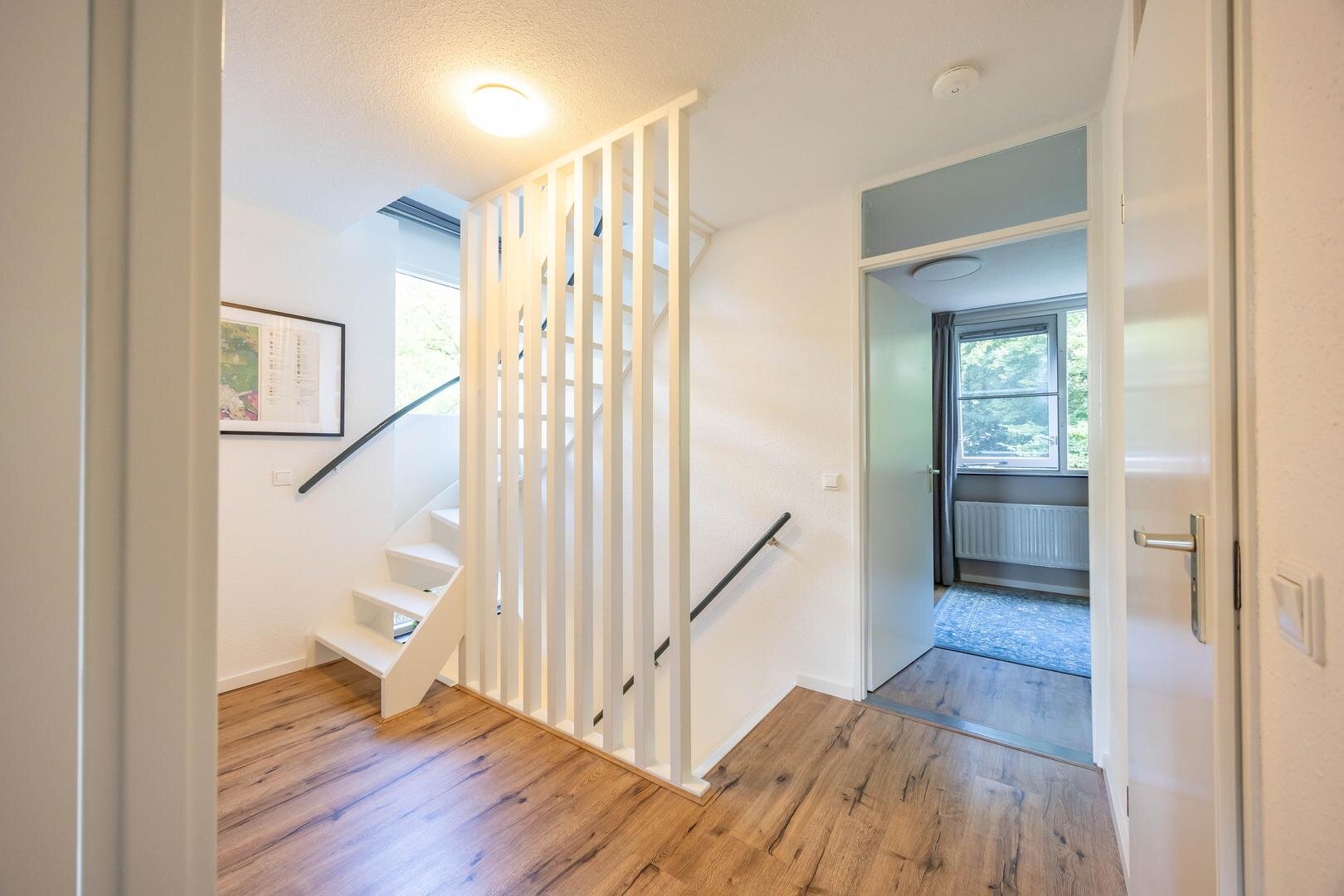 Begane grond: Entree/hal met trapopgang, meterkast, vaste kast en modern toilet. Vanuit de hal stap je de ruime en lichte woonkamer in van ca. 44 m², voorzien van een sfeervolle laminaatvloer en strakke wandafwerking. Aan de voorzijde bevindt zich het zitgedeelte met een elektrische sfeerhaard en de mogelijkheid om een houtkachel terug te plaatsen. Aan de achterzijde is het eetgedeelte, grenzend aan de open keuken. Via de keuken is er toegang tot de bijkeuken met wasmachineaansluiting. De moderne keuken is uitgerust met diverse inbouwapparatuur, waaronder een 4-pits inductiekookplaat, oven, koel-vriescombinatie, vaatwasser en afzuigkap. De aangebouwde garage is bereikbaar via de bijkeuken én vanaf de oprit.Eerste verdieping: Vanaf de overloop zijn alle vertrekken op deze verdieping toegankelijk. Aan de voorzijde bevinden zich twee slaapkamers van één van ca. 12 m² en één slaapkamer van ca. 10 m² met een praktische kastenwand. Aan de achterzijde ligt een royale slaapkamer van ca. 15 m². De moderne badkamer is voorzien van een ruime inloopdouche, een wastafelmeubel en een tweede toilet. Via de overloop is er toegang tot de trap naar de tweede verdieping.Tweede verdieping: Op de overloop bevinden zich de CV-opstelling en toegang tot een ruime slaapkamer van ca. 13 m², met extra bergruimte achter de knieschotten.De groene achtertuin ligt op het noordoosten en biedt volop rust en privacy, een fijne plek om tot jezelf te komen.* stijlvolle en instapklare gezinswoning