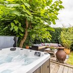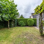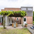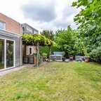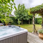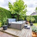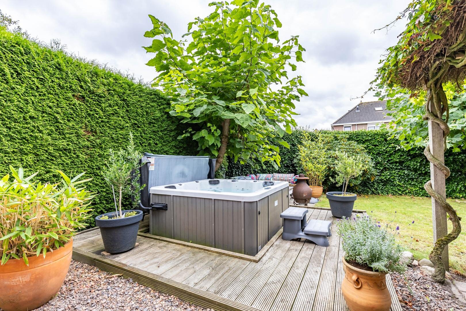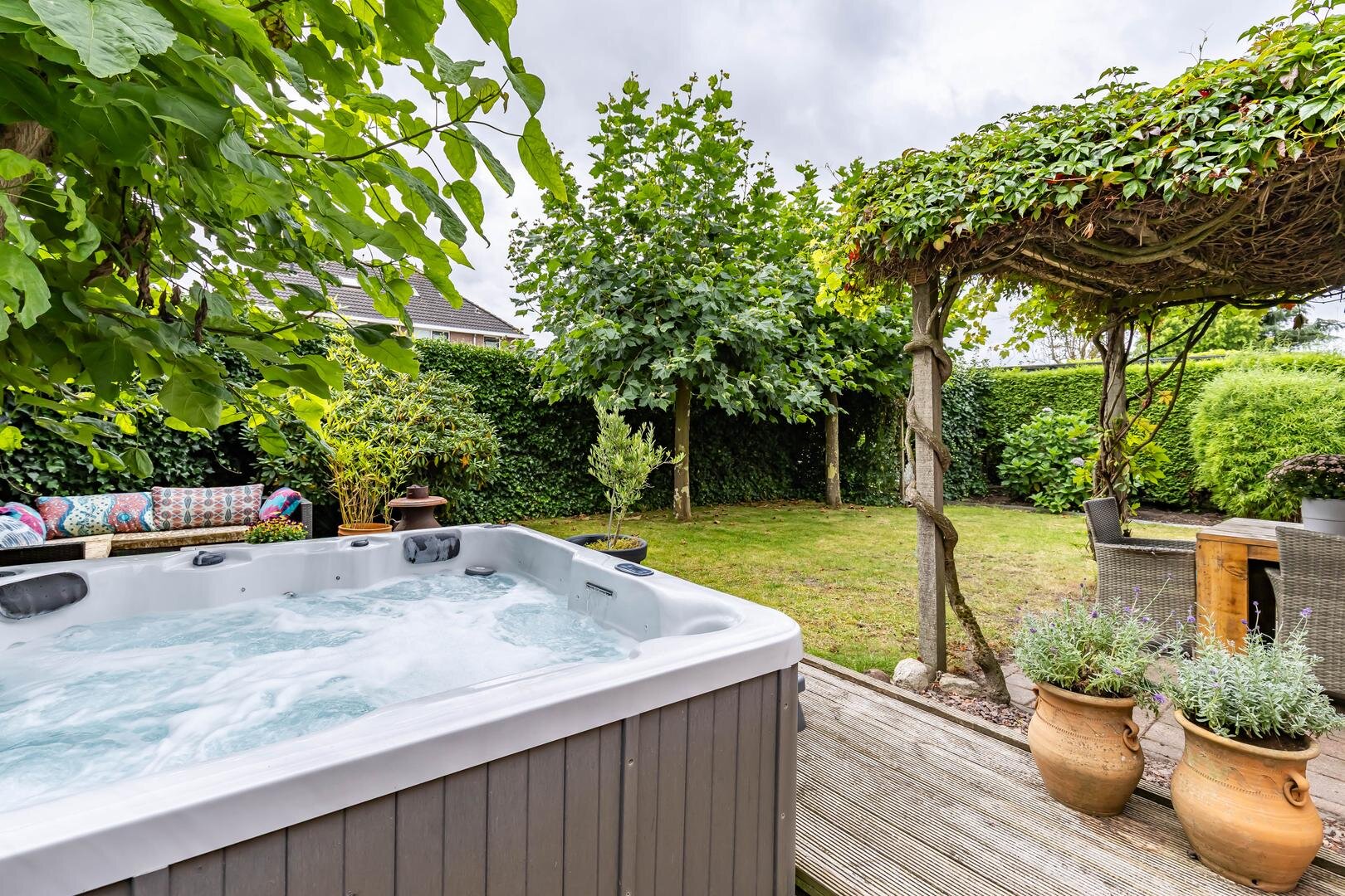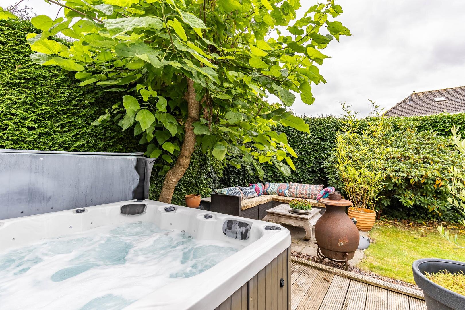 Het geheel is groenrijk en fraai aangelegd met een terras met pergola begroeid met een mooie druif en een verhoogd houten terras waarop de jacuzzi staat. In de hoek van de tuin een fijne zit en dankzij de hoge hagen geniet je hier volop privacy. De tuin grenst aan een watertje aan de achterzijde en daar is ook nog een zitje gerealiseerd.* gebouwd in 2002, uitgebouwd in 2015 en opgebouwd in 2017