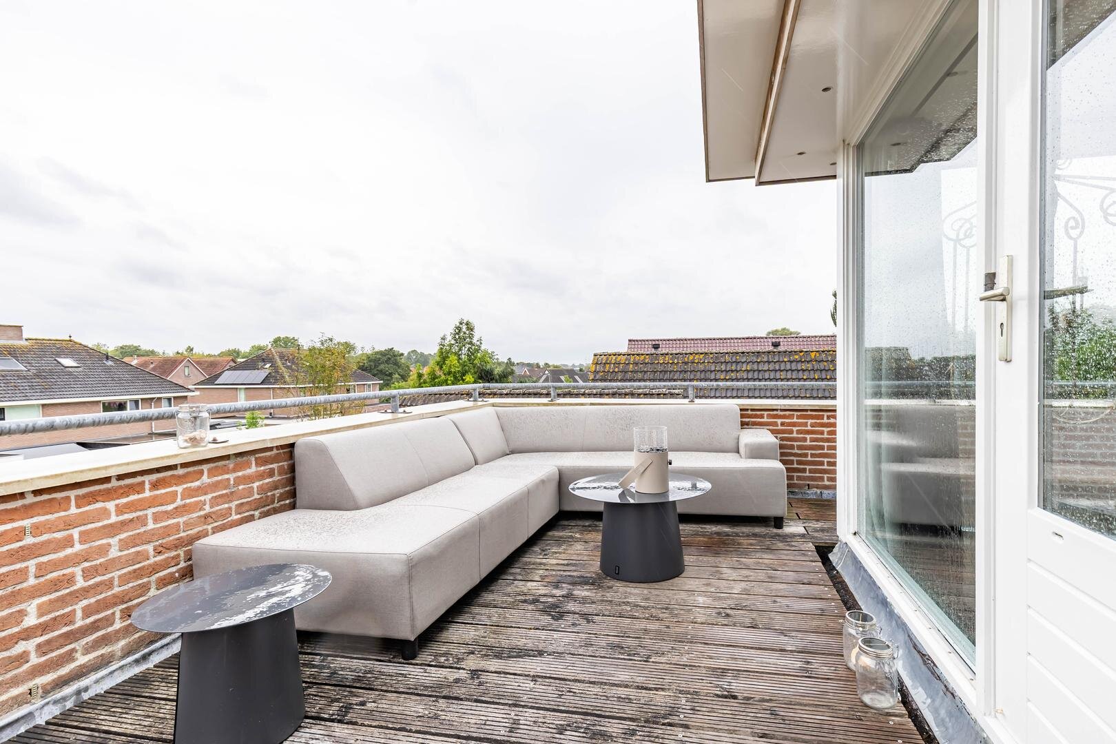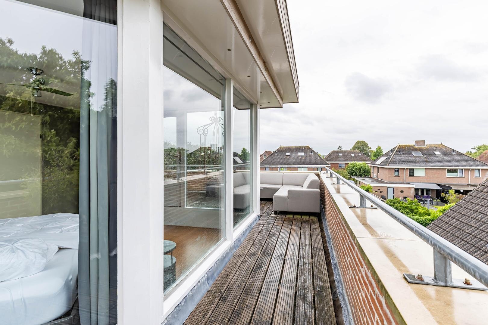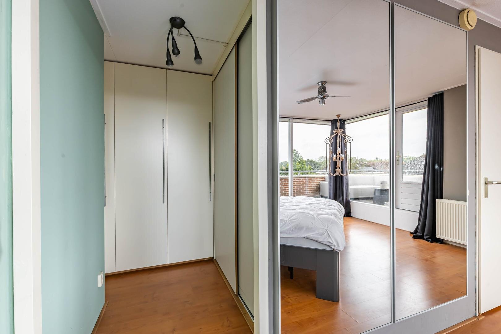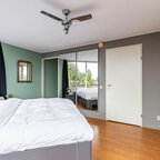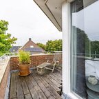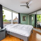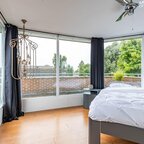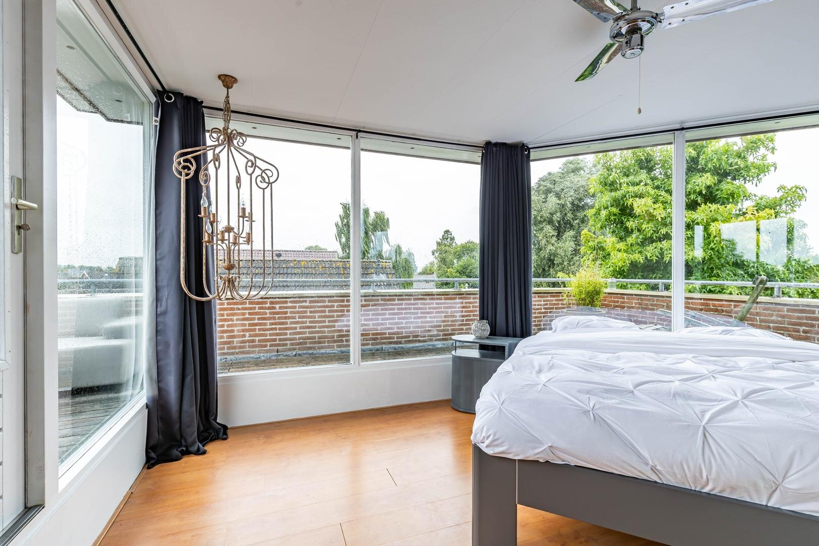 op de bovenste woonlaag vinden we een overloop met aangrenzend de ruime inloop kast v.v. vaste kasten en er is nog een ruime slaapkamer aanwezig van ca. 15m², badend in het licht dankzij de raampartijen rondom én met toegang tot het dakterras van ca. 24m². Hier heb je volop ruimte en prachtig uitzicht over de wijk.Naast de indrukwekkende leefruimte binnenshuis biedt ook de tuin – rondom het huis gelegen – veel woongenot. Met een perceel van ca. 434 m² heb je de hele dag door keuze uit zon of schaduw.