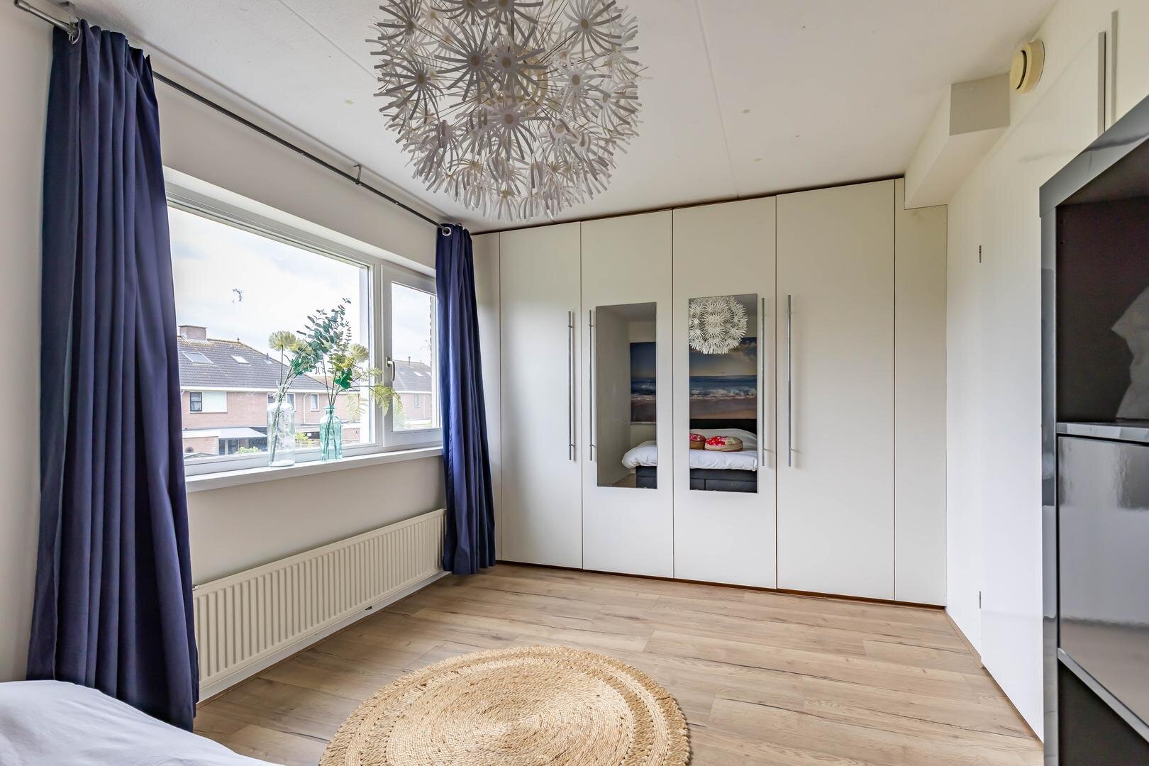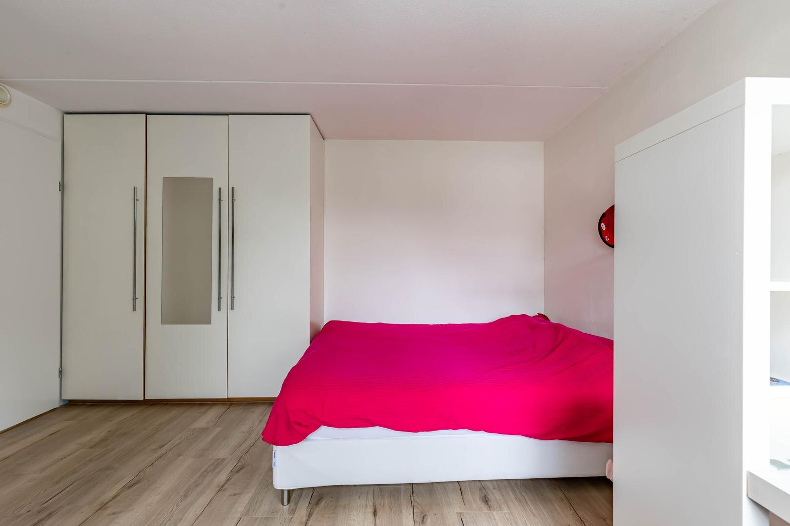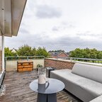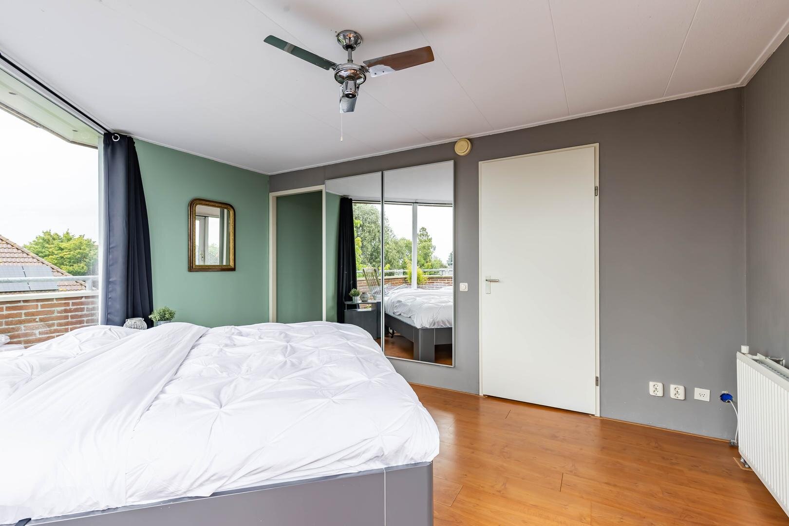 op de bovenste woonlaag vinden we een overloop met aangrenzend de ruime inloop kast v.v. vaste kasten en er is nog een ruime slaapkamer aanwezig van ca. 15m², badend in het licht dankzij de raampartijen rondom én met toegang tot het dakterras van ca. 24m². Hier heb je volop ruimte en prachtig uitzicht over de wijk.Naast de indrukwekkende leefruimte binnenshuis biedt ook de tuin – rondom het huis gelegen – veel woongenot. Met een perceel van ca. 434 m² heb je de hele dag door keuze uit zon of schaduw.