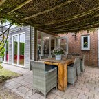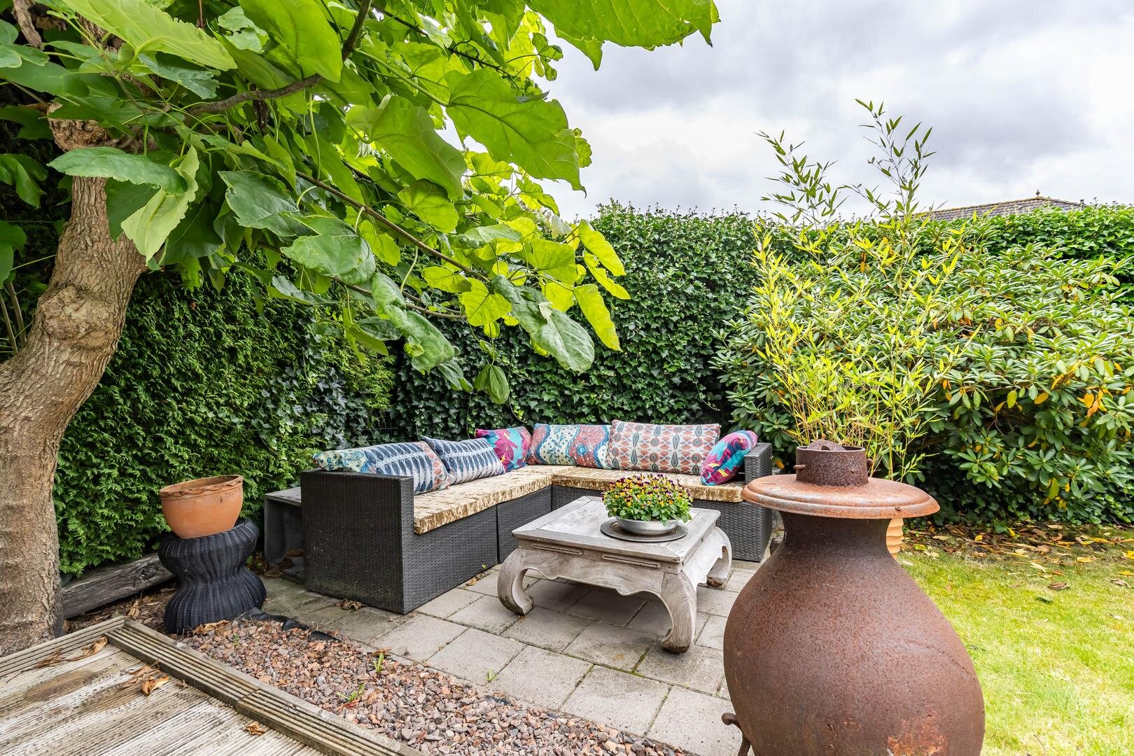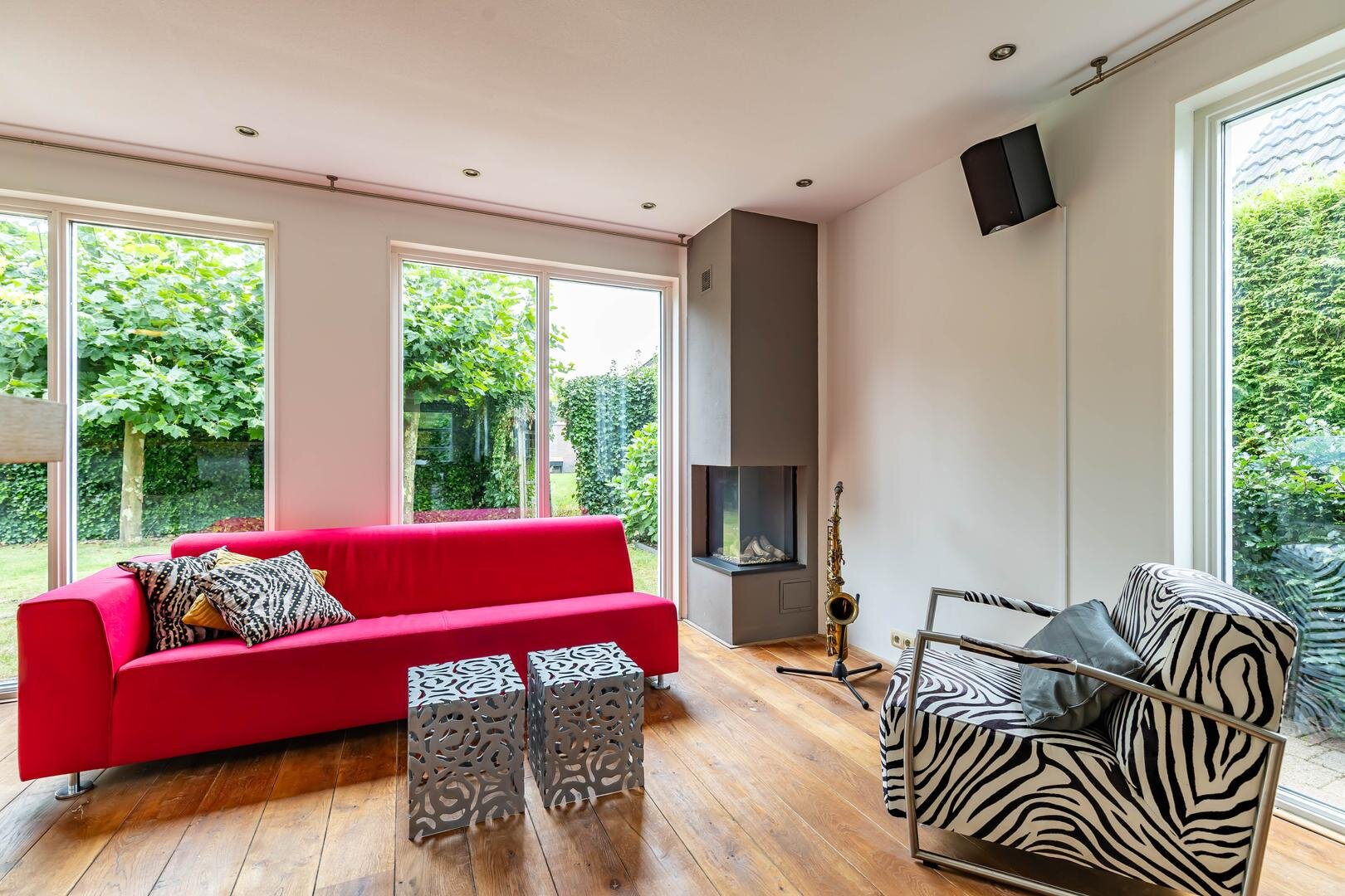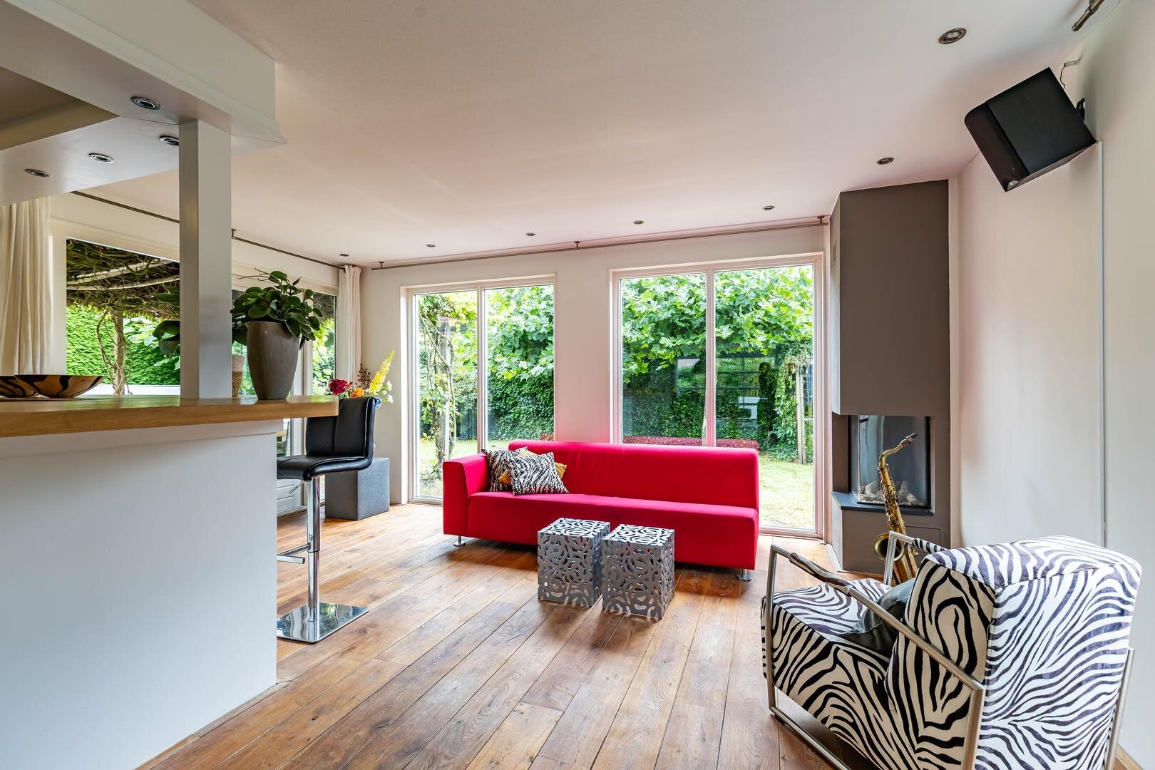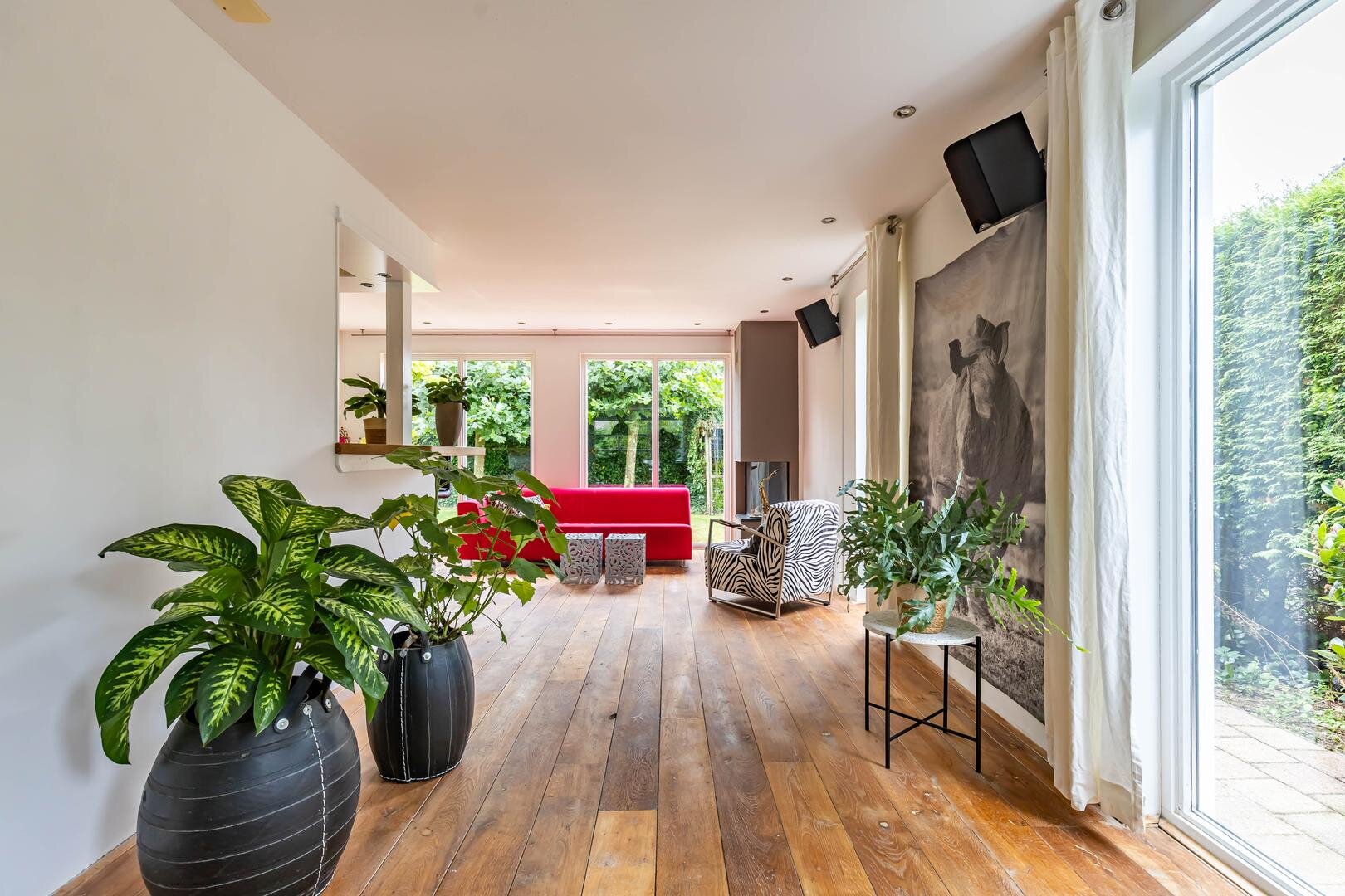In de hoek bevindt zich een haard, waardoor het ook in de koudere maanden een heerlijke plek is om te verblijven. Via openslaande deuren stap je direct de sfeervolle, groenrijke buitenruimte in.