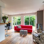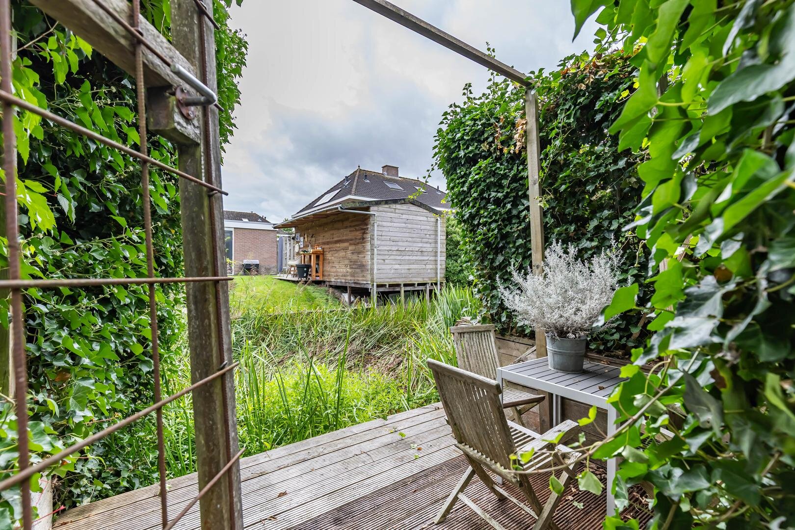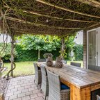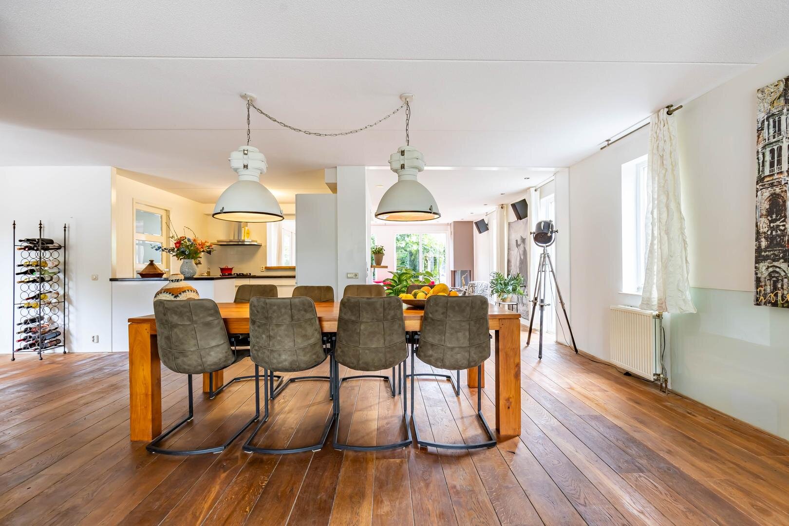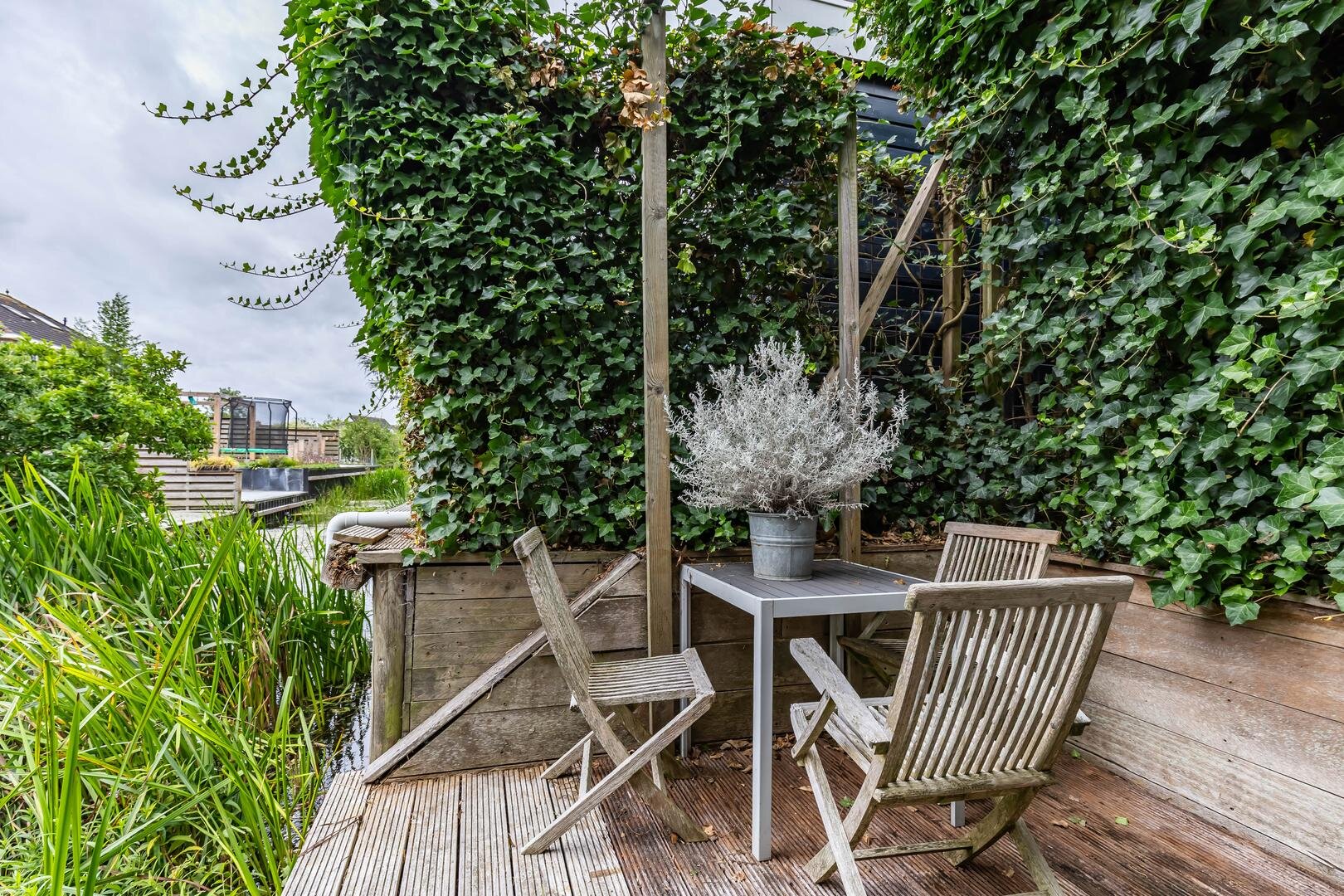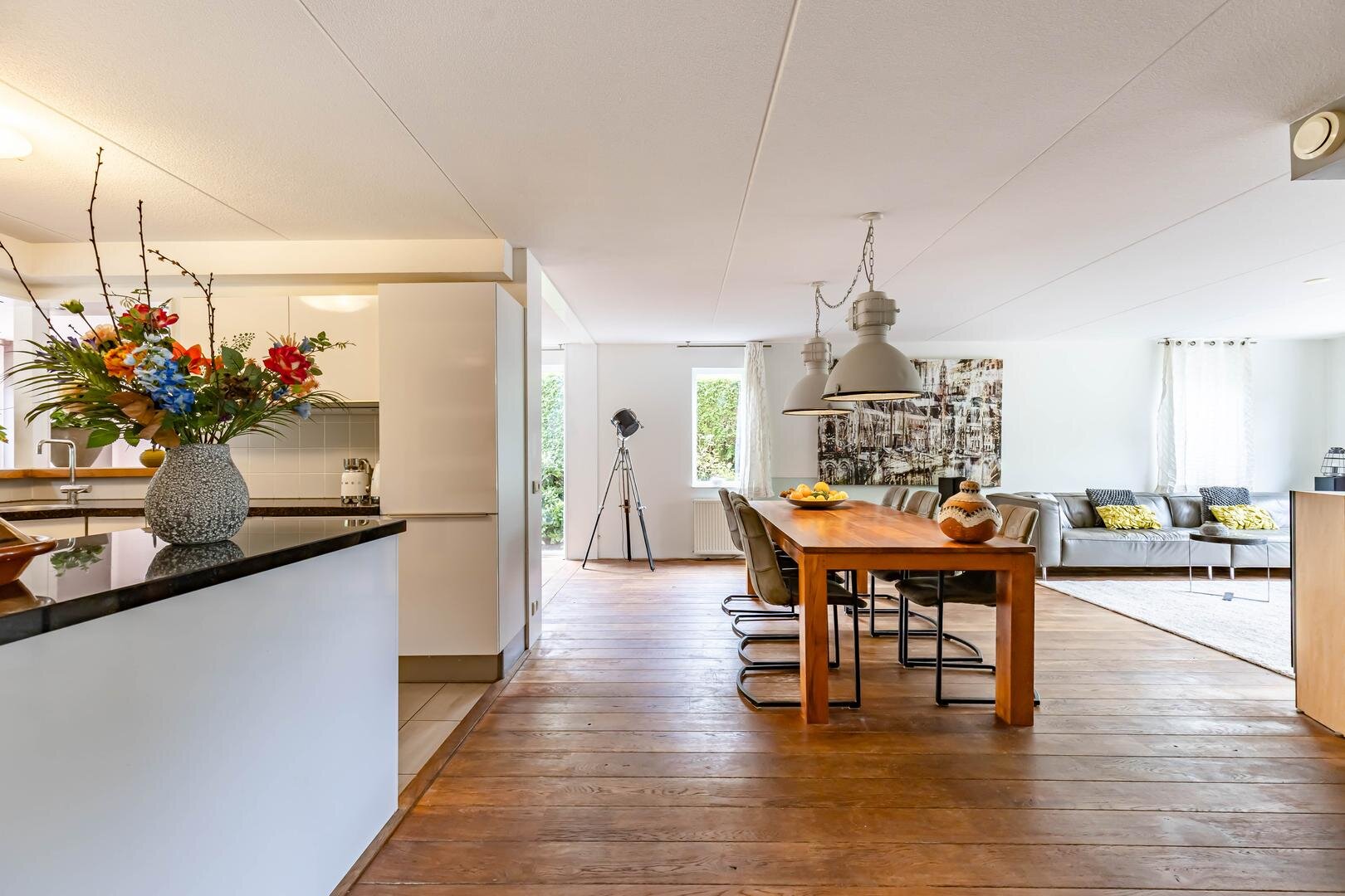 In de hoek bevindt zich een haard, waardoor het ook in de koudere maanden een heerlijke plek is om te verblijven. Via openslaande deuren stap je direct de sfeervolle, groenrijke buitenruimte in.