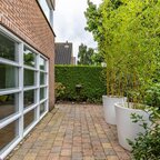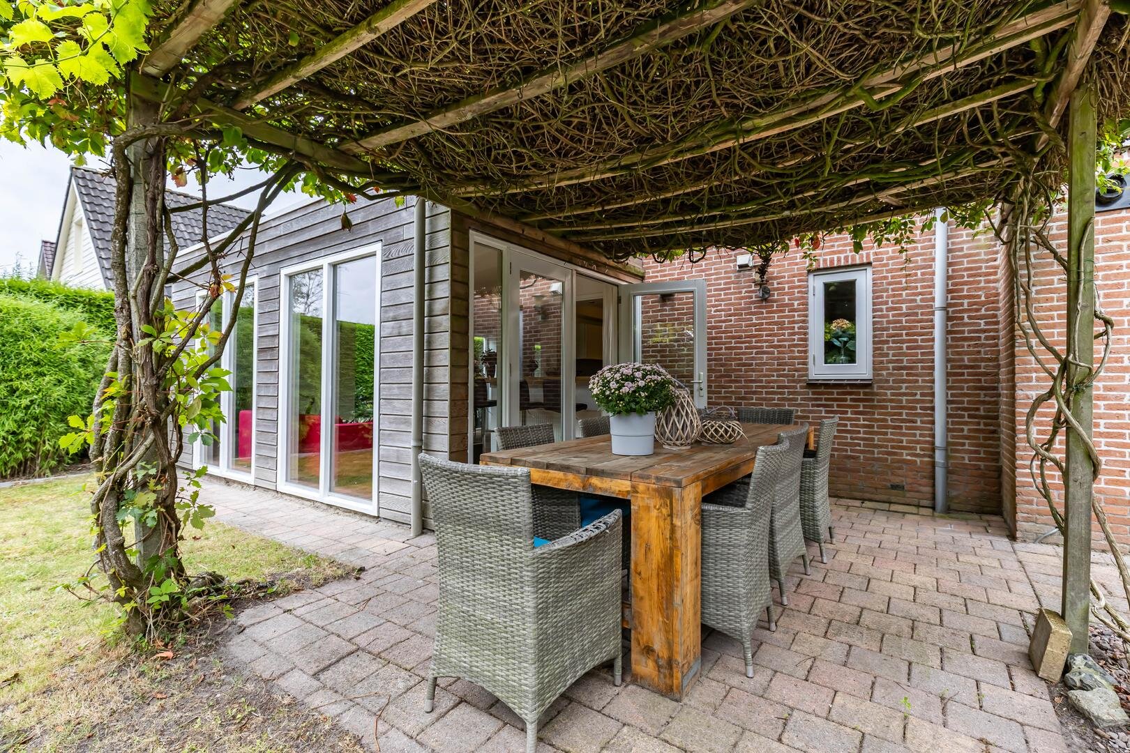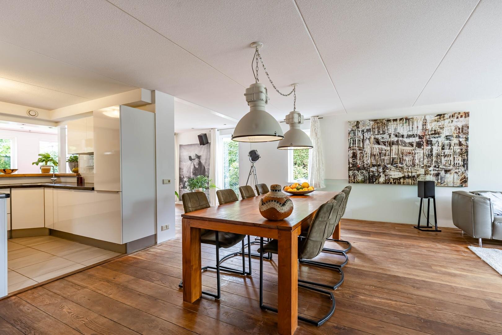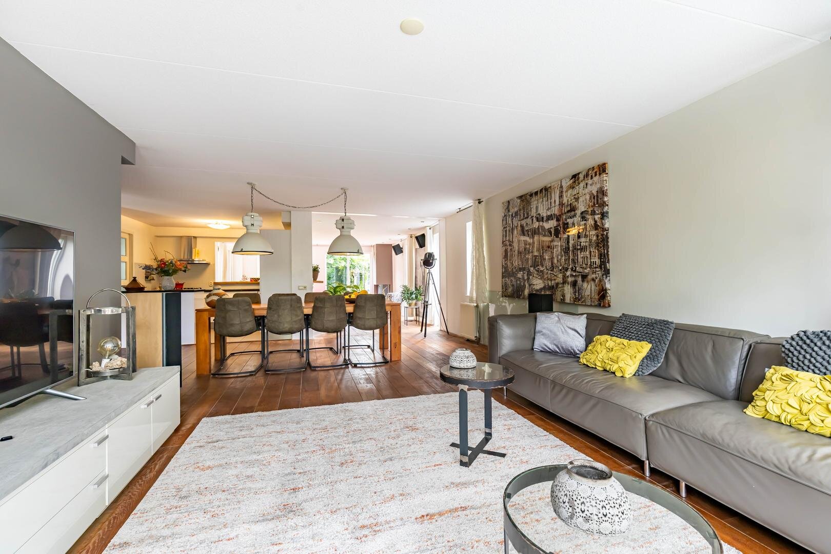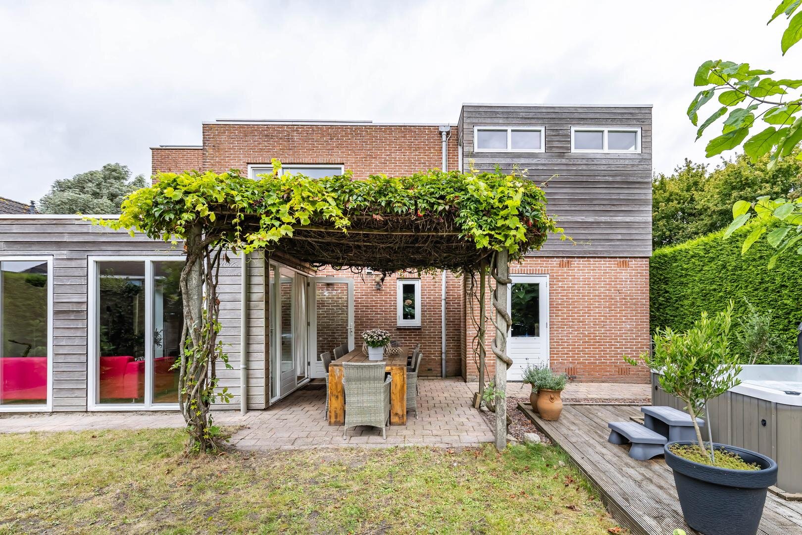 In de hoek bevindt zich een haard, waardoor het ook in de koudere maanden een heerlijke plek is om te verblijven. Via openslaande deuren stap je direct de sfeervolle, groenrijke buitenruimte in.