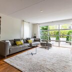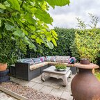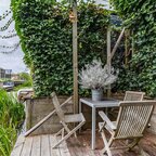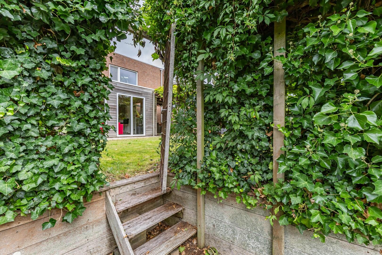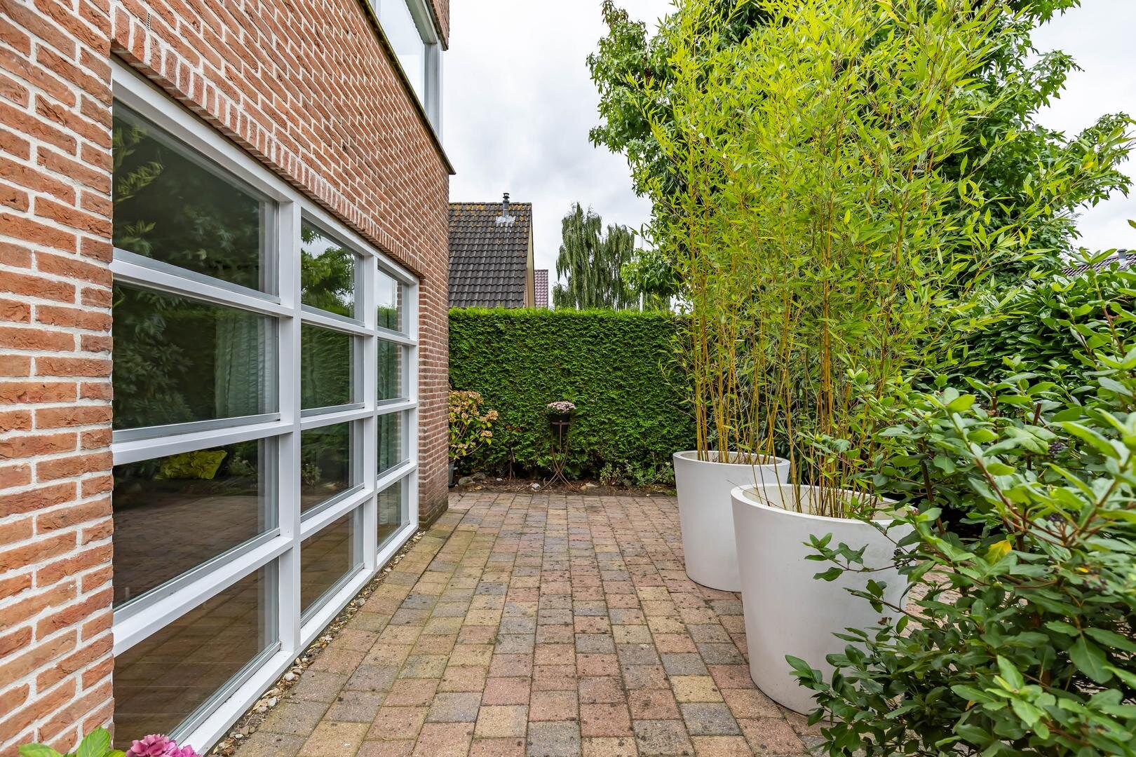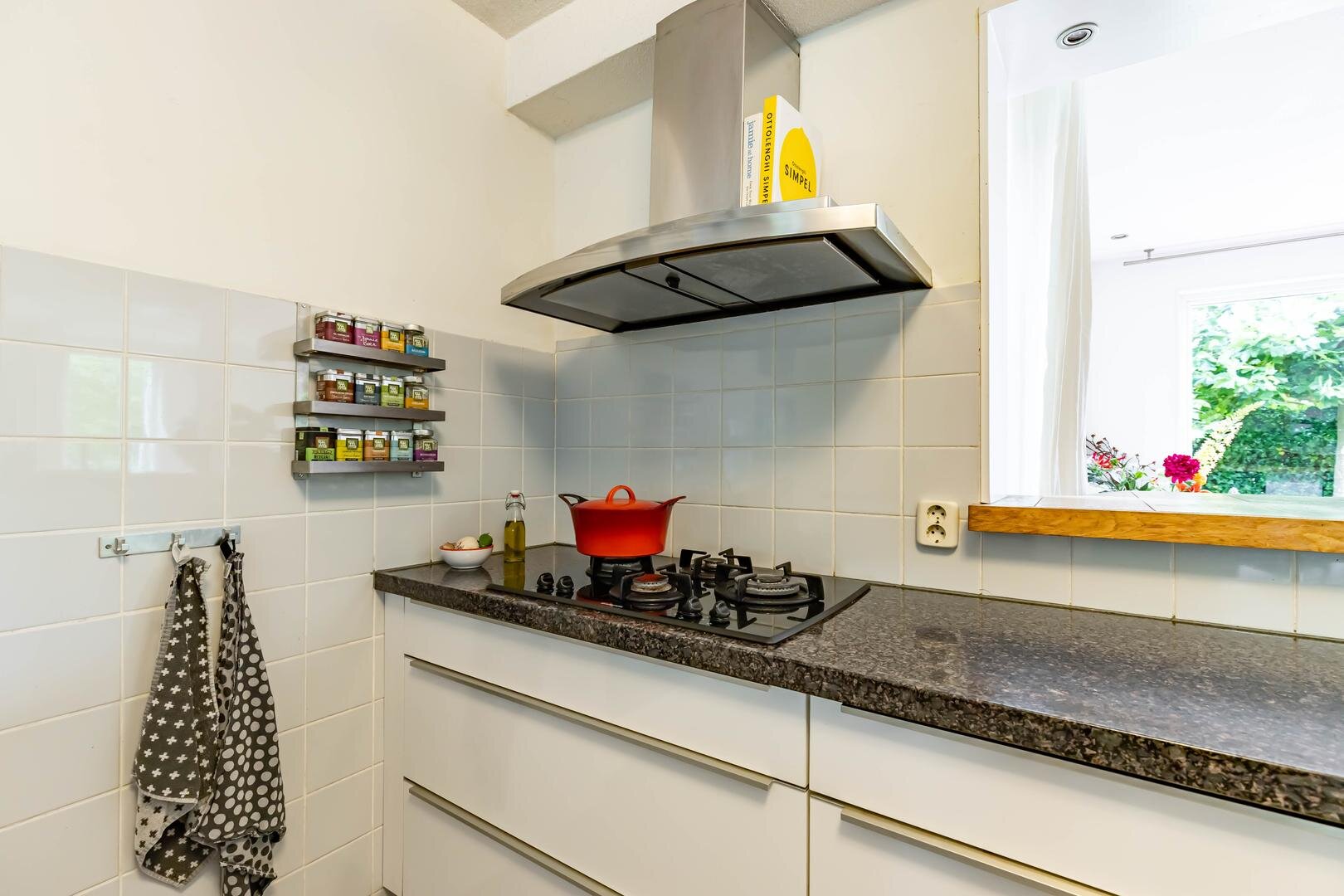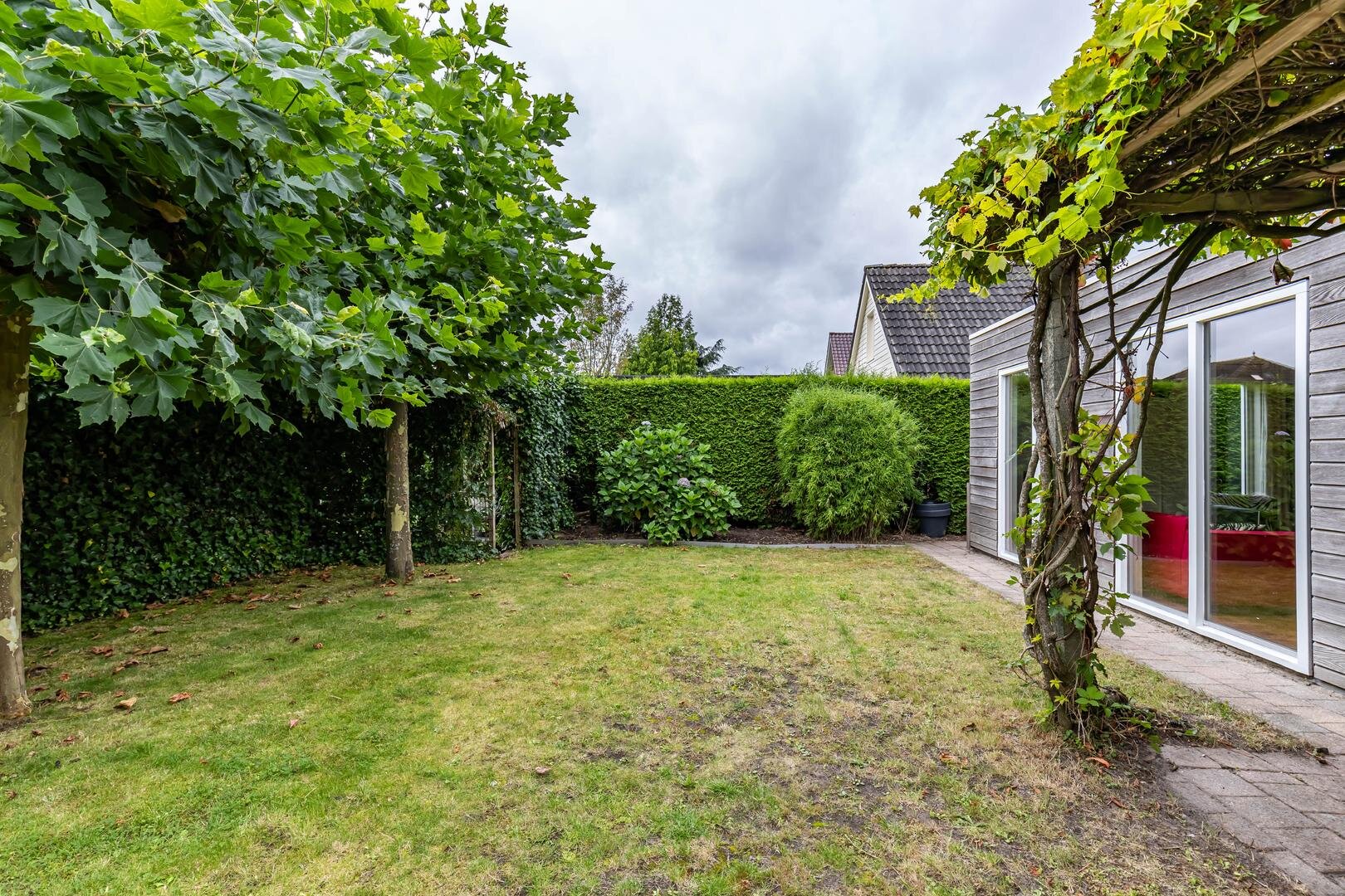In de hoek bevindt zich een haard, waardoor het ook in de koudere maanden een heerlijke plek is om te verblijven. Via openslaande deuren stap je direct de sfeervolle, groenrijke buitenruimte in.