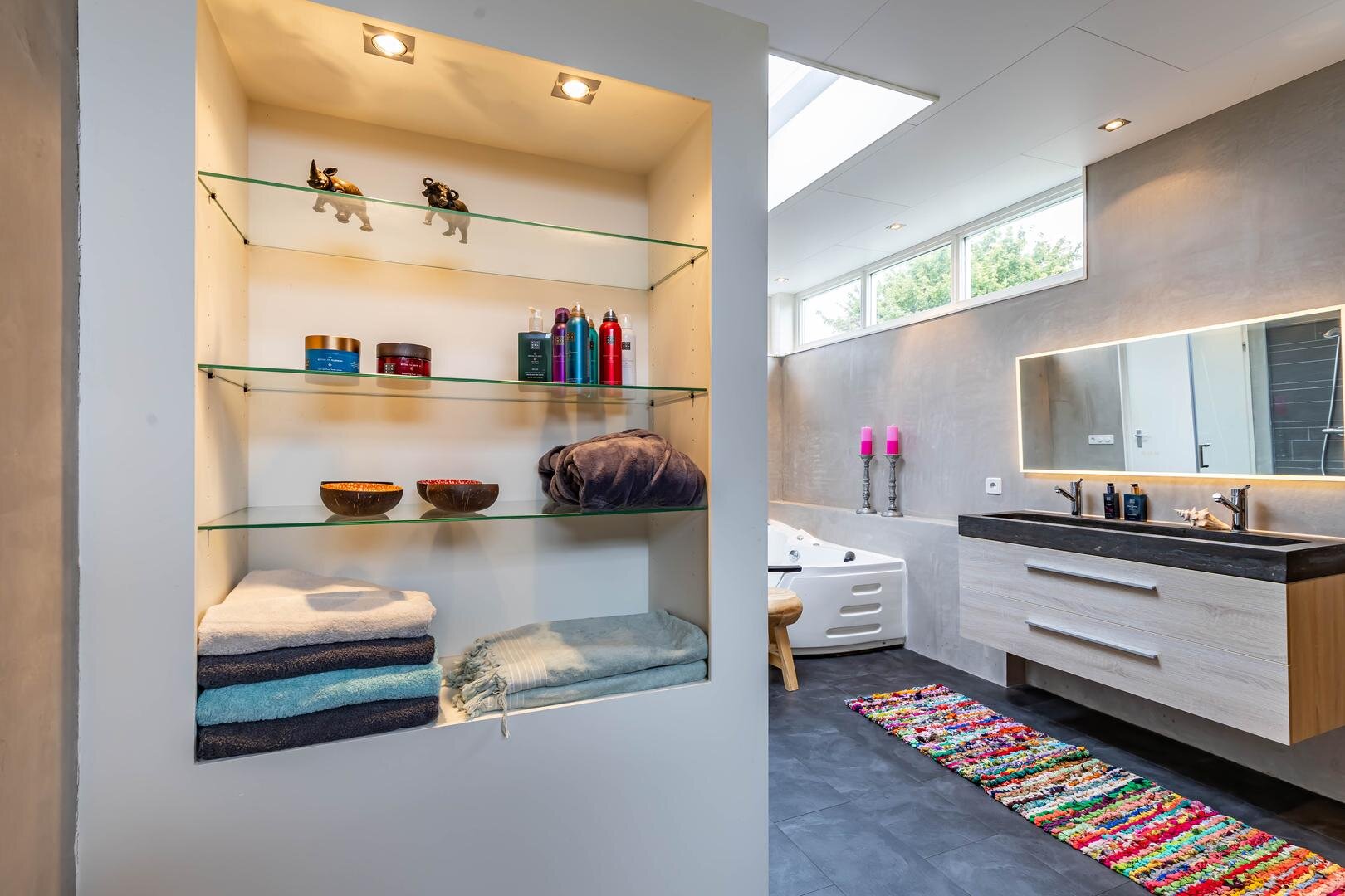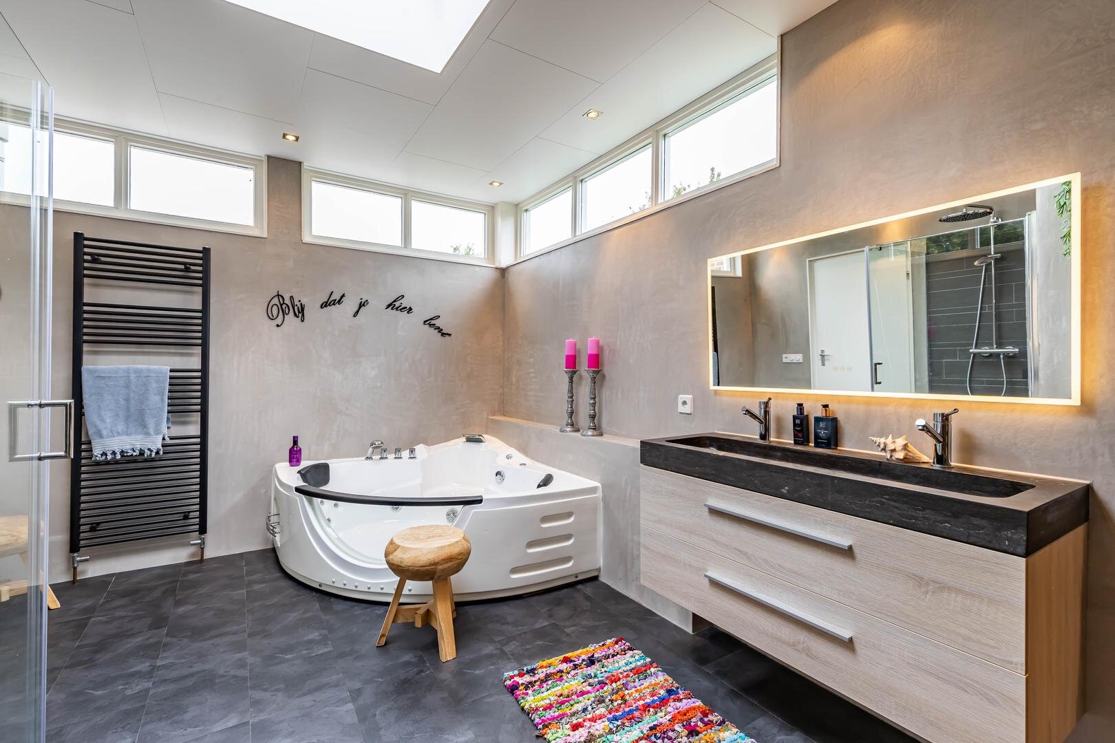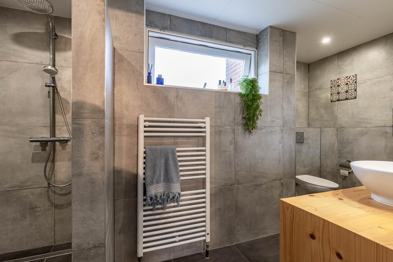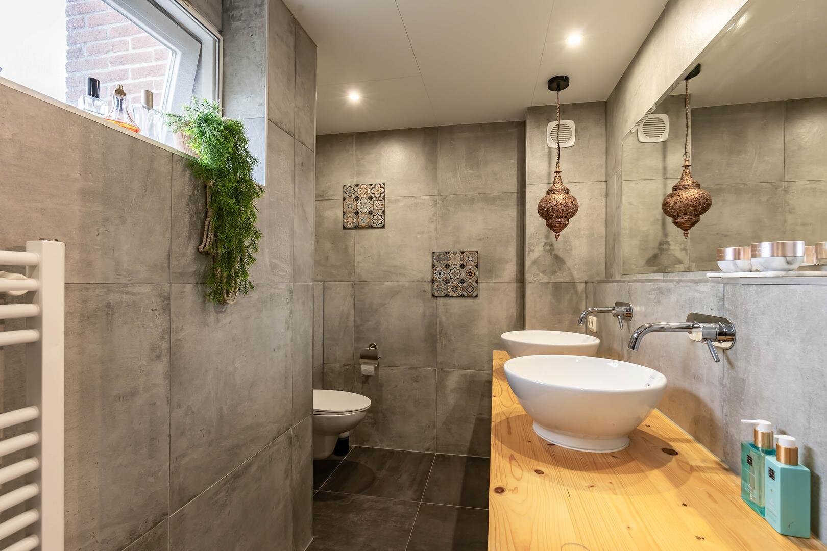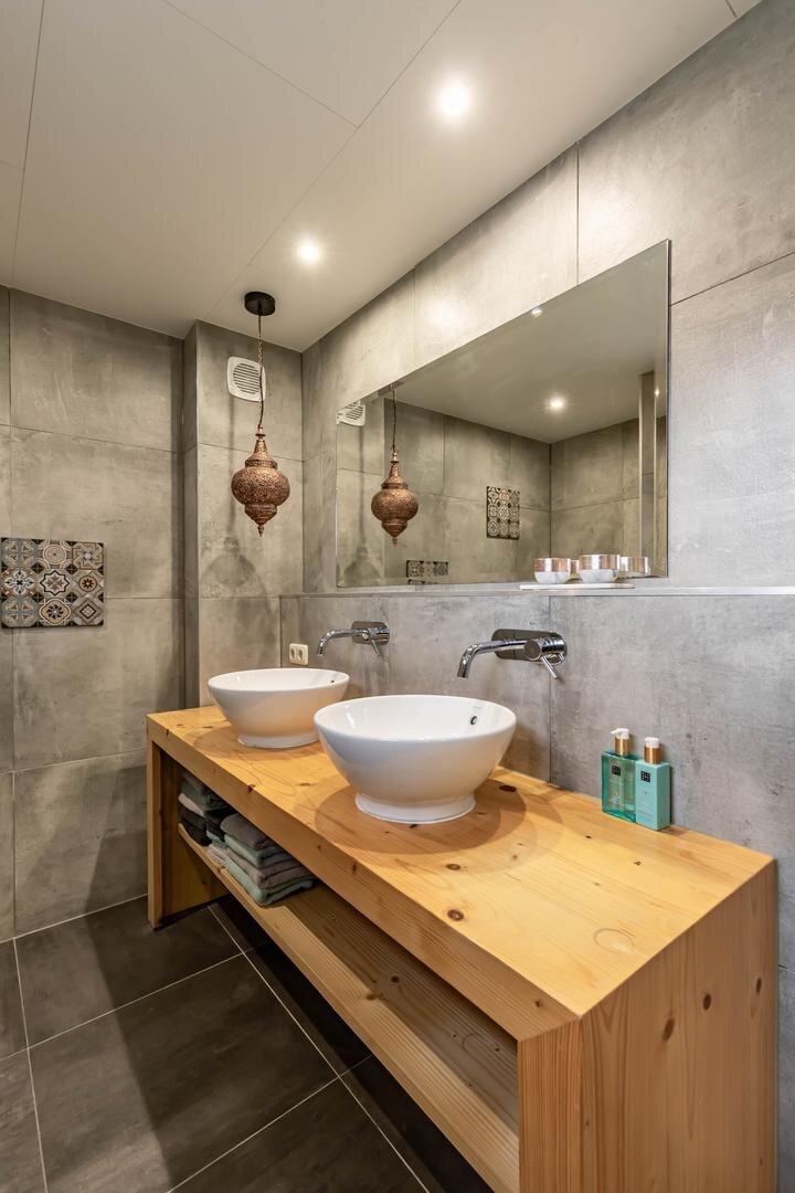 De moderne badkamer (2017) is stijlvol uitgevoerd met betonlook tegels, houten wastafelmeubel met dubbele waskommen, inloopdouche, designradiator en tweede toilet.