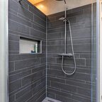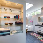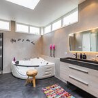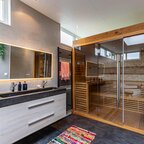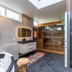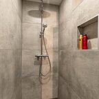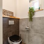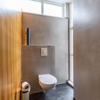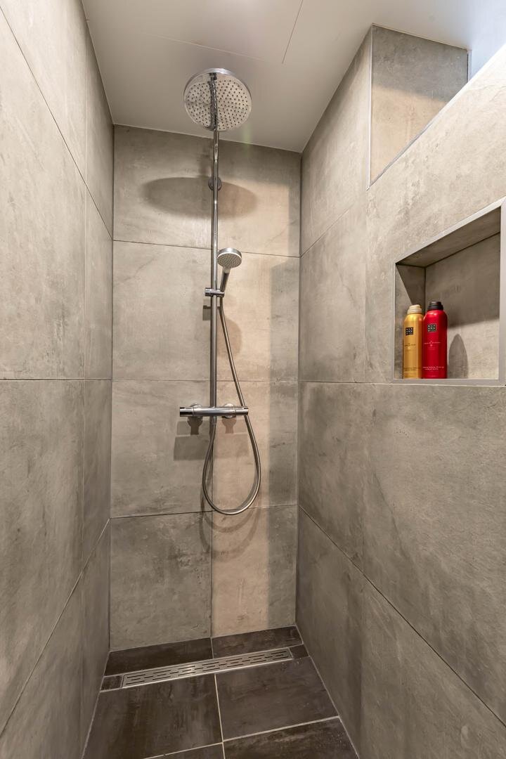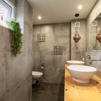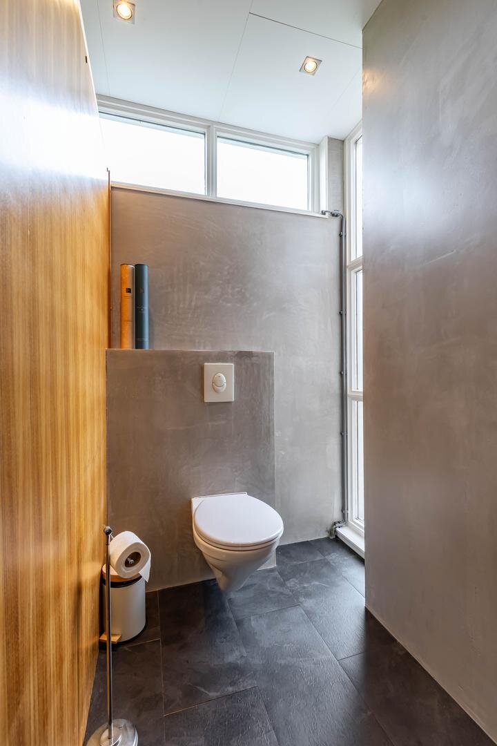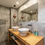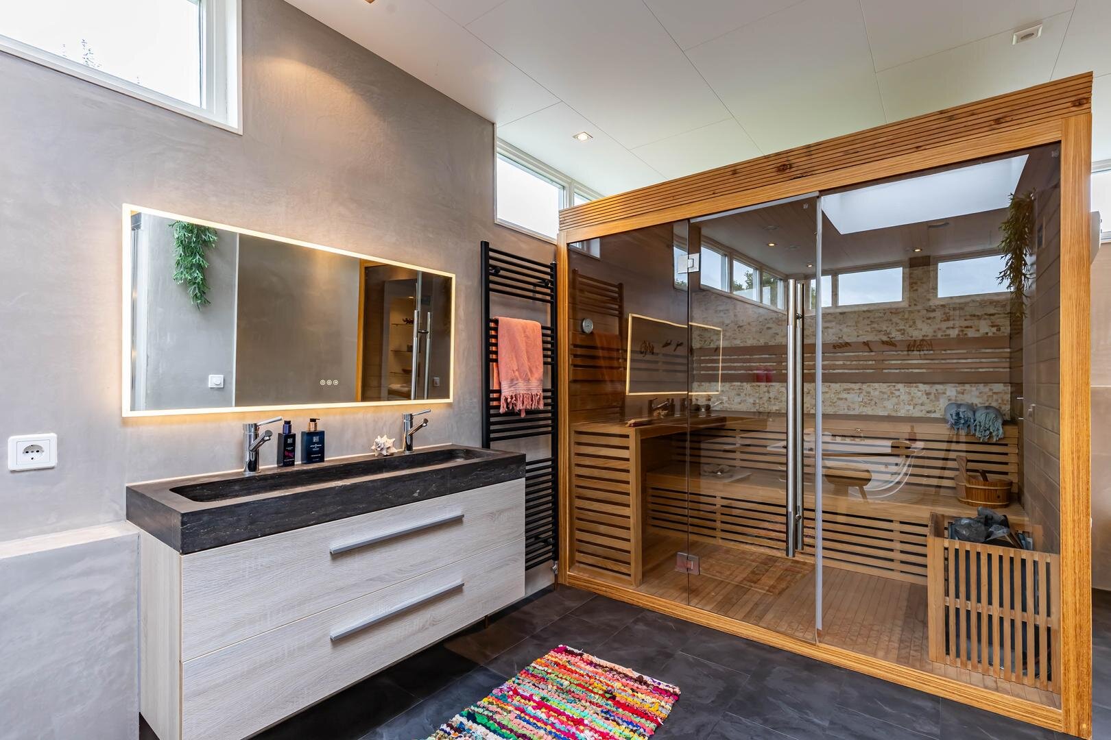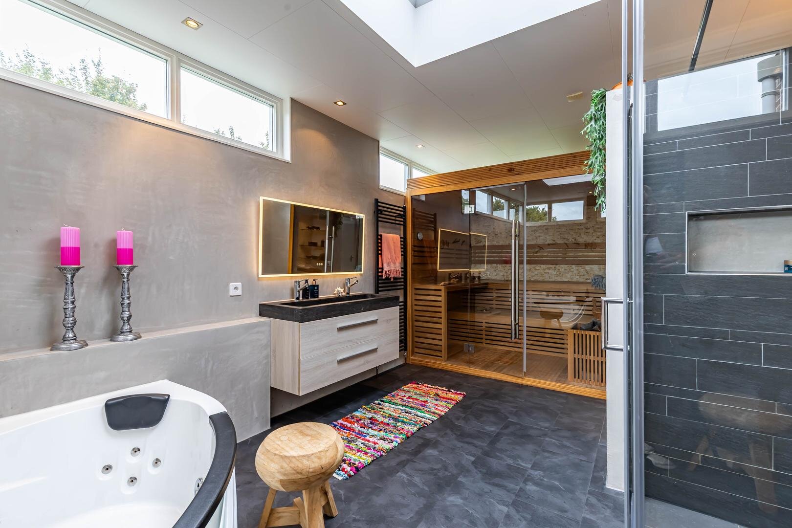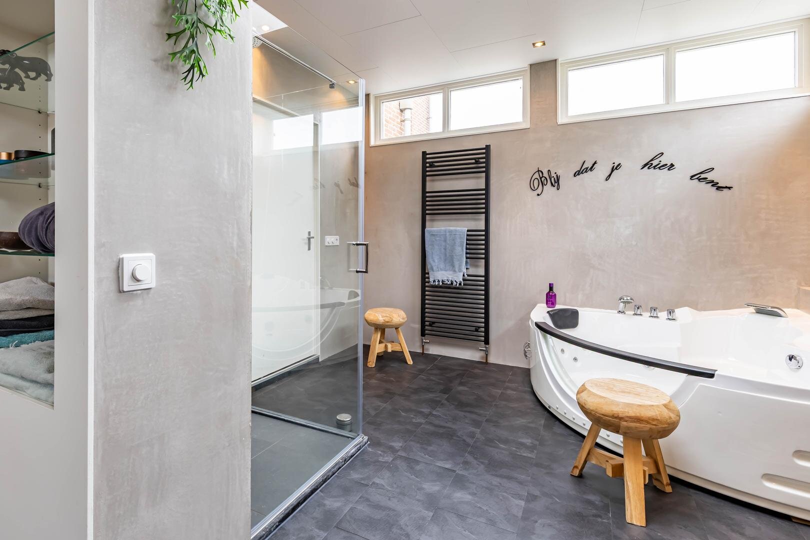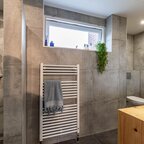 De moderne badkamer (2017) is stijlvol uitgevoerd met betonlook tegels, houten wastafelmeubel met dubbele waskommen, inloopdouche, designradiator en tweede toilet.