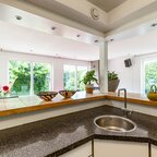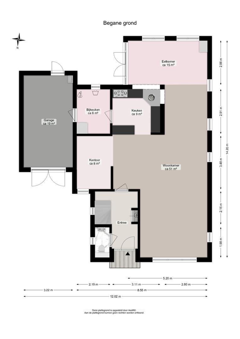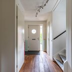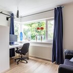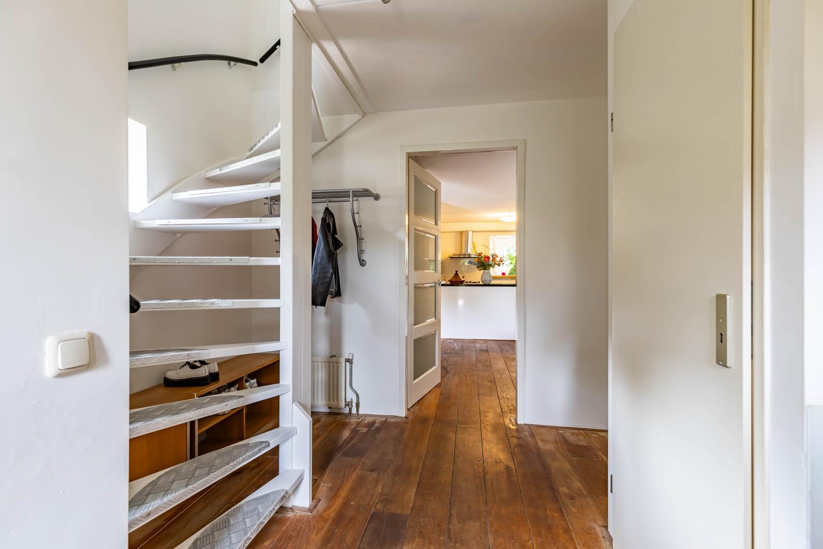 Entree/hal met modern toilet, garderobe en trapopgang naar boven. De riante woonkamer van maar liefst 51 m² beschikt over veel lichtinval dankzij raampartijen aan de voor- en zijkant. Aan de zijkant bevindt zich een separate kantoorruimte van ca. 8 m². De open keuken (ca. 9 m²) werd in 2017 vernieuwd en staat in semi-open verbinding met de achtergelegen eetkamer/serre van ca. 15 m².