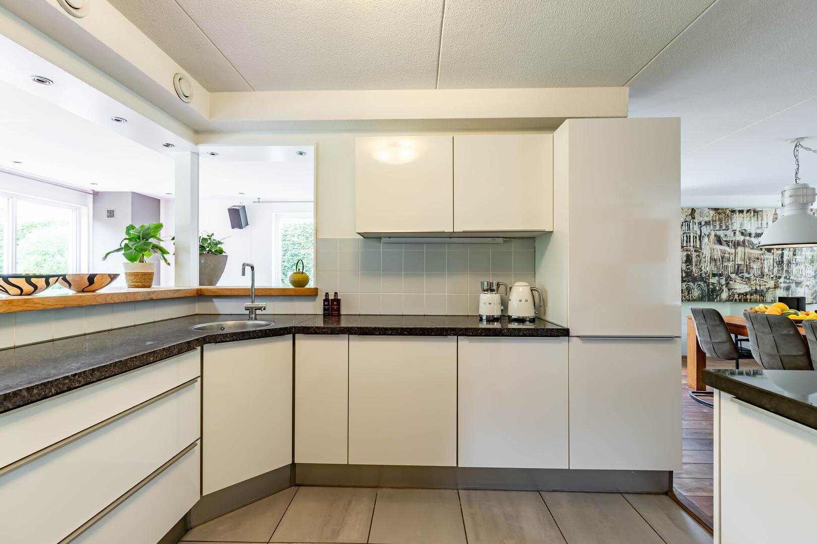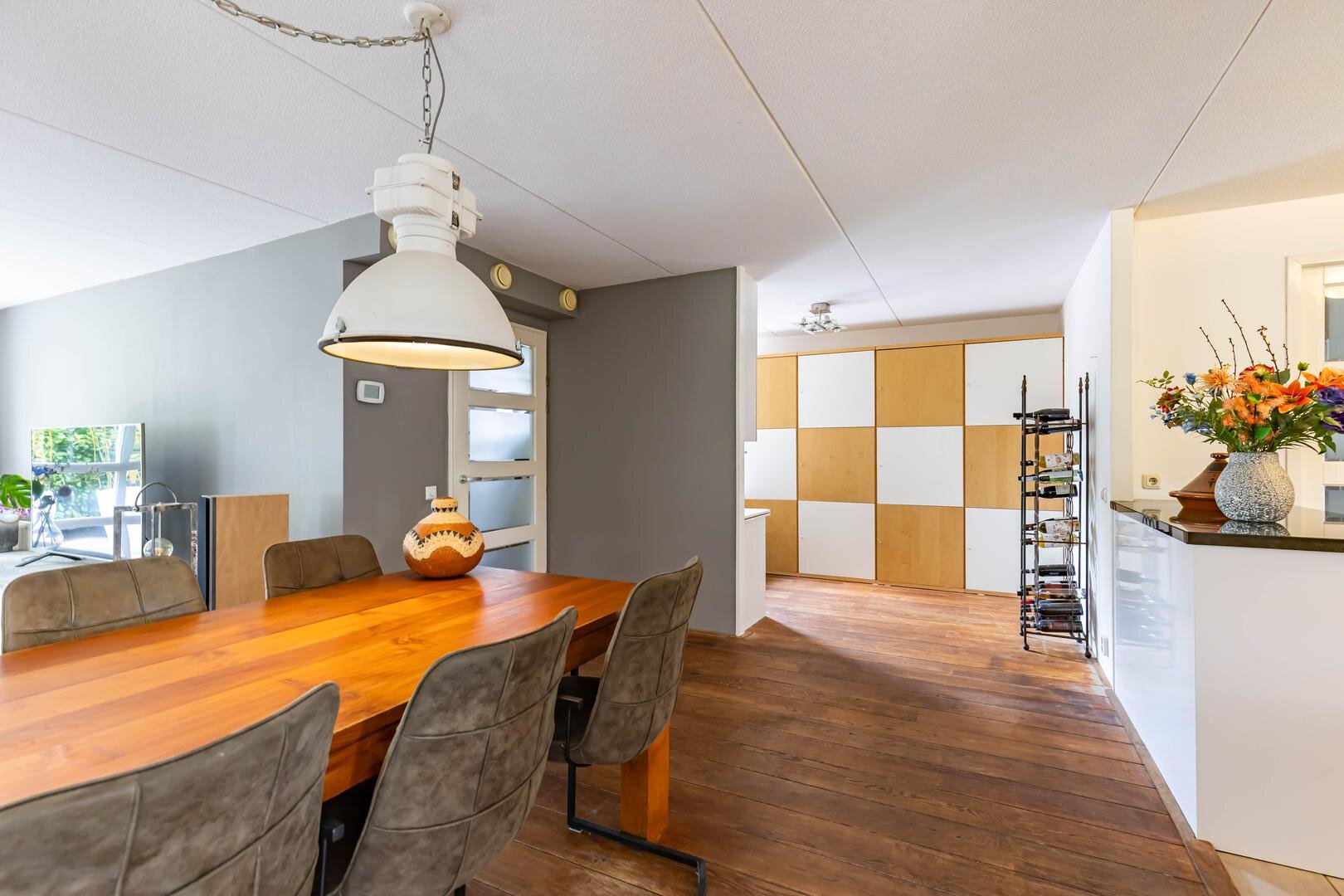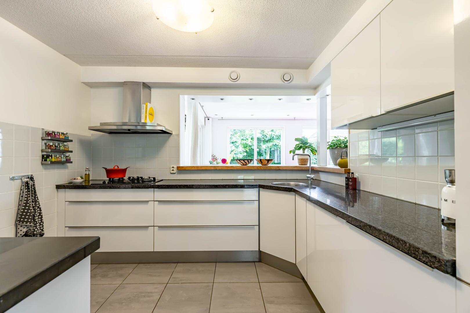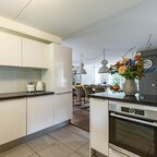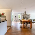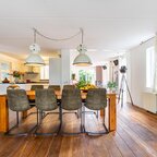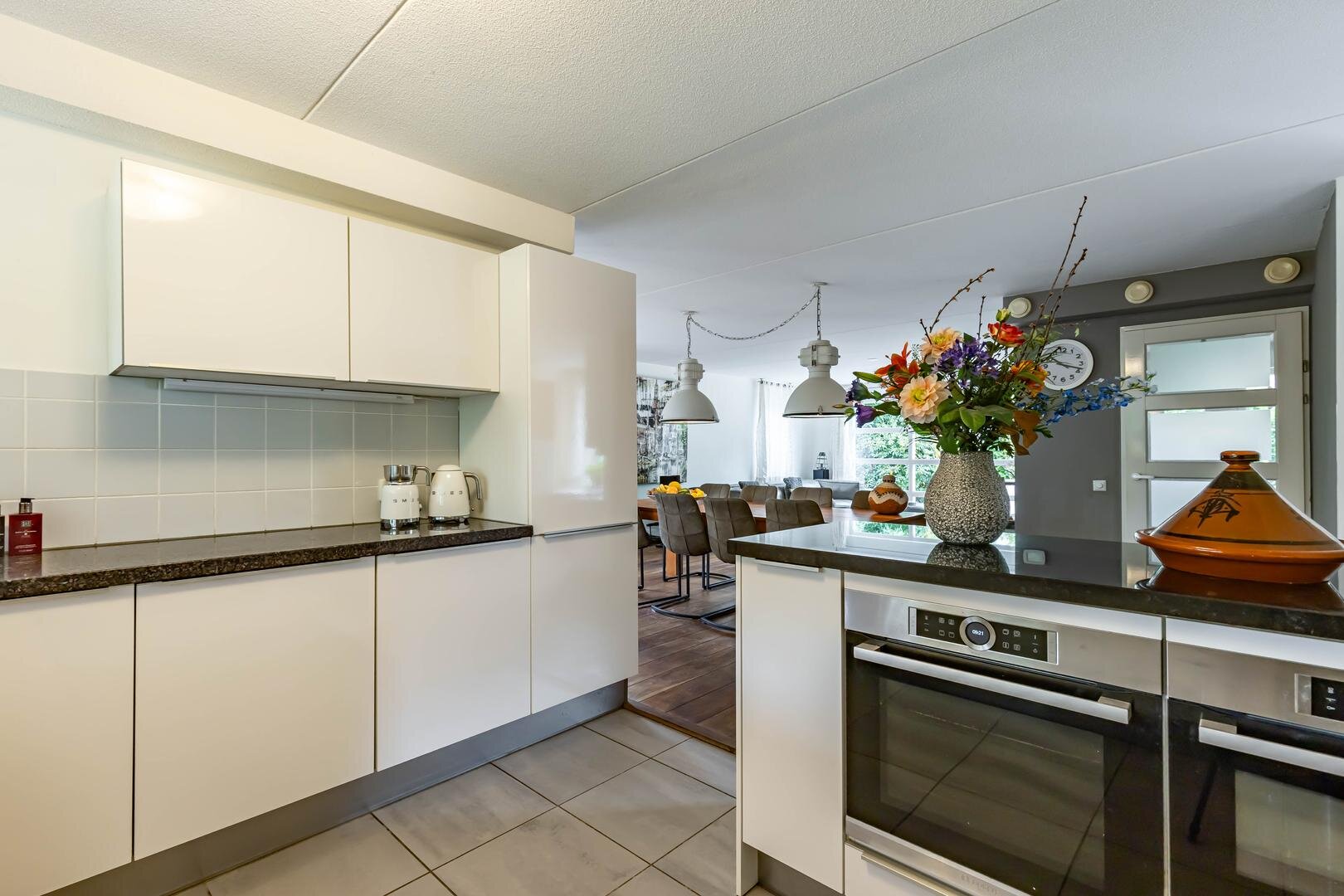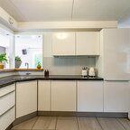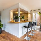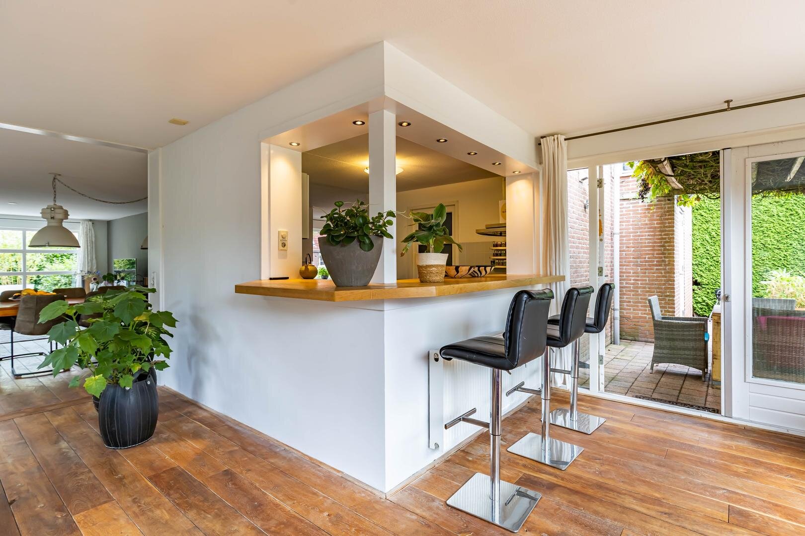 Samen vormt dit een leefruimte van ca. 83 m² die op diverse manieren met elkaar in verbinding staat, maar ook gezellige hoekjes biedt om je even terug te trekken.De keuken is volledig uitgerust met moderne apparatuur, waaronder een 4-pits gaskookplaat met afzuigkap, vaatwasser, combimagnetron, koelkast, oven en een composiet werkblad met veel werkruimte dankzij de hoekopstelling met werkeiland. Via een bar met houtafwerking is er verbinding met de eetkamer en een leuke zitplek met barkrukken, waar veel licht binnenvalt en je fijn uitzicht hebt op de achtertuin.