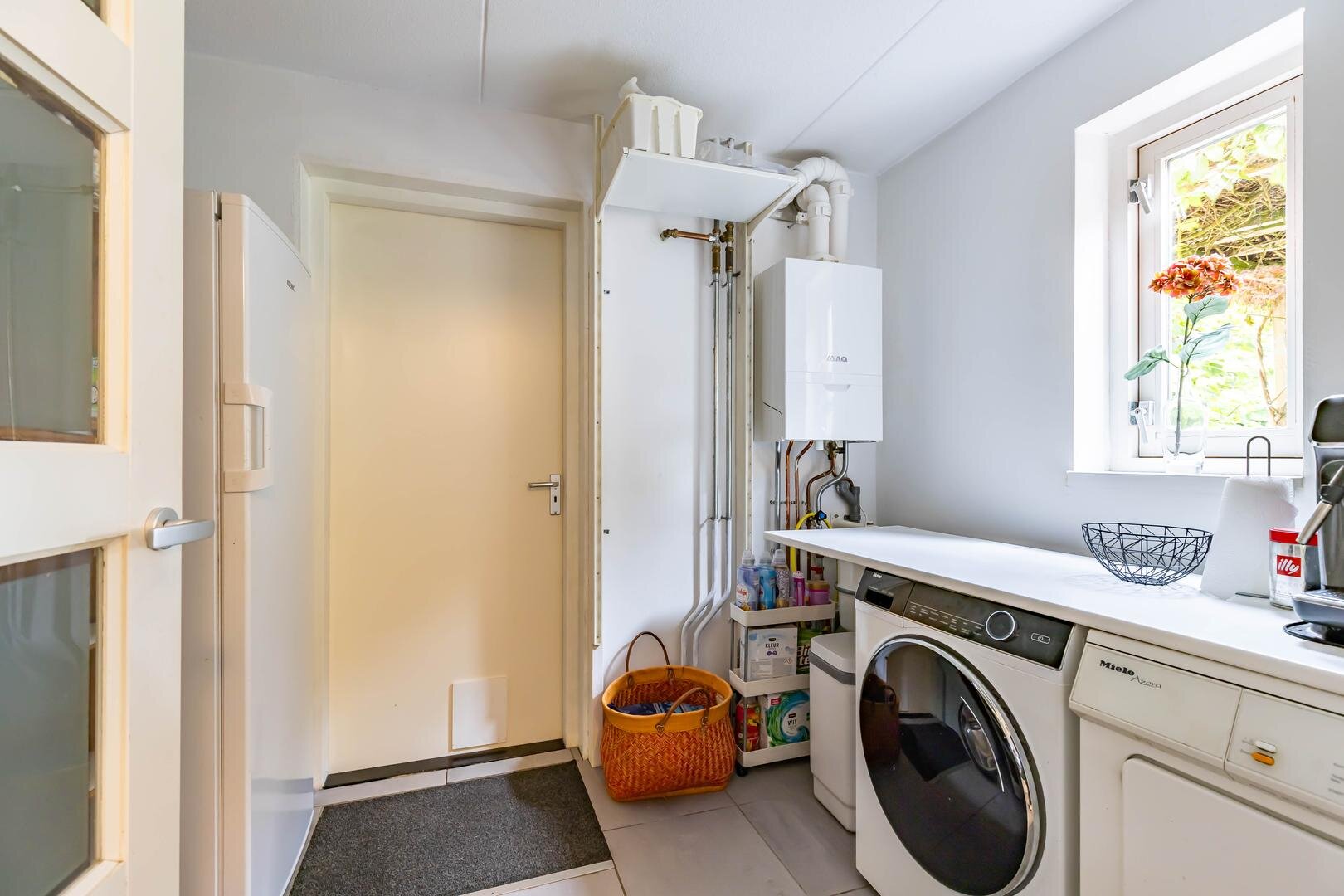 Aangrenzend aan de keuken ligt de bijkeuken van ca. 6 m² – een ideale ruimte voor de wasopstelling. Hier vind je ook de cv-ketel en binnendoor toegang tot de garage van ca. 19 m², met openslaande deuren naar de oprit aan de voorzijde.Eerste verdieping: