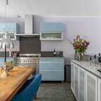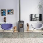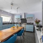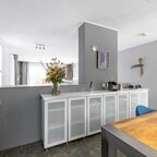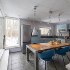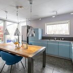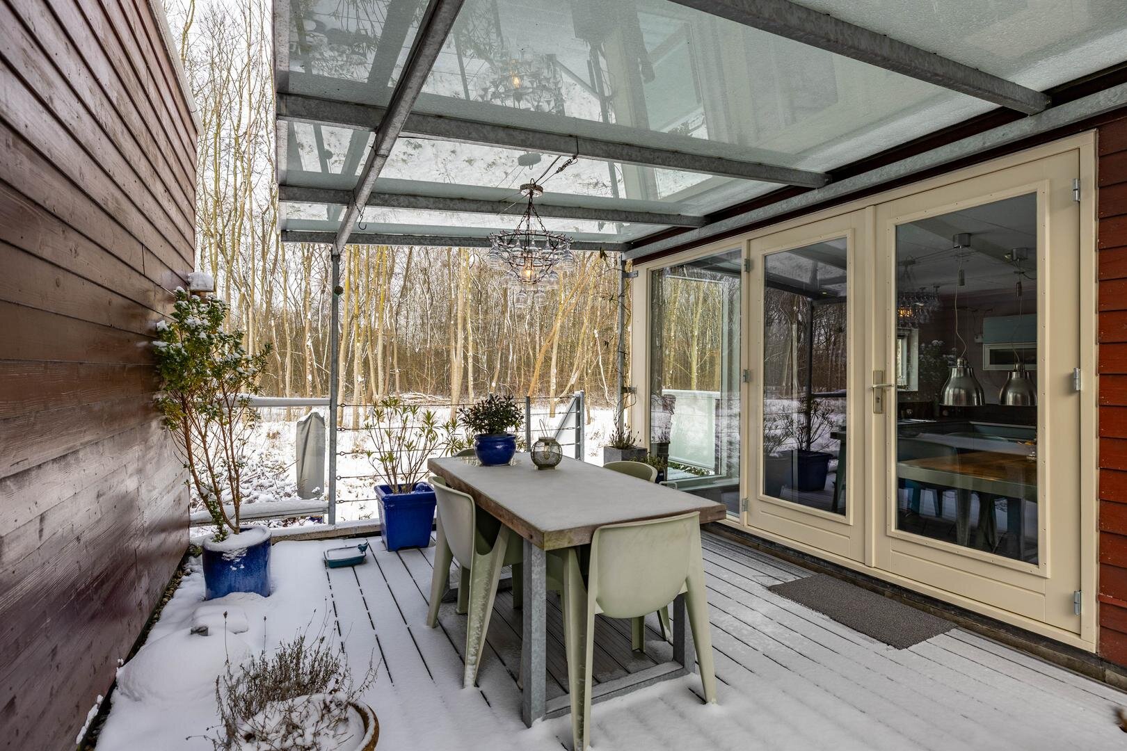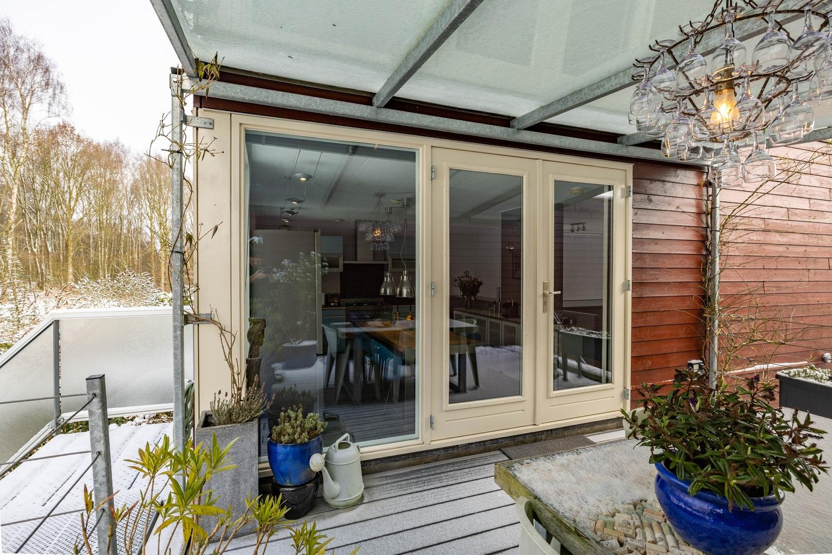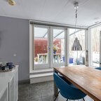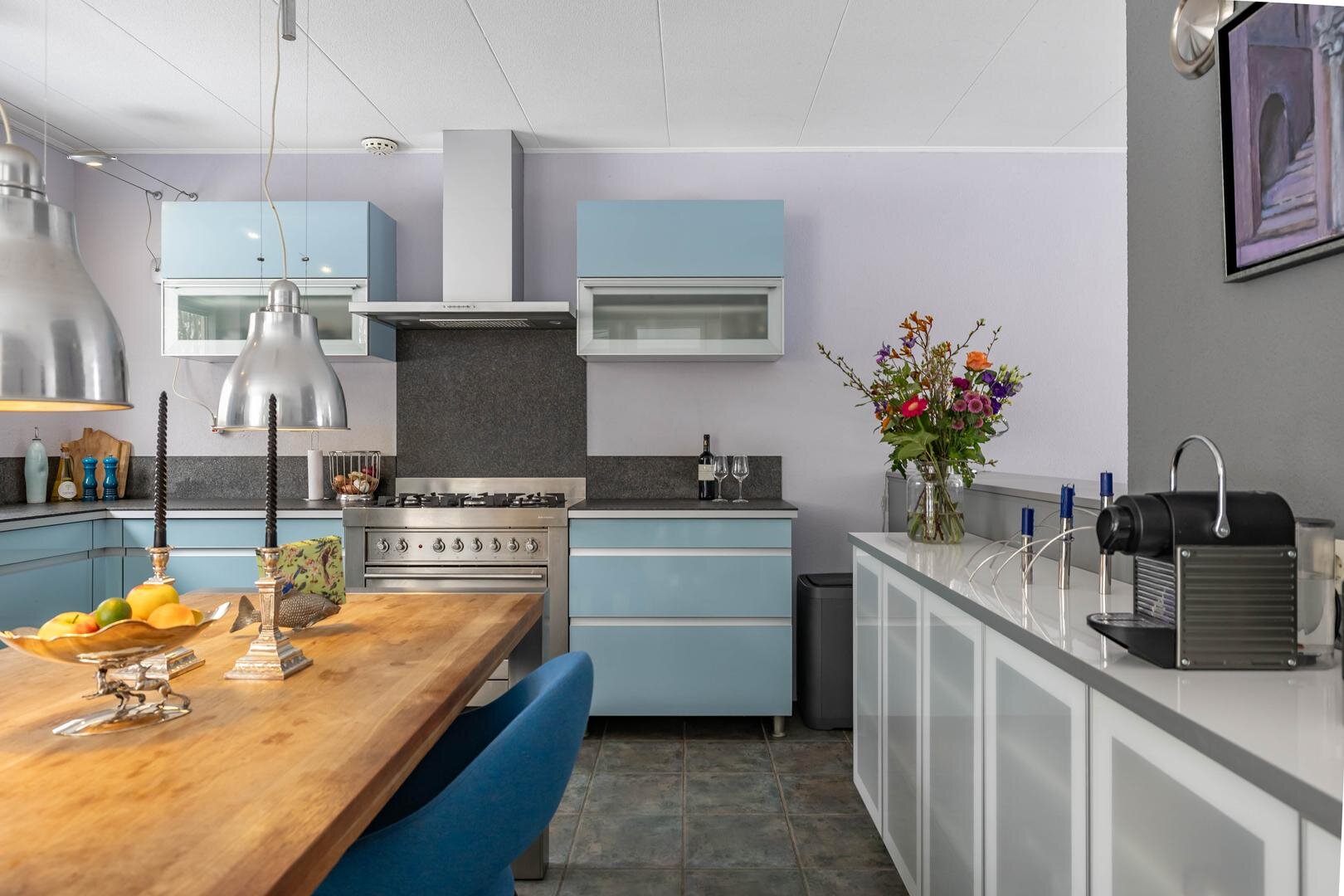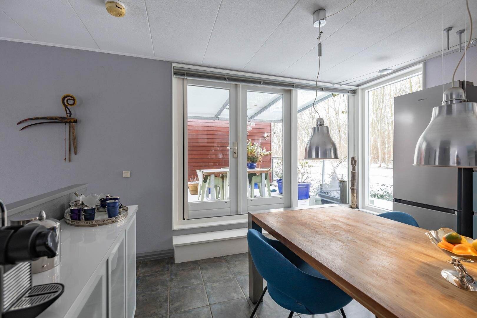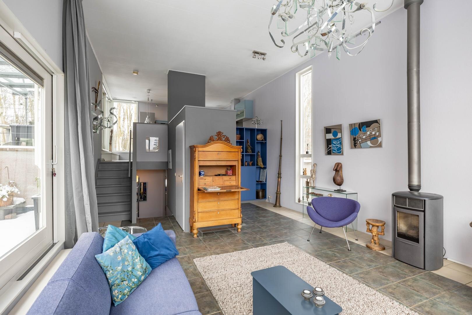 Via wederom een korte trapopgang komen we op het woonlevel. Hier bevindt zich de woonkamer van ca. 35,5 m² met volop lichtinval dankzij de hoge raampartijen en het hoge plafond van bijna 4 meter. Een prettige ruimte met tegelvloer voorzien van vloerverwarming, vanwaar je uitzicht hebt op groen. De pelletkachel zorgt niet alleen voor een fijne warmte in de koude maanden, maar werkt ook zeker sfeerverhogend.Vanuit de woonkamer heb je toegang tot het terras van ca. 23 m², dat weer in verbinding staat met het hoger gelegen terras van ca. 17 m² met overkapping. Vanaf hier leidt een trap naar beneden, de achtertuin in en richting het bos.Dit terras is ook bereikbaar vanuit de woonkeuken, die in een split-levelindeling verbonden is met de woonkamer en dat geweldige uitzicht geeft op het bos. De royale keukenruimte van ca. 19 m² biedt plaats aan een grote hoekkeuken met inbouwapparatuur, waaronder een groot Solitaire gasfornuis met afzuigkap, combi-oven (2022), vaatwasser en een losstaande koel-vriescombinatie (2022). Er is voldoende ruimte voor een grote eettafel om gezellig en lang te tafelen. In de mooie maanden zet je de deuren lekker open en ontstaat er een directe verbinding met het buitenleven, wat deze plek zo bijzonder maakt om te wonen.* geweldige locatie om te wonen, grenzend aan het bos