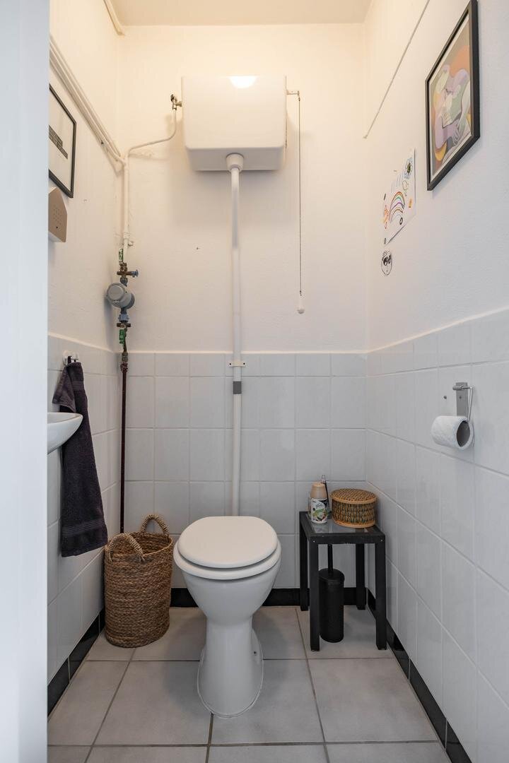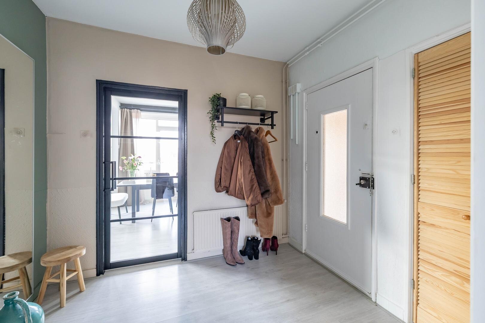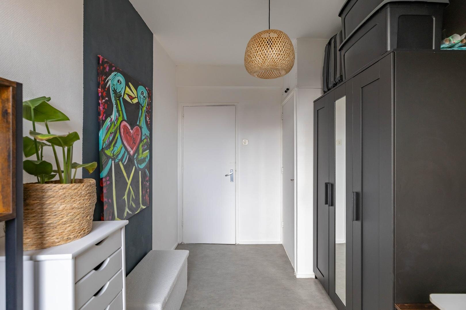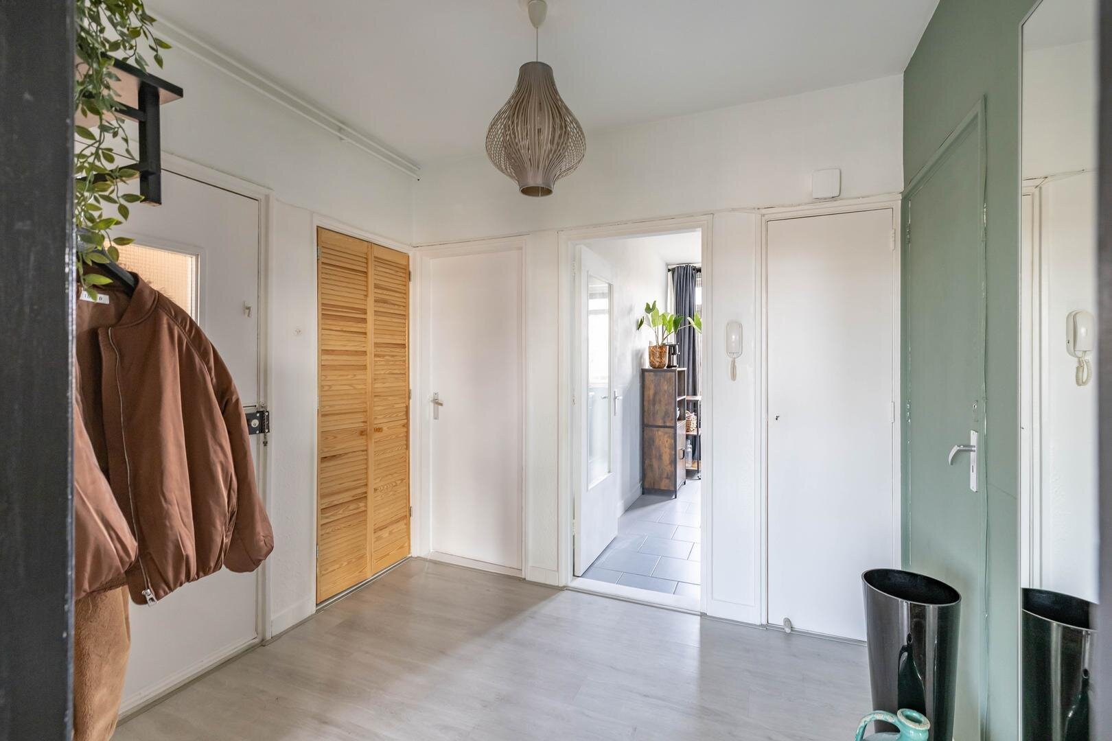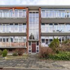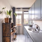 Entree, hal met ruime bergkast, toilet. De lichte woon-/eetkamer van circa 29 m² biedt toegang tot het balkon aan de voorzijde (westen). Het is een open geheel maar middels een roomdivider kan de woonkamer van de eetkamer gescheiden worden. De aparte keuken van circa 6 m² is netjes uitgevoerd en voorzien van een 4-pits gaskookplaat en wasmachineaansluiting.