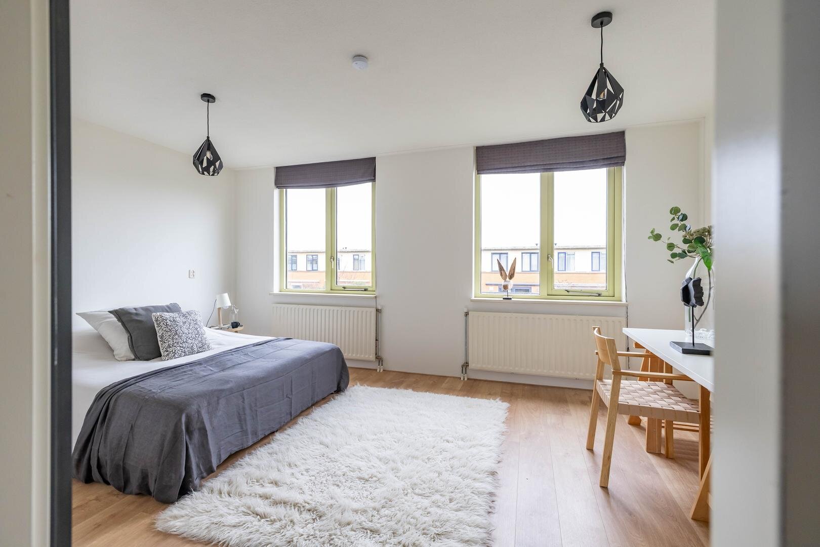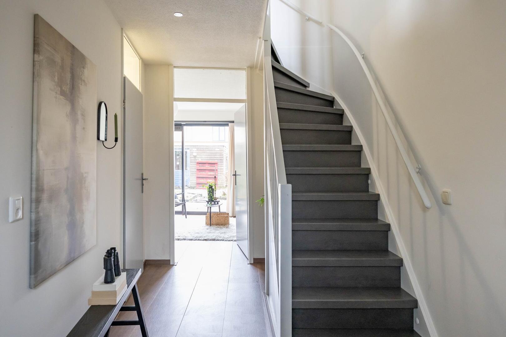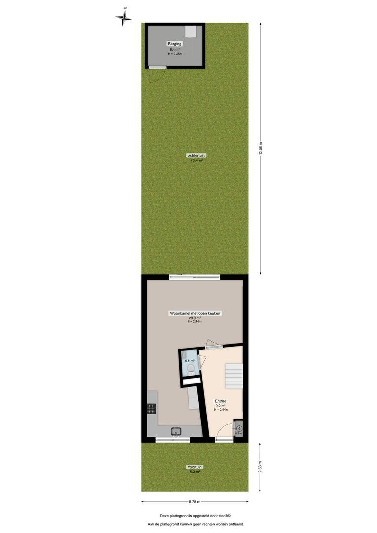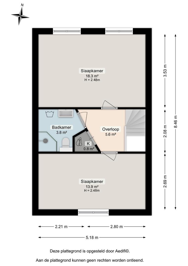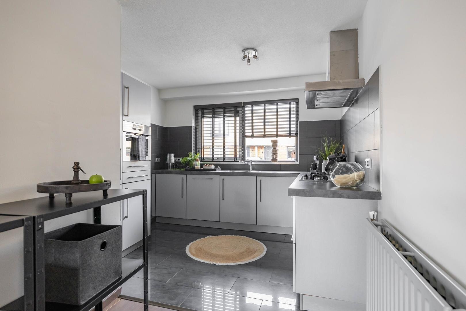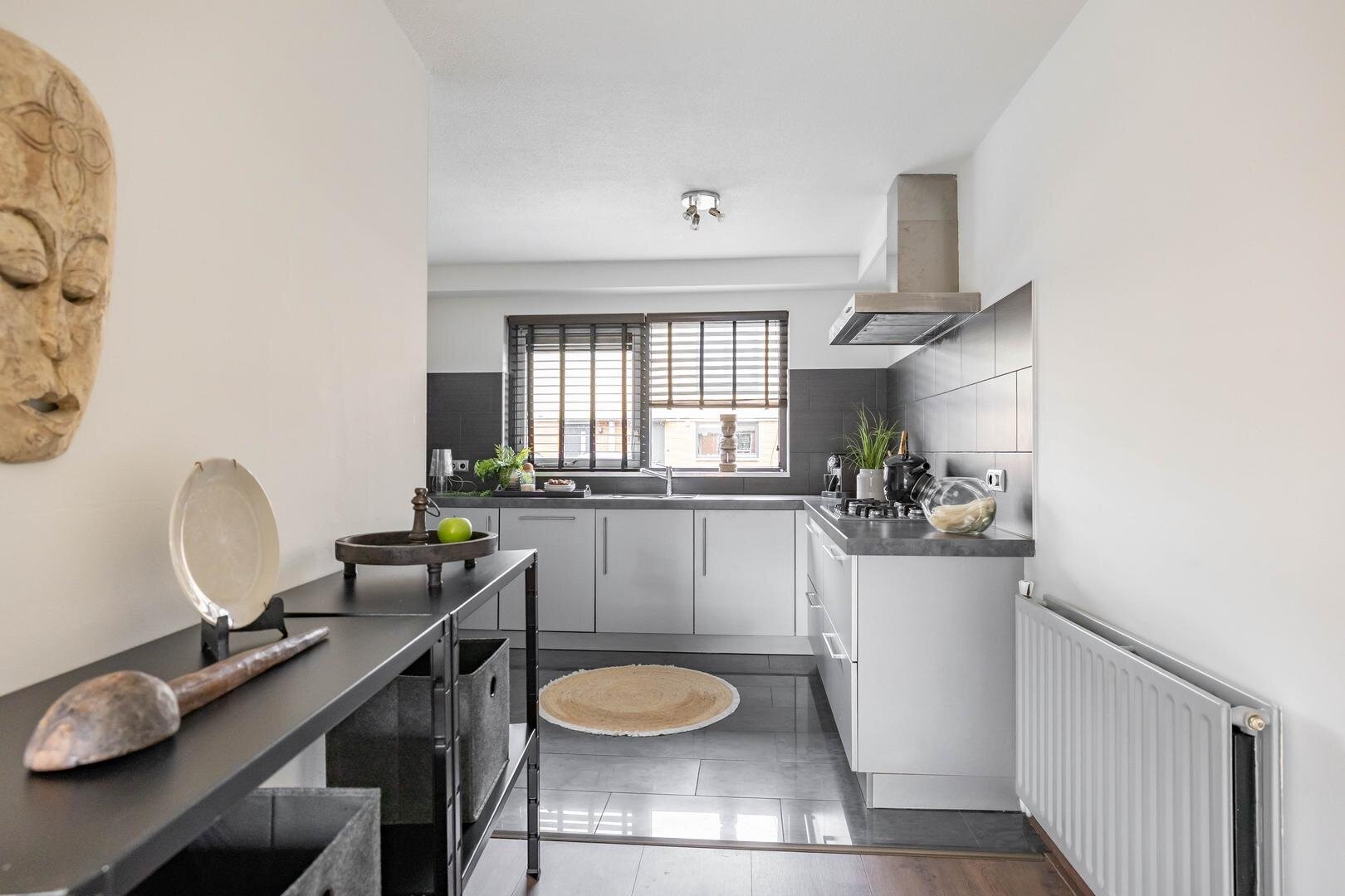 Begane grond: entree/hal met meterkast, toilet met fonteintje en trapopgang naar de verdieping. De woonkamer met open keuken van ca 29m² is heerlijk licht en heeft een schuifpui richting de tuin. De hoekkeuken bevindt zich aan de voorzijde van de woning. De keuken is voorzien van diverse inbouwapparatuur te weten: een koelvriescombinatie, oven, 4-pits gasfornuis, afzuigkap en vaatwasser.Eerste verdieping: op deze verdieping zijn de twee ruime slaapkamers van ca. 14m² en 18m² te vinden. De slaapkamer aan de achterzijde is eenvoudig op te splitsen in twee kamers. De moderne badkamer van ca 4m² is voorzien van; een ruime inloopdouche, wastafel en tweede toilet. In de badkamer is de aansluiting voor het witgoed te vinden.De diepe achtertuin is gelegen op het noorden, en via de achterom te bereiken. Hier vinden we nog een aparte berging van ca 6,4 m²