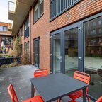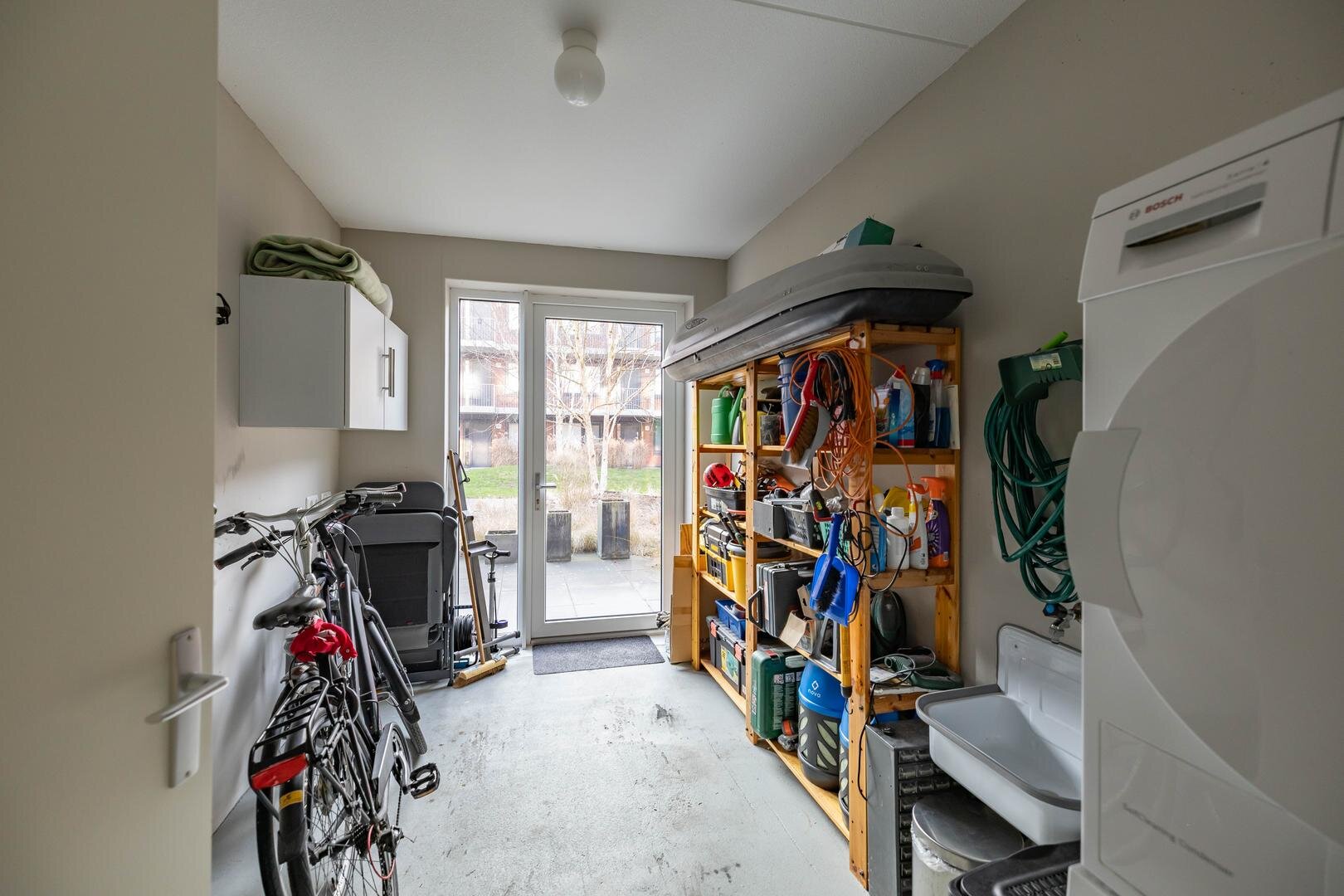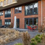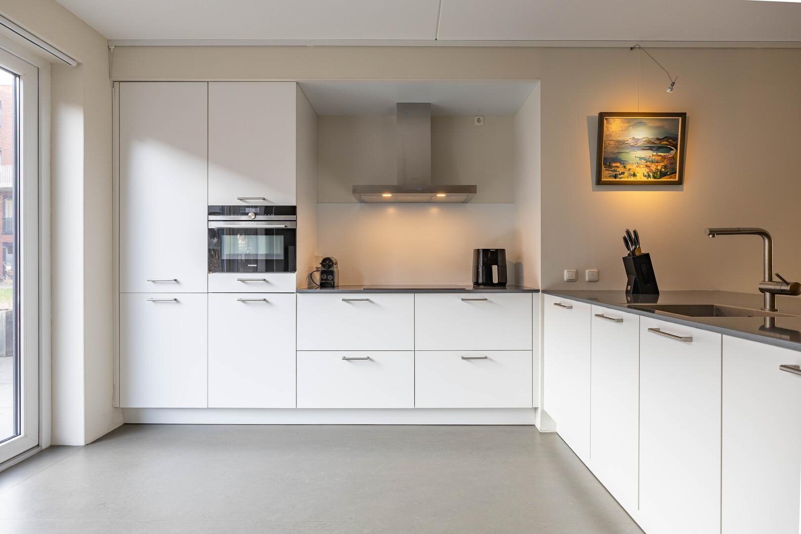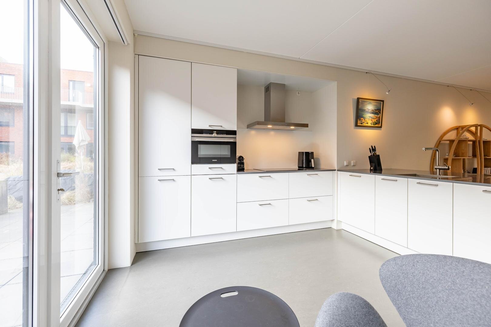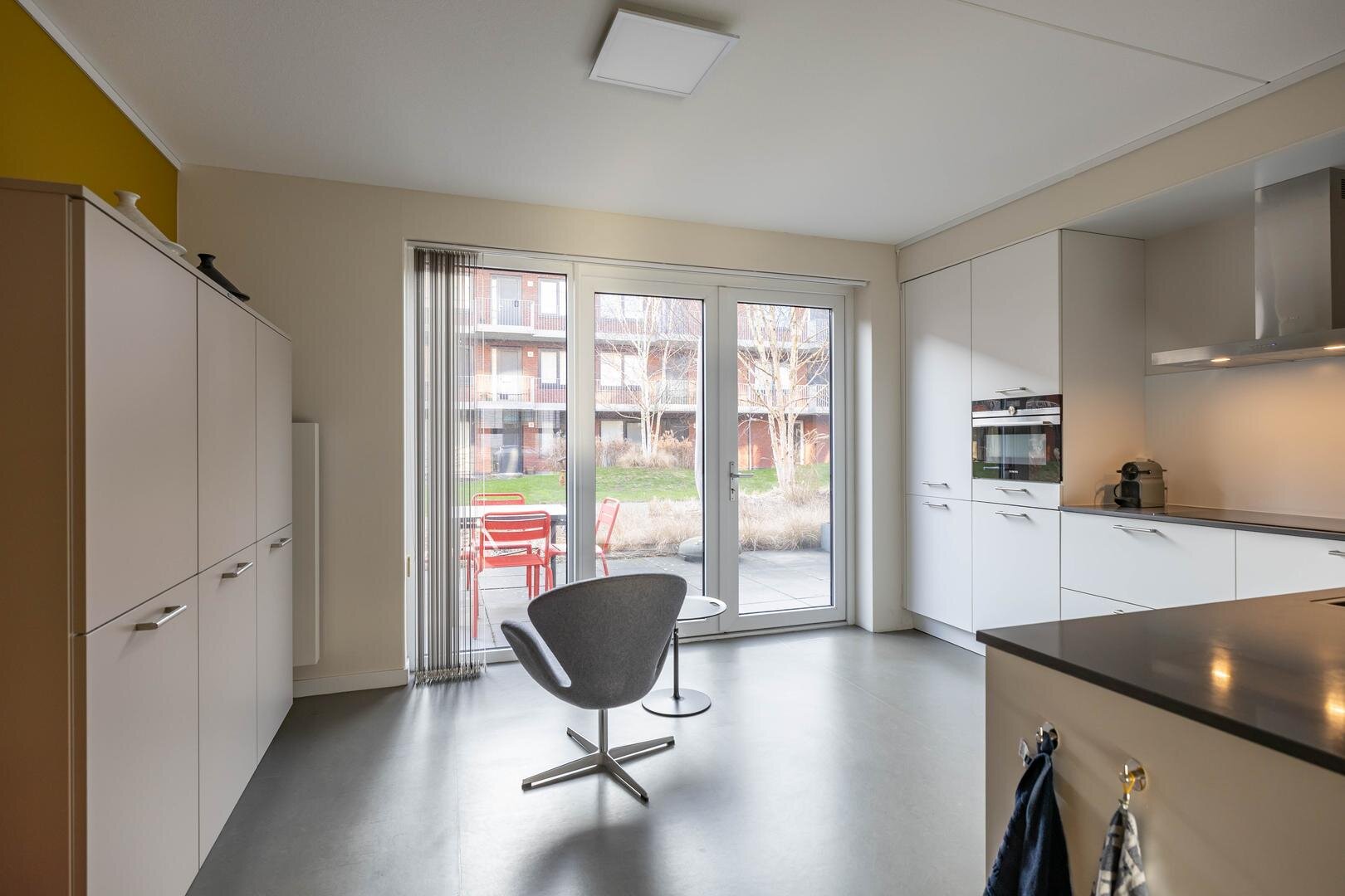 Al bij binnenkomst voel je de ruimte in de hal. Hier bevinden zich de trapopgang naar boven, het toilet, een vaste bergkast en de toegang tot de royale woonkamer van circa 39 m². Dankzij de grote raampartijen is er volop lichtinval. De hoogwaardige marmoleumvloer onderstreept het kwaliteitsniveau waarvoor is gekozen bij de bouw in 2015.De open keuken van SieMatic is circa 17 m² groot en strak uitgevoerd in een hoekopstelling met een uitgebreide keukeninrichting. Er is gekozen voor een dun composiet werkblad, een combi-oven, een inductiekookplaat met SMEG afzuigkap en een koel-/vriescombinatie. Dankzij de hoge kastenwand aan de andere zijde is er veel werk- en bergruimte.Via de openslaande deuren is er een fijne verbinding met de tuin. Hier beschik je over een eigen terras van circa 24 m² op het zuiden, waar je van ’s ochtends tot ’s avonds van de zon kunt genieten, maar ook van het gezamenlijke groen van de binnentuin. Dit groen valt onder het onderhoud van de VvE.Daarnaast is er op de begane grond een bijkeuken met ruimte voor de wasopstelling, extra bergruimte en eveneens toegang tot de achtergelegen buitenruimte.Verdieping
