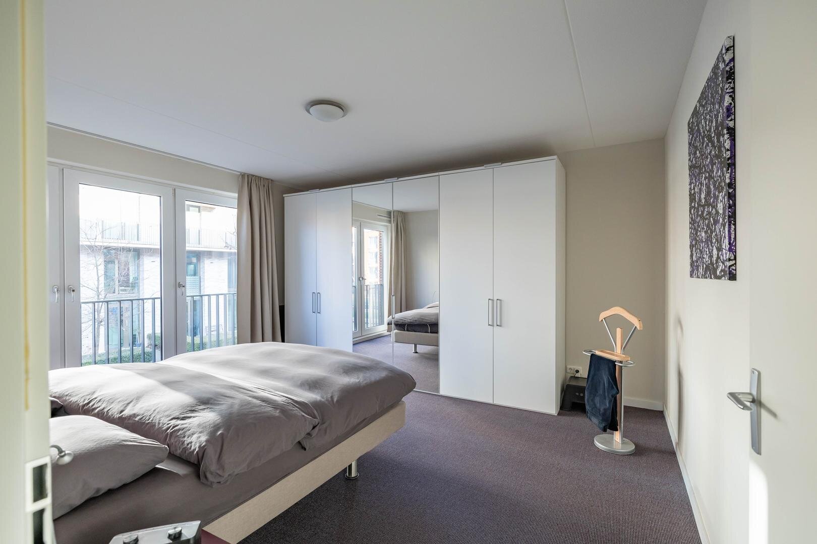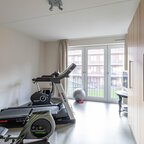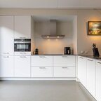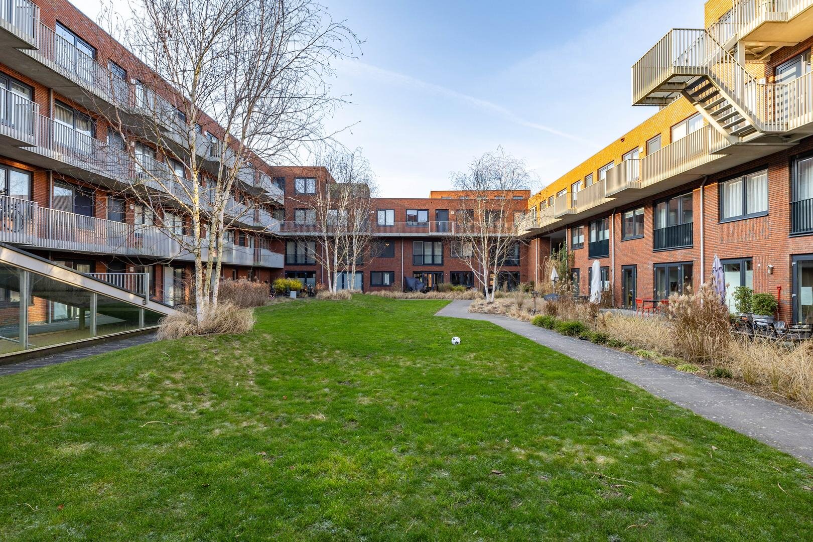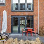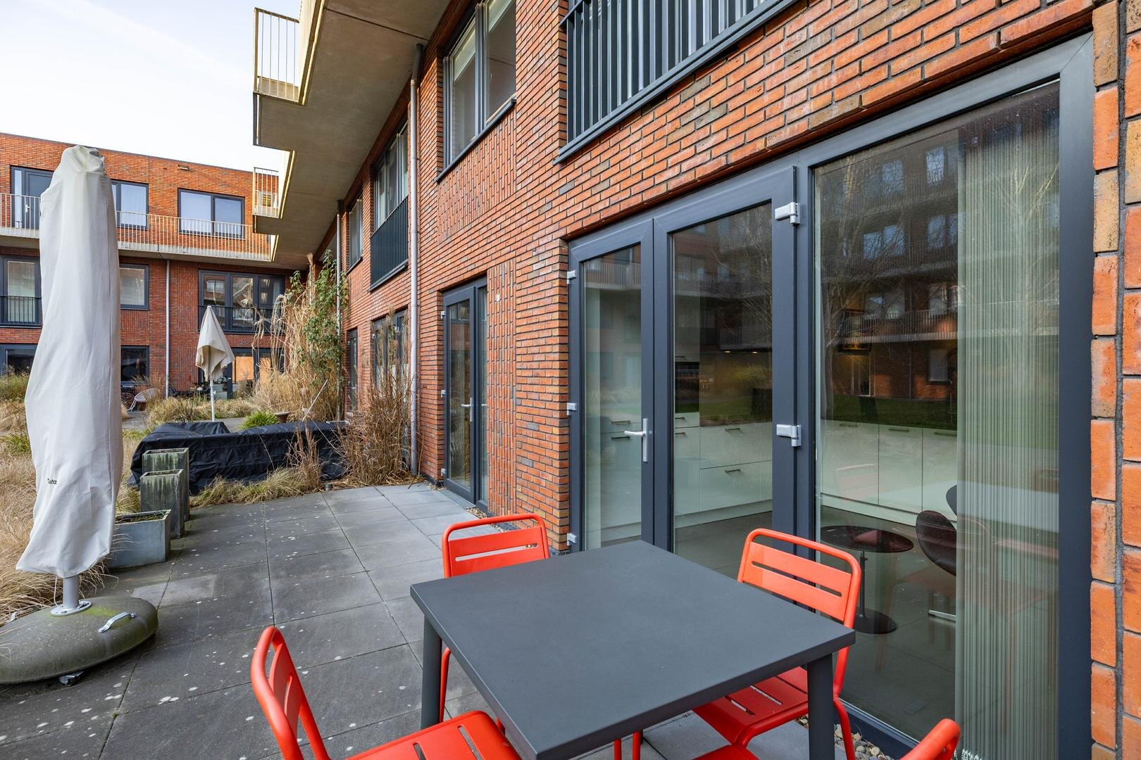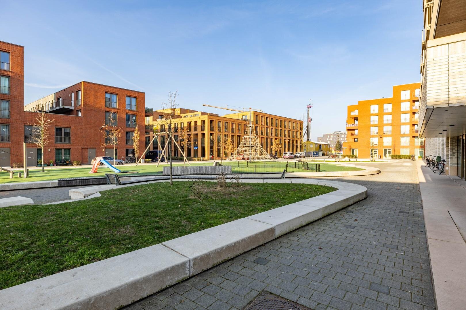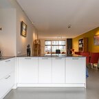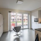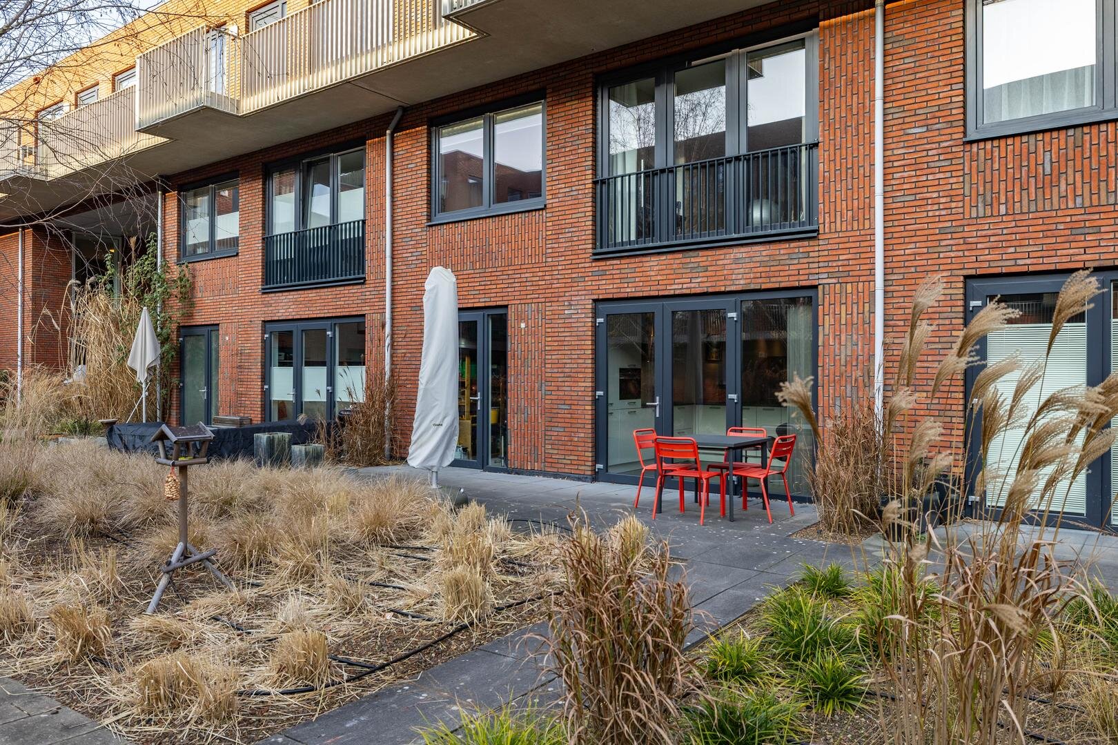 Al bij binnenkomst voel je de ruimte in de hal. Hier bevinden zich de trapopgang naar boven, het toilet, een vaste bergkast en de toegang tot de royale woonkamer van circa 39 m². Dankzij de grote raampartijen is er volop lichtinval. De hoogwaardige marmoleumvloer onderstreept het kwaliteitsniveau waarvoor is gekozen bij de bouw in 2015.De open keuken van SieMatic is circa 17 m² groot en strak uitgevoerd in een hoekopstelling met een uitgebreide keukeninrichting. Er is gekozen voor een dun composiet werkblad, een combi-oven, een inductiekookplaat met SMEG afzuigkap en een koel-/vriescombinatie. Dankzij de hoge kastenwand aan de andere zijde is er veel werk- en bergruimte.Via de openslaande deuren is er een fijne verbinding met de tuin. Hier beschik je over een eigen terras van circa 24 m² op het zuiden, waar je van ’s ochtends tot ’s avonds van de zon kunt genieten, maar ook van het gezamenlijke groen van de binnentuin. Dit groen valt onder het onderhoud van de VvE.Daarnaast is er op de begane grond een bijkeuken met ruimte voor de wasopstelling, extra bergruimte en eveneens toegang tot de achtergelegen buitenruimte.Verdieping