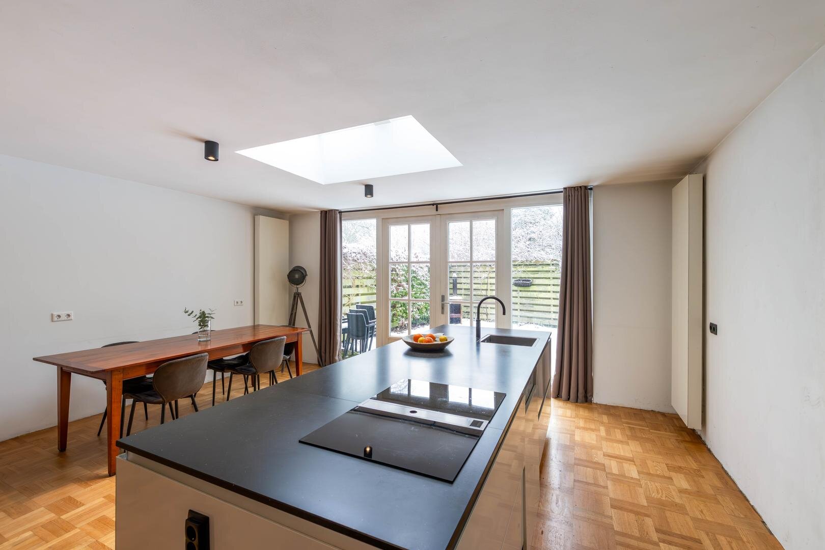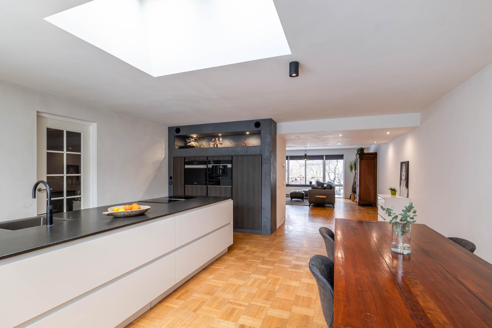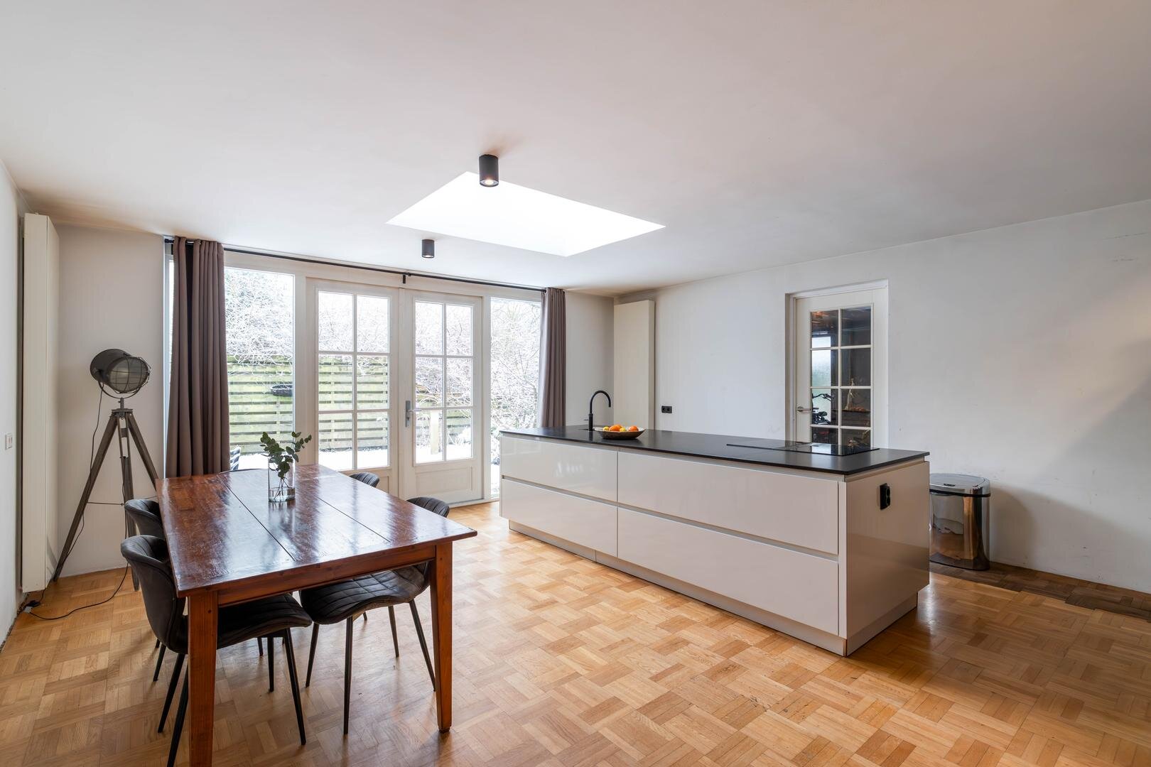 Entree/hal met toilet, meterkast en trapopgang. Vanuit hier is de royale living van circa 63 m² bereikbaar, inclusief de grote open woonkeuken, voorzien van een houten parketvloer. Aan de voorzijde bevindt zich het woongedeelte met een fijne zithoek en open haard.De open keuken aan de achterzijde is extra licht dankzij de lichtkoepel. In 2020 is hier een nieuwe keuken geplaatst met een composiet werkblad, kookeiland met Bora inductiekookplaat met interne afzuiging, Quooker (kokendwaterkraan), vaatwasser en volop werk- en bergruimte in de vele lades. In de hoge kastenwand bevinden zich de combi-oven met warmhoudlade, espressomachine en koelkast. De keuken is daarmee meer dan compleet uitgerust.Vanuit de keuken is er een deur naar de garage, waardoor deze binnendoor bereikbaar is. De garage is circa 22 m² groot en biedt veel bergruimte, maar ook diverse gebruiksmogelijkheden. Via openslaande deuren in de woonkeuken is de zonnige achtertuin op het zuiden bereikbaar.Eerste verdieping