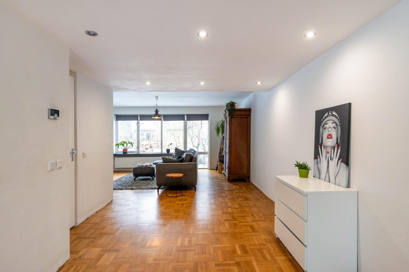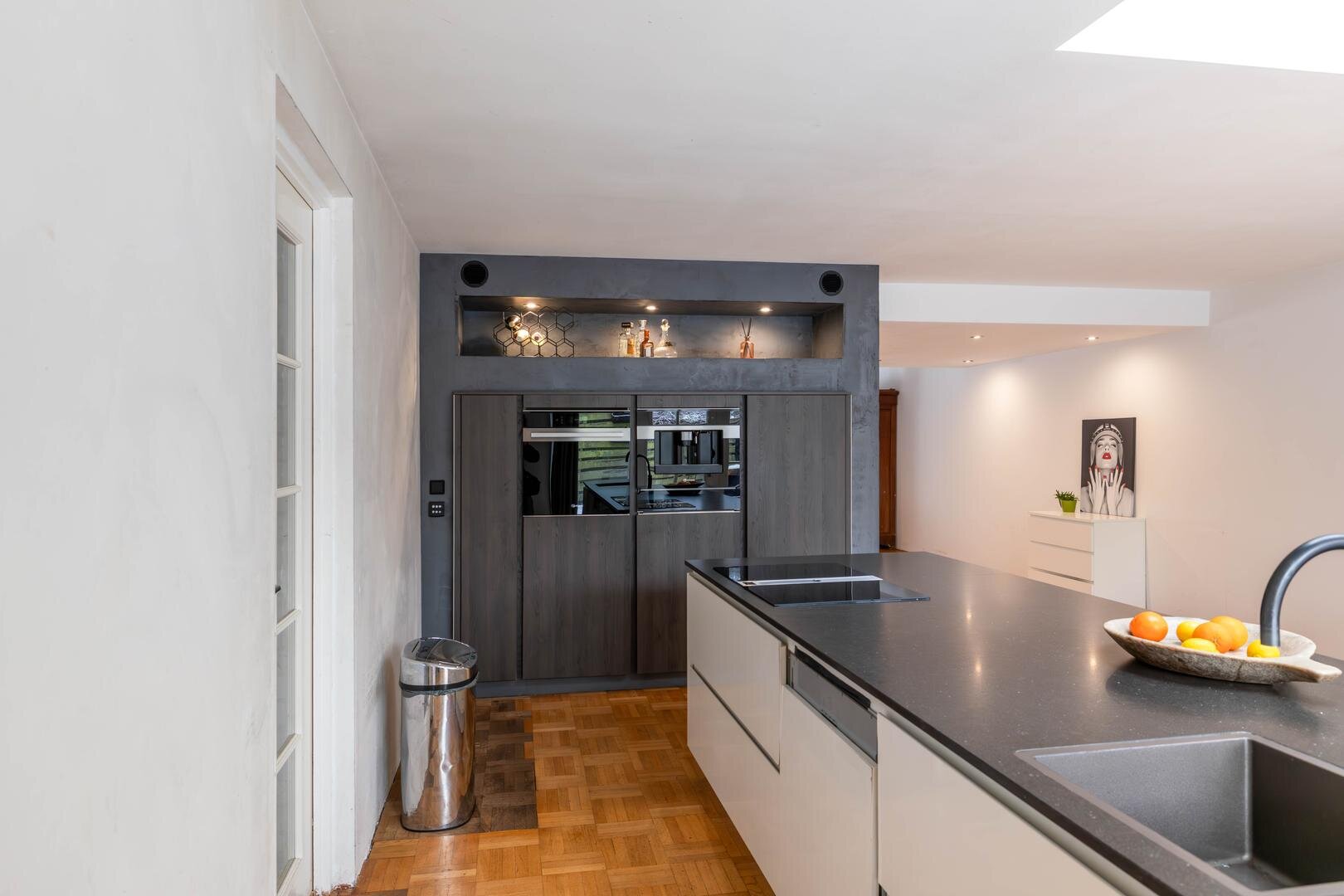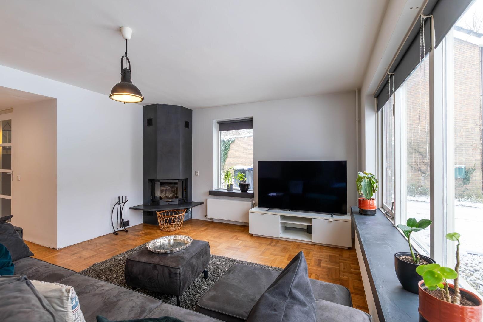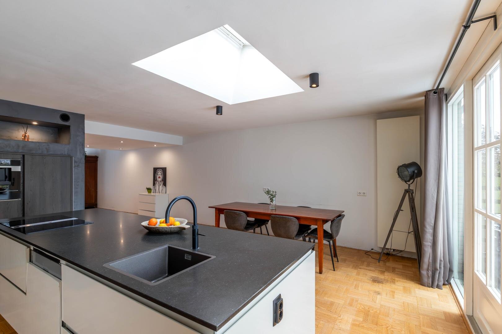 Entree/hal met toilet, meterkast en trapopgang. Vanuit hier is de royale living van circa 63 m² bereikbaar, inclusief de grote open woonkeuken, voorzien van een houten parketvloer. Aan de voorzijde bevindt zich het woongedeelte met een fijne zithoek en open haard.De open keuken aan de achterzijde is extra licht dankzij de lichtkoepel. In 2020 is hier een nieuwe keuken geplaatst met een composiet werkblad, kookeiland met Bora inductiekookplaat met interne afzuiging, Quooker (kokendwaterkraan), vaatwasser en volop werk- en bergruimte in de vele lades. In de hoge kastenwand bevinden zich de combi-oven met warmhoudlade, espressomachine en koelkast. De keuken is daarmee meer dan compleet uitgerust.Vanuit de keuken is er een deur naar de garage, waardoor deze binnendoor bereikbaar is. De garage is circa 22 m² groot en biedt veel bergruimte, maar ook diverse gebruiksmogelijkheden. Via openslaande deuren in de woonkeuken is de zonnige achtertuin op het zuiden bereikbaar.Eerste verdieping