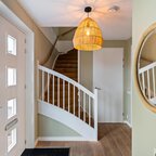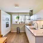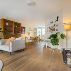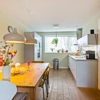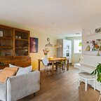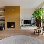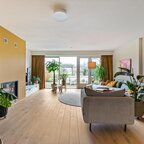 Entree/hal met hangtoilet en een ruime vaste kast onder de trap met daarin de opstelling voor het witgoed.Bij binnenkomst kom je in de open keuken van ca. 9 m² met aan weerszijden een inbouwkeuken. De hoge kastenwand biedt plaats aan de oven, magnetron en grote koelkast. Aan de andere zijde bevinden zich de vaatwasser, inductiekookplaat met afzuigkap en de Quooker, met veel bergruimte in de lades en volop werkruimte op het mooie, vernieuwde werkblad. Zowel het werkblad als de apparatuur zijn in de afgelopen jaren vernieuwd.Aansluitend vind je de royale living van ca. 43 m² met een sfeervolle haard en vaste kast. De woonkamer én keuken zijn voorzien van een stijlvolle eikenhouten vloer, wat zorgt voor een warme uitstraling. Een heerlijke ruimte om te vertoeven, zeker met het zicht op de achtertuin. Dankzij de openslaande deuren heb je directe toegang tot de fijne buitenruimte en kun je in de zomer het binnen- en buitenleven moeiteloos met elkaar verbinden.Eerste verdieping: