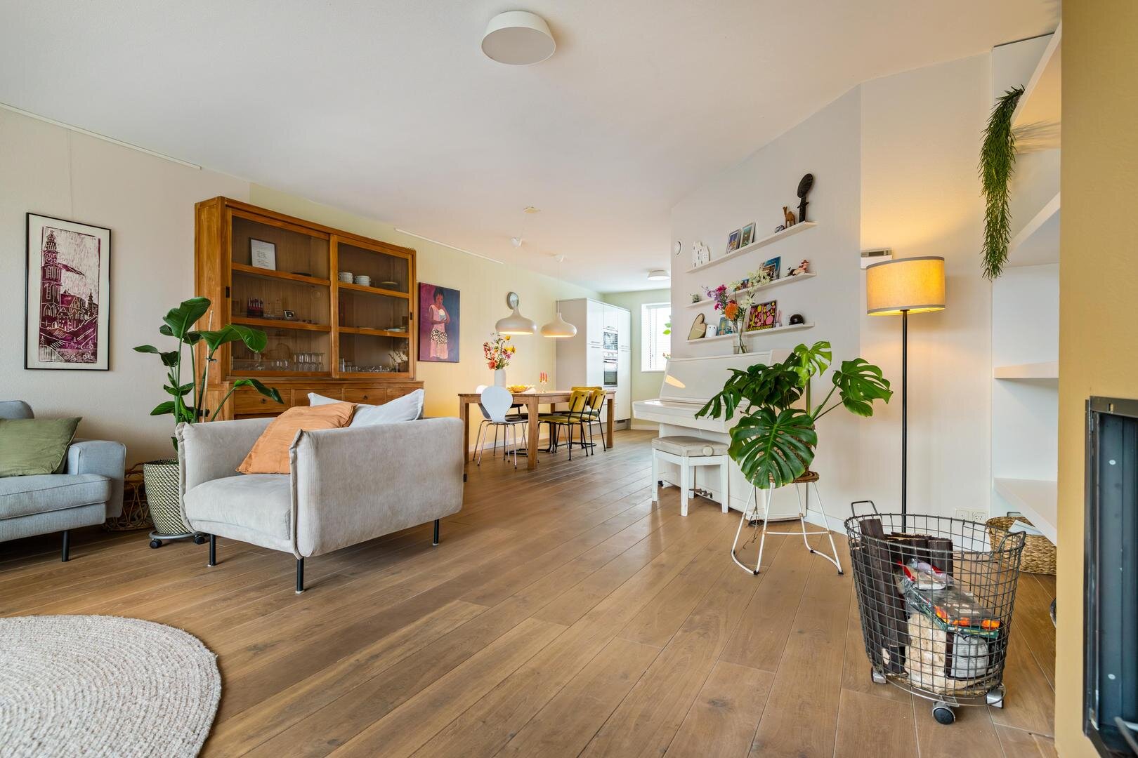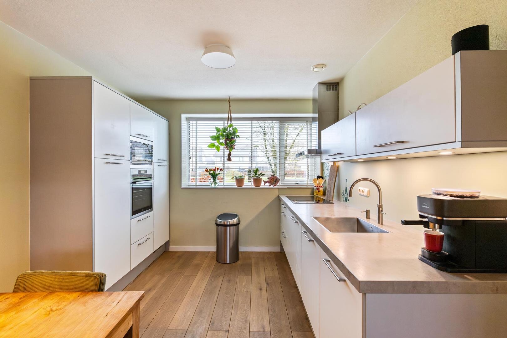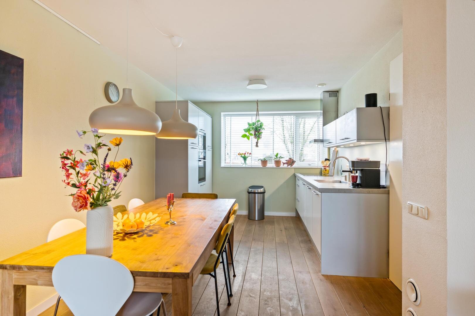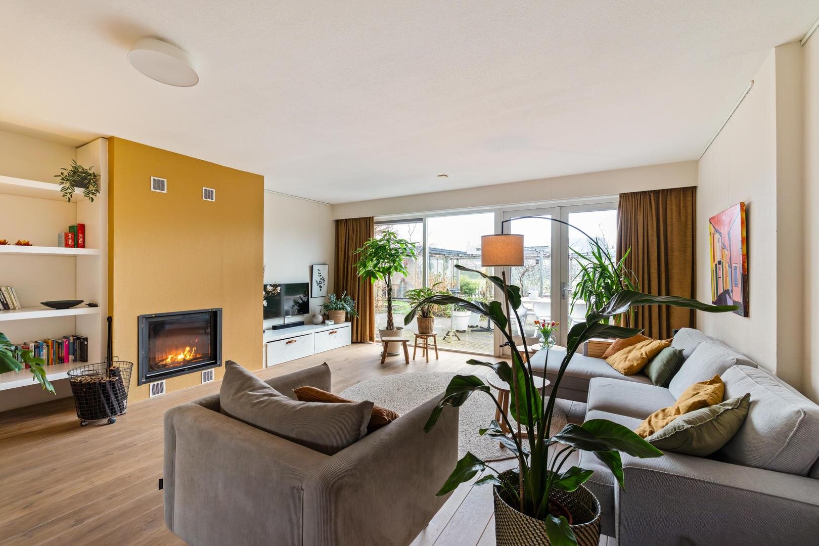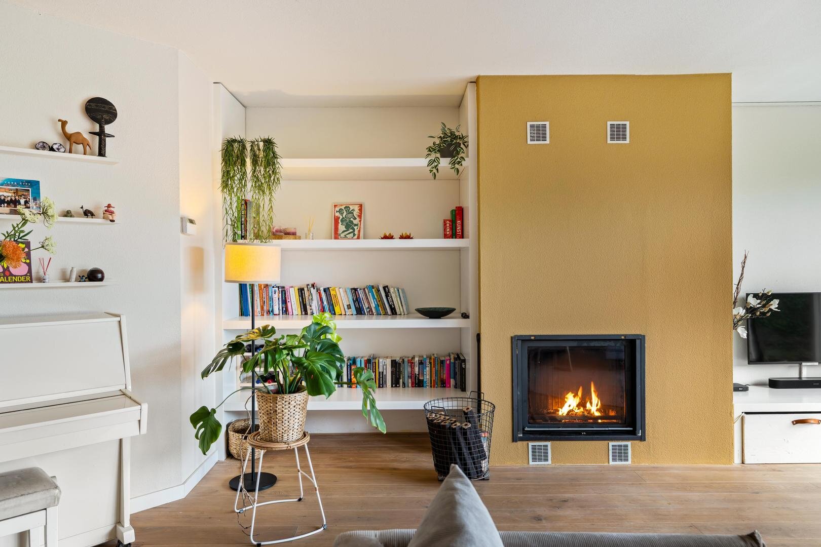 Entree/hal met hangtoilet en een ruime vaste kast onder de trap met daarin de opstelling voor het witgoed.Bij binnenkomst kom je in de open keuken van ca. 9 m² met aan weerszijden een inbouwkeuken. De hoge kastenwand biedt plaats aan de oven, magnetron en grote koelkast. Aan de andere zijde bevinden zich de vaatwasser, inductiekookplaat met afzuigkap en de Quooker, met veel bergruimte in de lades en volop werkruimte op het mooie, vernieuwde werkblad. Zowel het werkblad als de apparatuur zijn in de afgelopen jaren vernieuwd.Aansluitend vind je de royale living van ca. 43 m² met een sfeervolle haard en vaste kast. De woonkamer én keuken zijn voorzien van een stijlvolle eikenhouten vloer, wat zorgt voor een warme uitstraling. Een heerlijke ruimte om te vertoeven, zeker met het zicht op de achtertuin. Dankzij de openslaande deuren heb je directe toegang tot de fijne buitenruimte en kun je in de zomer het binnen- en buitenleven moeiteloos met elkaar verbinden.Eerste verdieping: