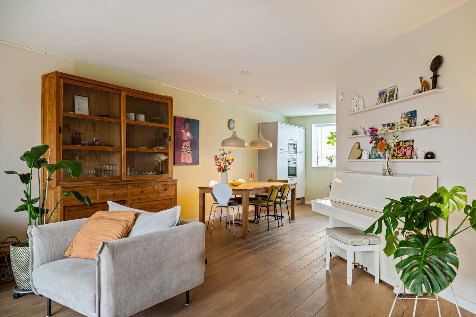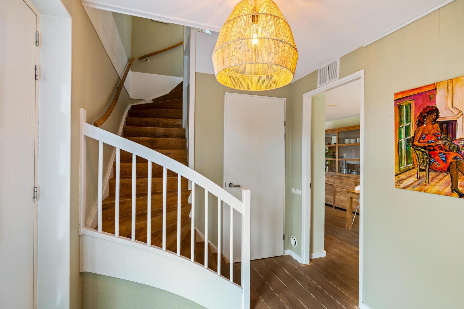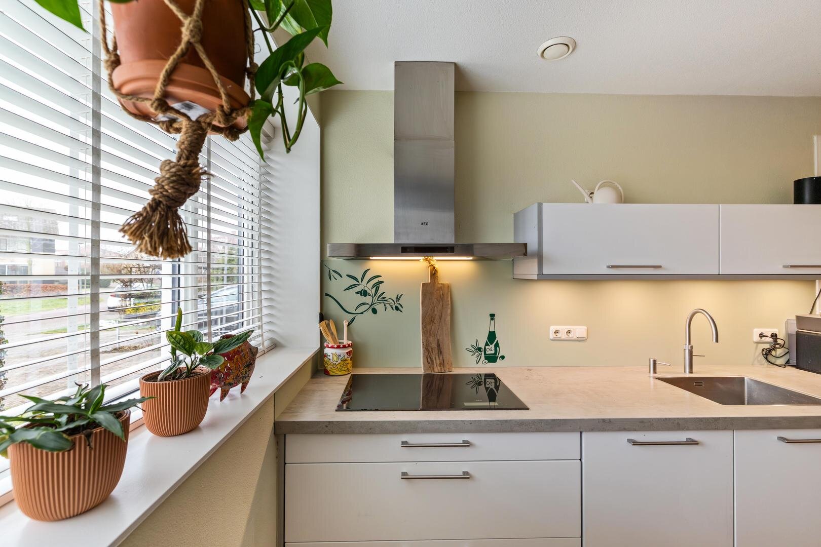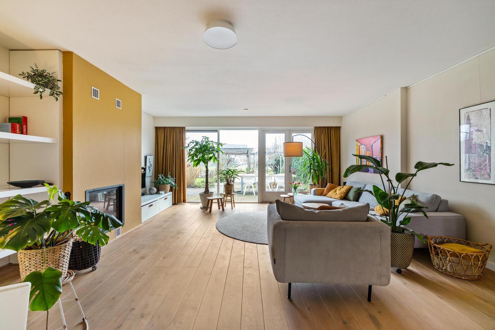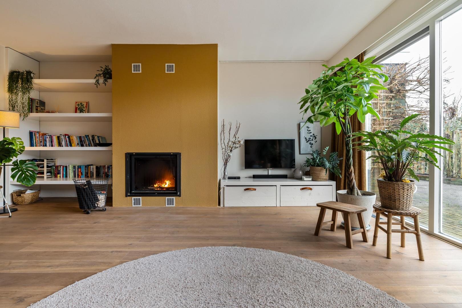Entree/hal met hangtoilet en een ruime vaste kast onder de trap met daarin de opstelling voor het witgoed.Bij binnenkomst kom je in de open keuken van ca. 9 m² met aan weerszijden een inbouwkeuken. De hoge kastenwand biedt plaats aan de oven, magnetron en grote koelkast. Aan de andere zijde bevinden zich de vaatwasser, inductiekookplaat met afzuigkap en de Quooker, met veel bergruimte in de lades en volop werkruimte op het mooie, vernieuwde werkblad. Zowel het werkblad als de apparatuur zijn in de afgelopen jaren vernieuwd.Aansluitend vind je de royale living van ca. 43 m² met een sfeervolle haard en vaste kast. De woonkamer én keuken zijn voorzien van een stijlvolle eikenhouten vloer, wat zorgt voor een warme uitstraling. Een heerlijke ruimte om te vertoeven, zeker met het zicht op de achtertuin. Dankzij de openslaande deuren heb je directe toegang tot de fijne buitenruimte en kun je in de zomer het binnen- en buitenleven moeiteloos met elkaar verbinden.Eerste verdieping: