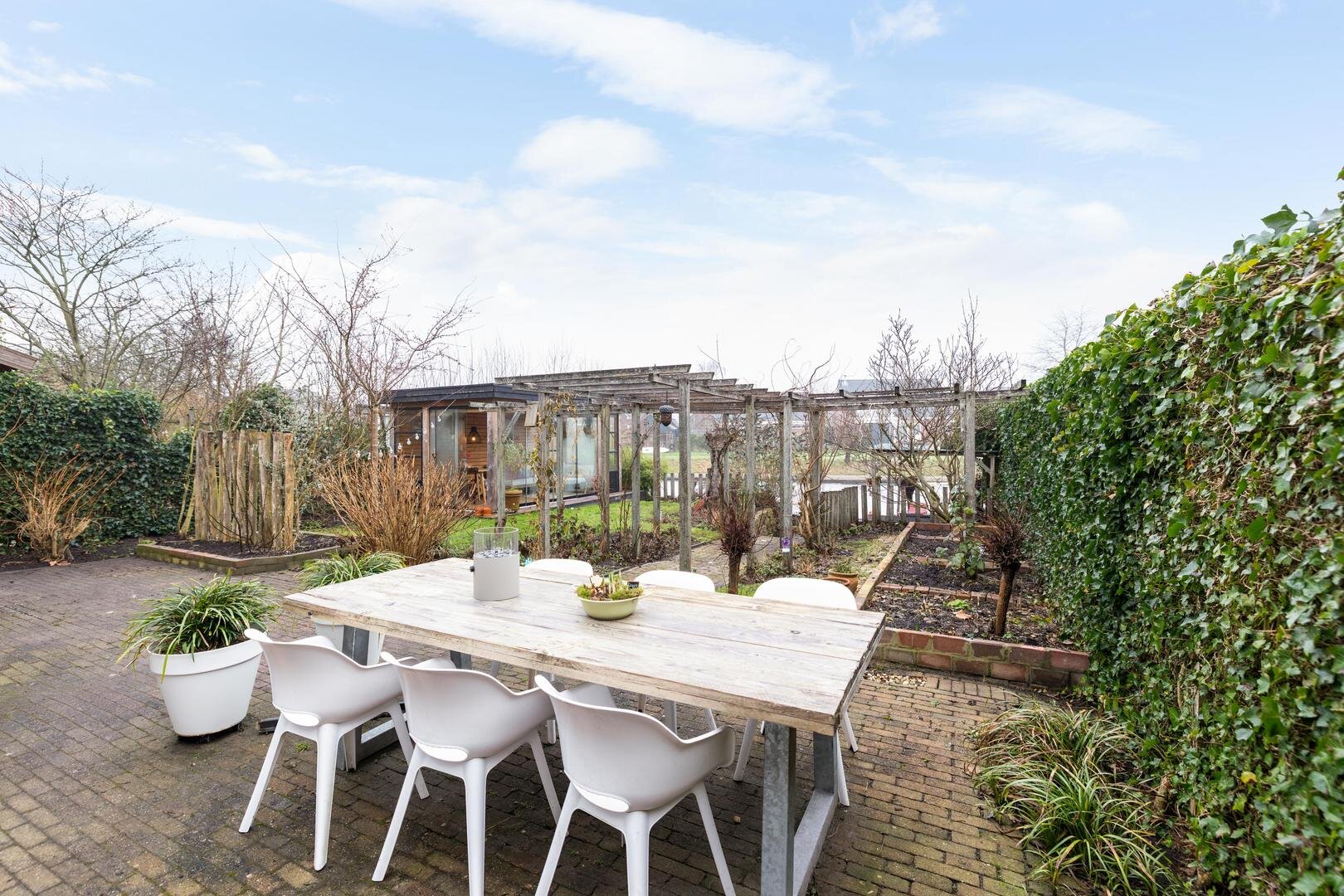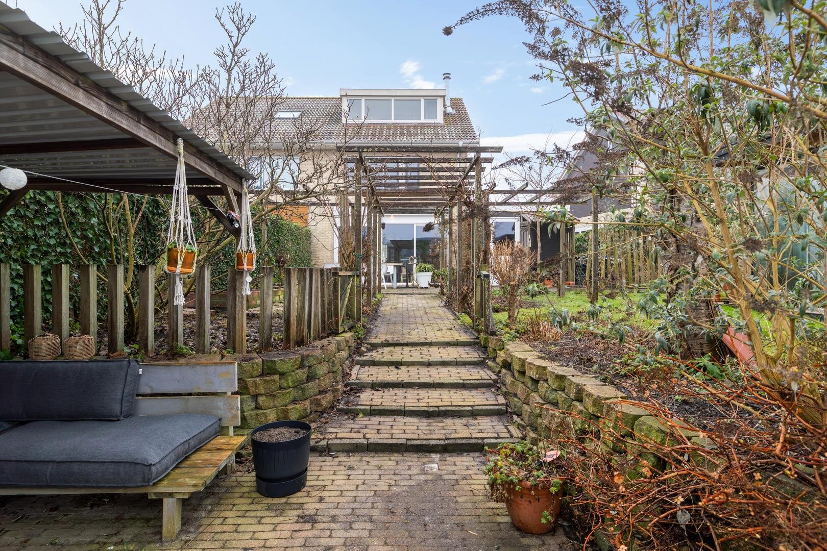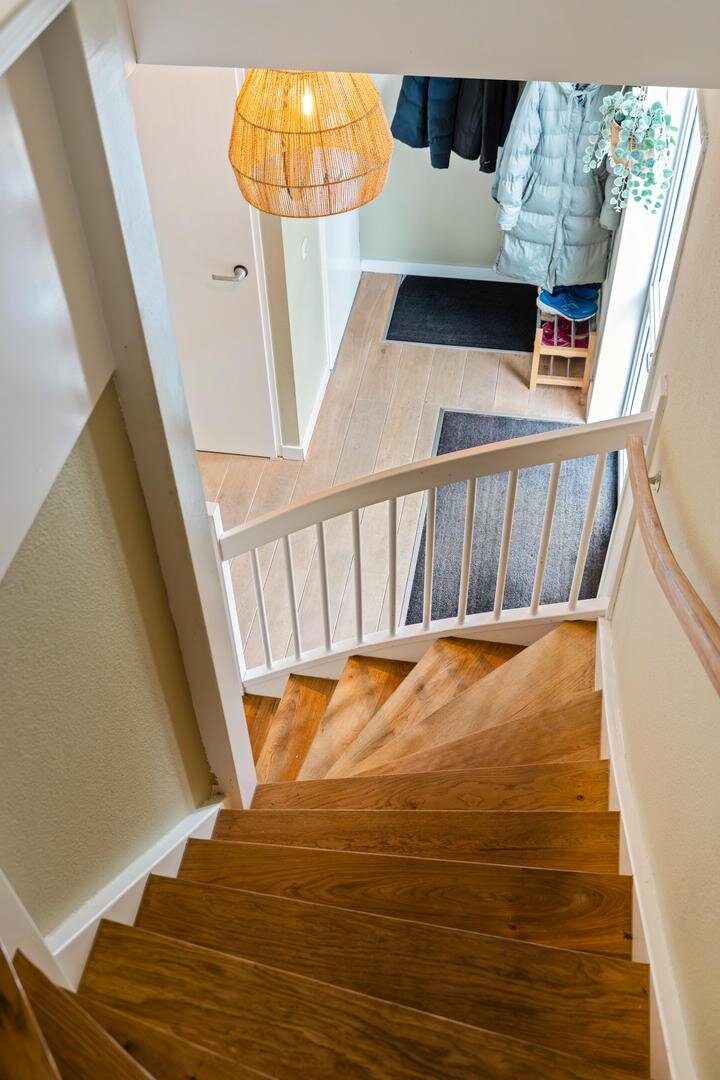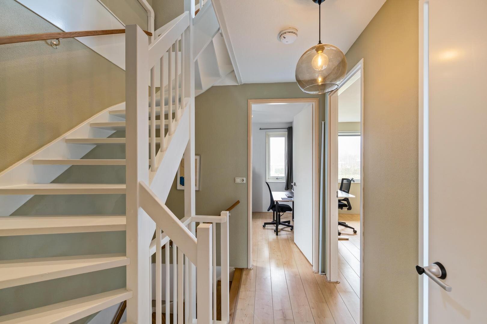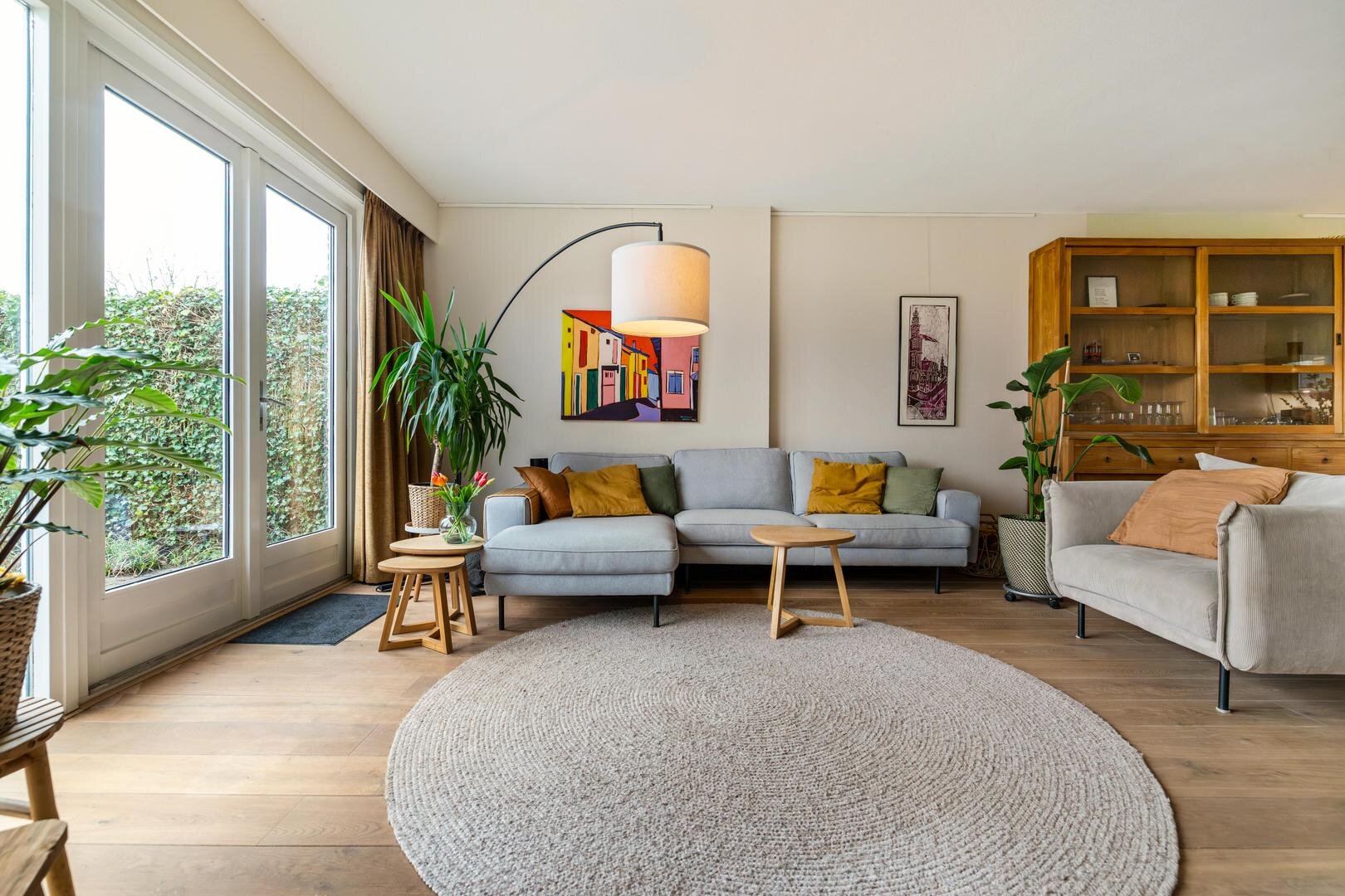 Entree/hal met hangtoilet en een ruime vaste kast onder de trap met daarin de opstelling voor het witgoed.Bij binnenkomst kom je in de open keuken van ca. 9 m² met aan weerszijden een inbouwkeuken. De hoge kastenwand biedt plaats aan de oven, magnetron en grote koelkast. Aan de andere zijde bevinden zich de vaatwasser, inductiekookplaat met afzuigkap en de Quooker, met veel bergruimte in de lades en volop werkruimte op het mooie, vernieuwde werkblad. Zowel het werkblad als de apparatuur zijn in de afgelopen jaren vernieuwd.Aansluitend vind je de royale living van ca. 43 m² met een sfeervolle haard en vaste kast. De woonkamer én keuken zijn voorzien van een stijlvolle eikenhouten vloer, wat zorgt voor een warme uitstraling. Een heerlijke ruimte om te vertoeven, zeker met het zicht op de achtertuin. Dankzij de openslaande deuren heb je directe toegang tot de fijne buitenruimte en kun je in de zomer het binnen- en buitenleven moeiteloos met elkaar verbinden.Eerste verdieping: