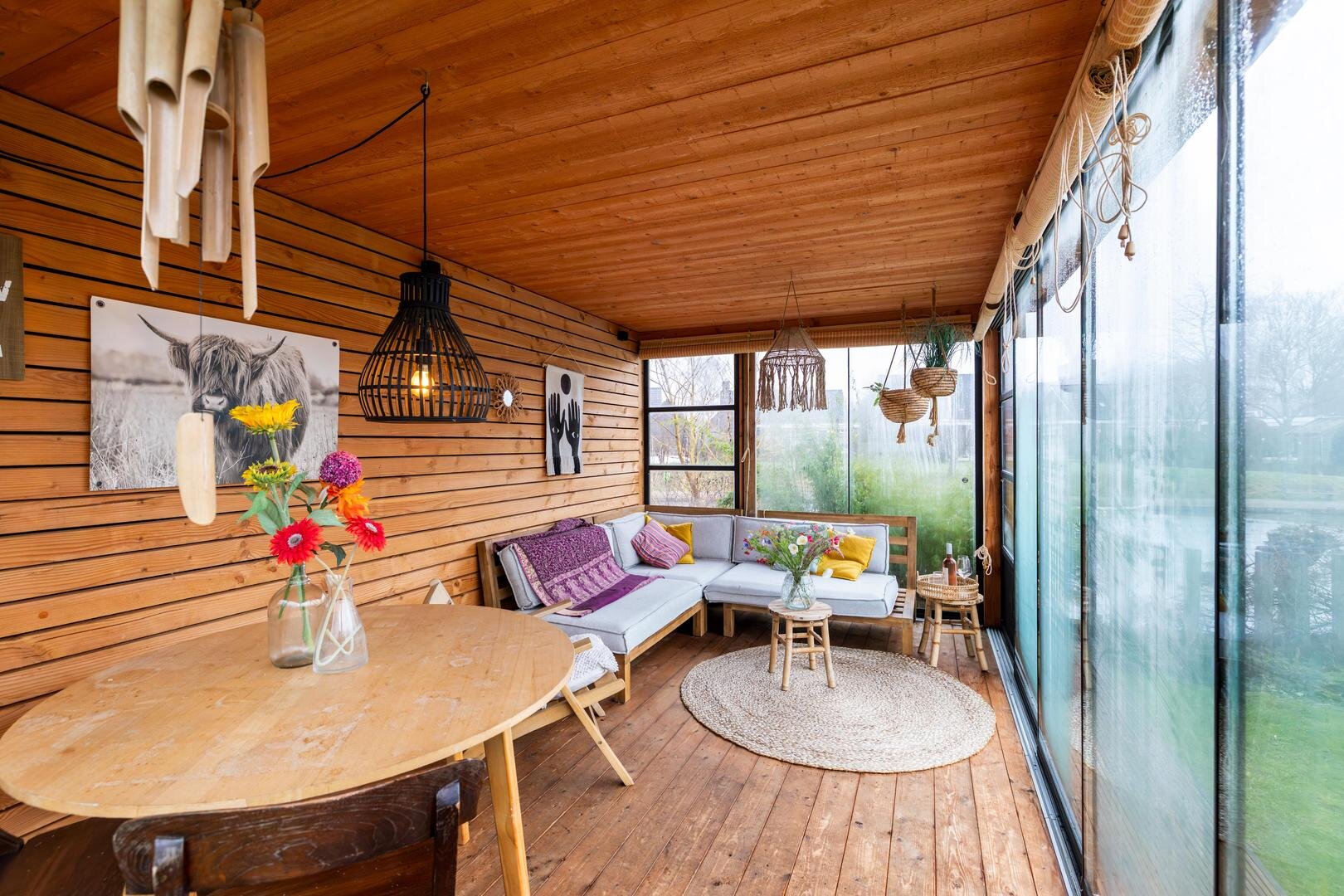 * Groenrijk aangelegde tuin met terrassen, aan het water met overkapte zit en vrijstaande wintertuin/serre