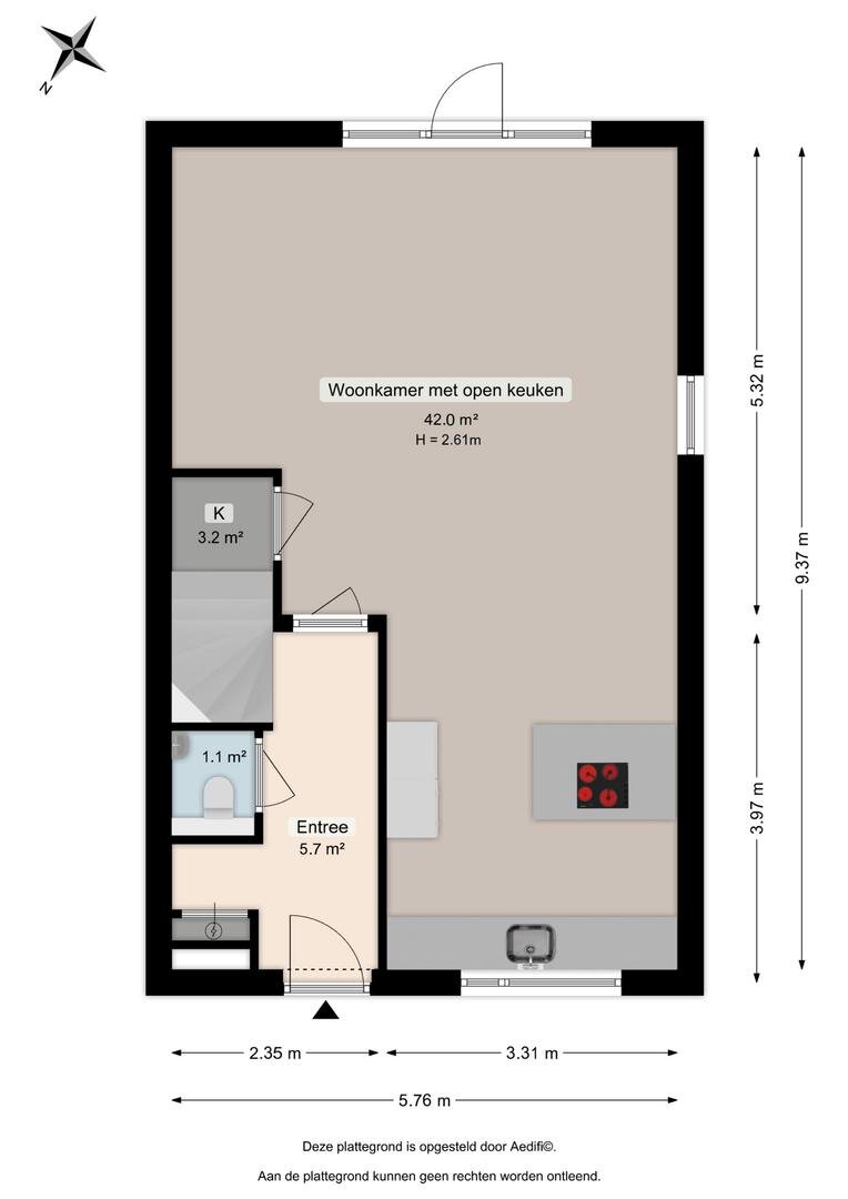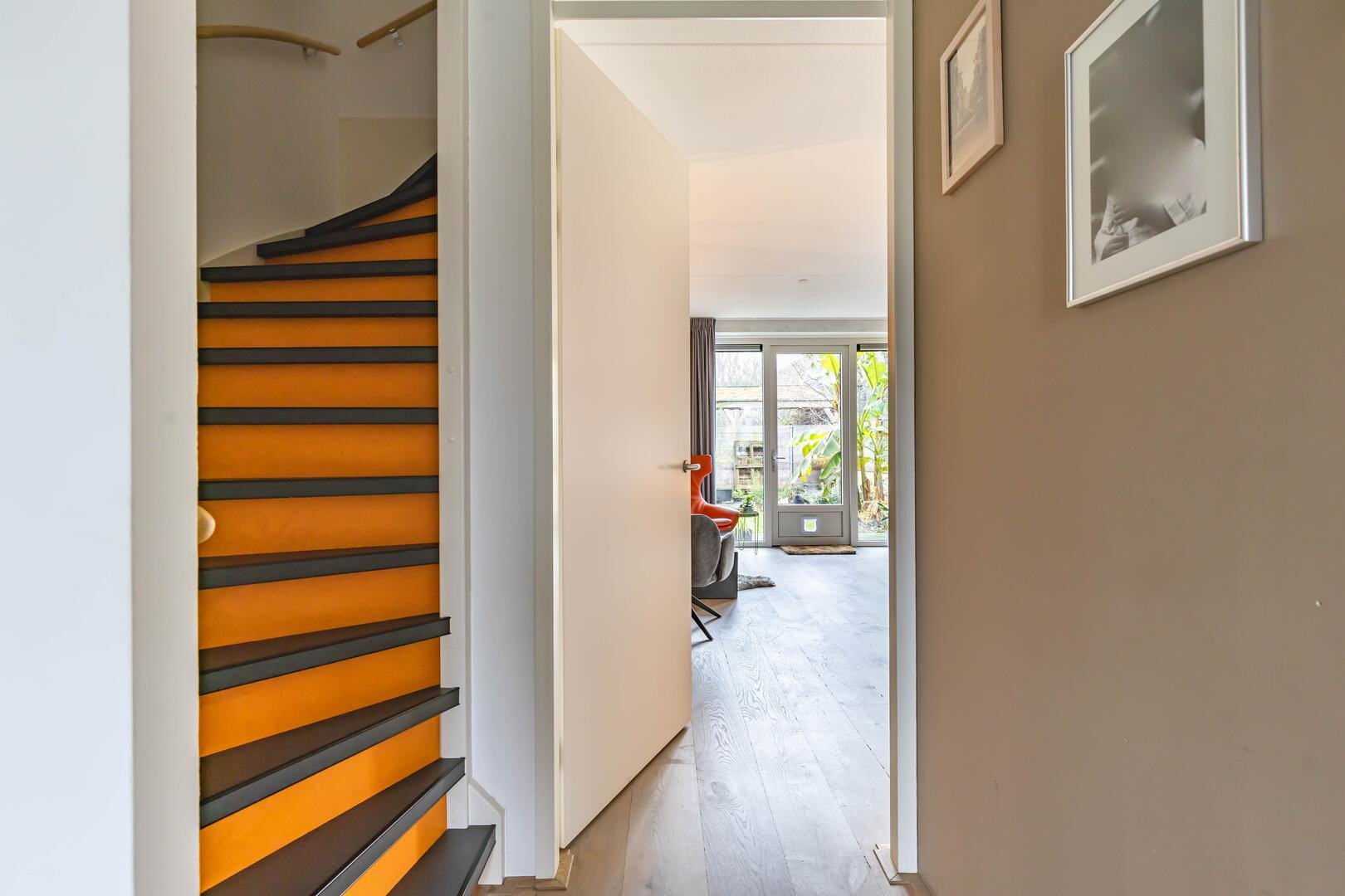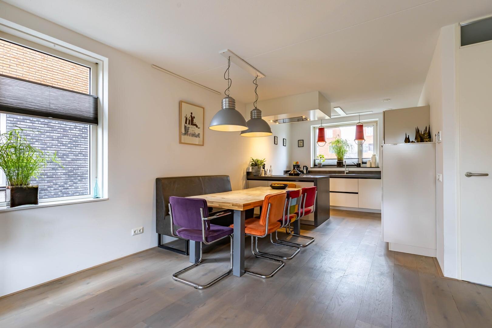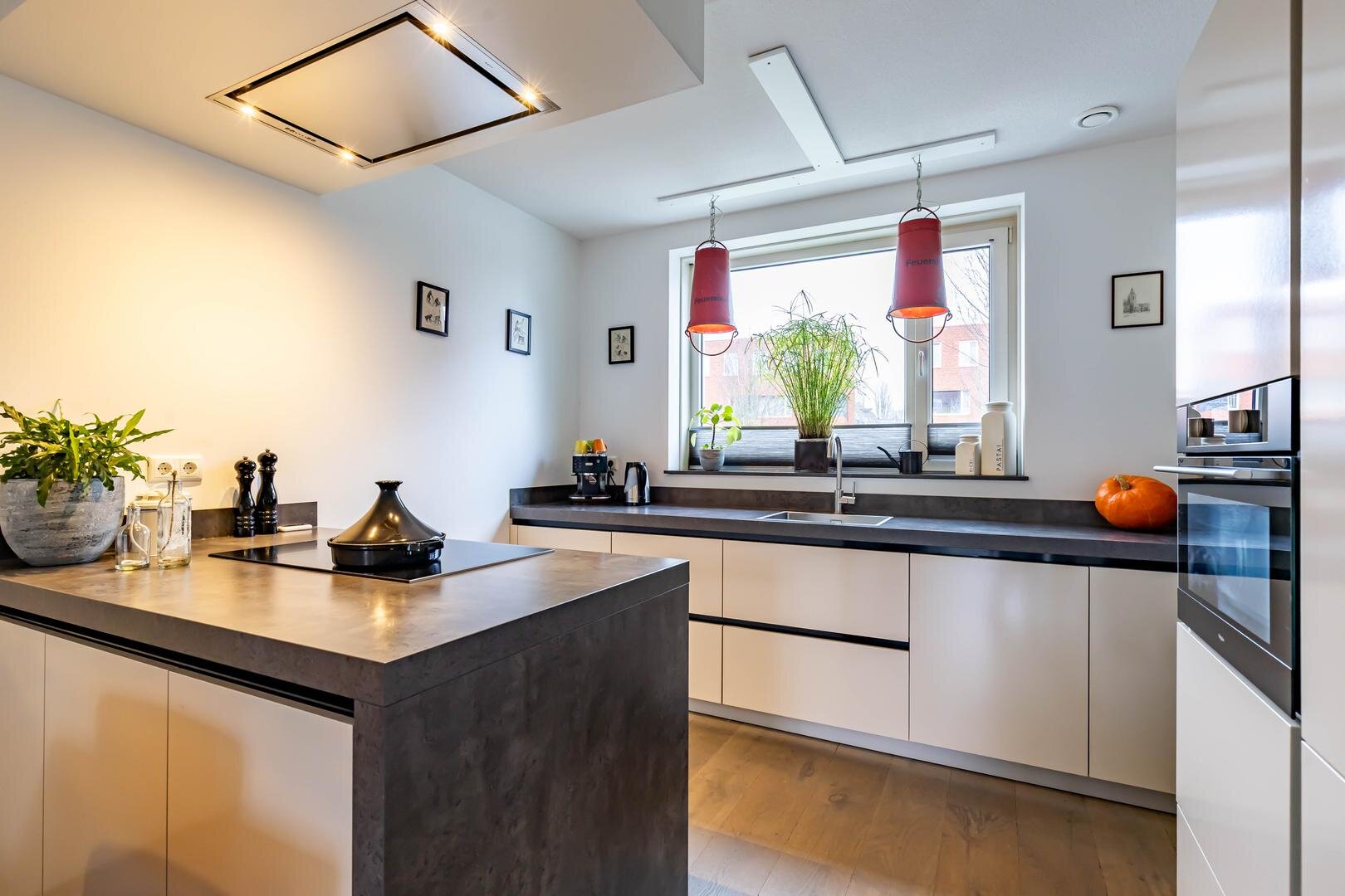 Entree/hal met modern hangtoilet en toegang tot de royale living van ca. 42 m² met open keuken en houten vloer. Dankzij de grote glazen pui met raampartijen en deur is er volop lichtinval en heb je mooi zicht op de tuin. Bij mooi weer lopen binnen en buiten hier naadloos in elkaar over. In de living bevindt zich een vaste kast met bergruimte onder de trap naar boven.Aan de andere zijde van de living ligt de strak vormgegeven keuken met kookeiland, waar je naar hartenlust kunt koken terwijl je optimaal in verbinding staat met de gezinsleden in de woonkamer. De keuken is uitgerust met een hoge kastenwand met grote koelkast en combi-oven. In het kookeiland vind je de inductiekookplaat met strak geïntegreerde afzuigkap en veel werk- en bergruimte. Aan de andere zijde zijn extra kasten voor nóg meer bergruimte. Langs het raam bevindt zich de opstelling met vaatwasser en extra werkruimte, met zicht op de waterpartij.Eerste verdieping