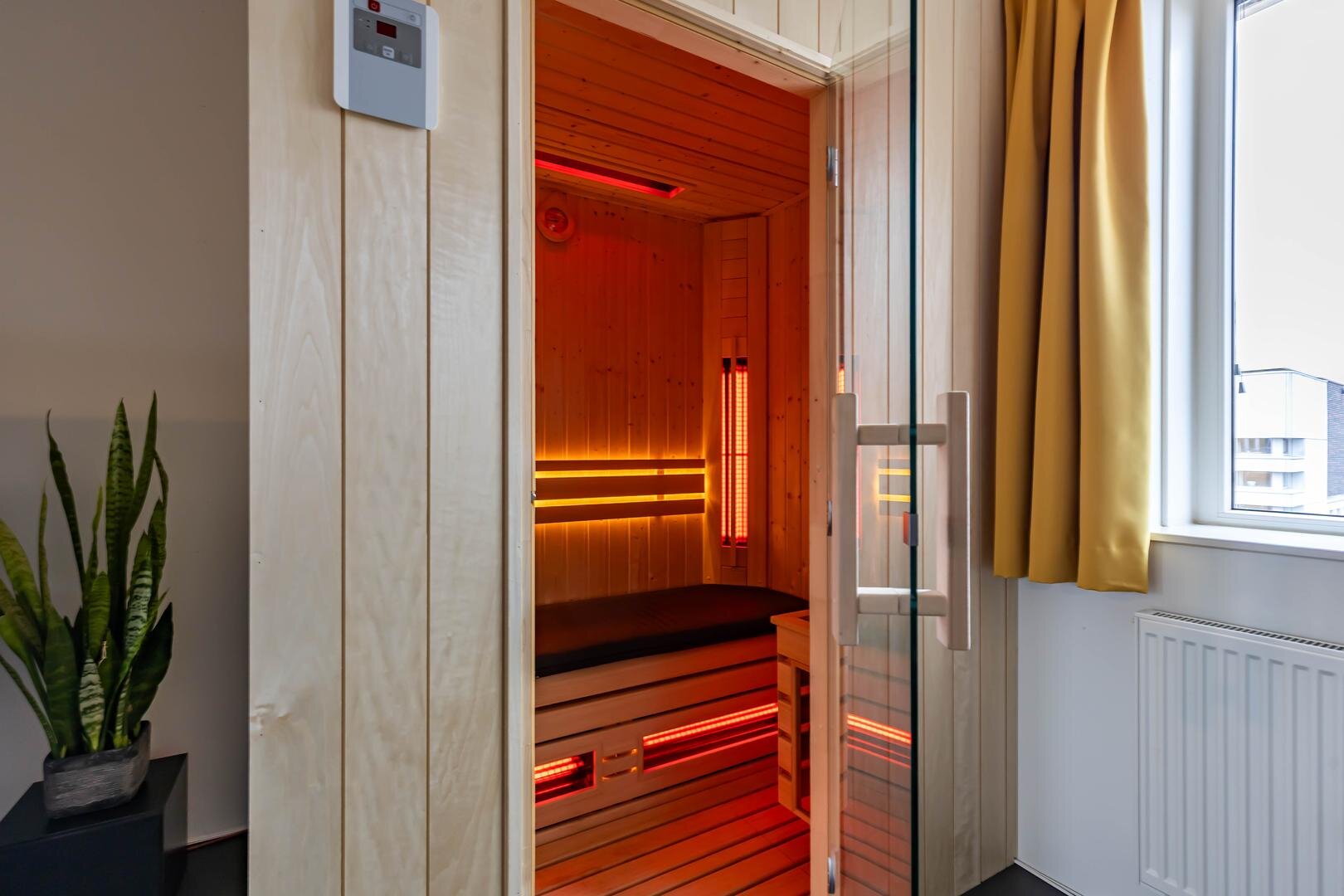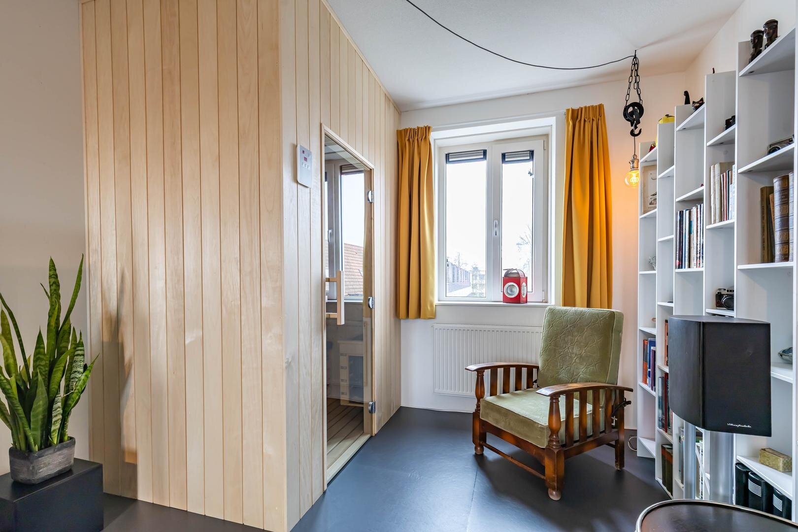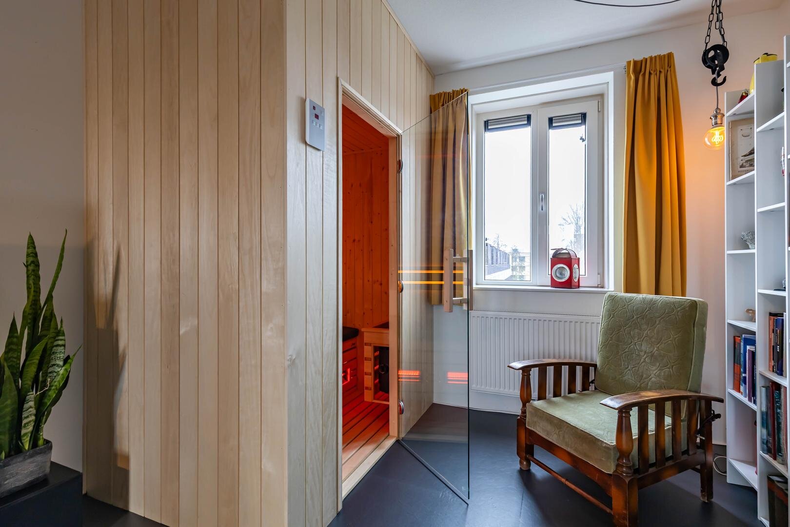 Overloop met walk-in closet van ca. 4 m² met vaste kastenwand. De royale slaapkamer van ca. 25 m² is momenteel in gebruik als werkkamer met wellnesshoek, gecreëerd door een Finse sauna met infraroodfunctie. Deze ruimte is eenvoudig op te splitsen in twee slaapkamers, waardoor het totaal op vijf slaapkamers komt. Daarnaast is er een technische-/wasruimte met aansluitingen voor wasmachine en droger. Hier bevinden zich ook de warmtepomp, boiler, omvormer voor de zonnepanelen, thuisbatterij en het ventilatiesysteem.Buitenruimte