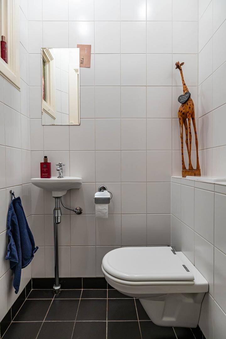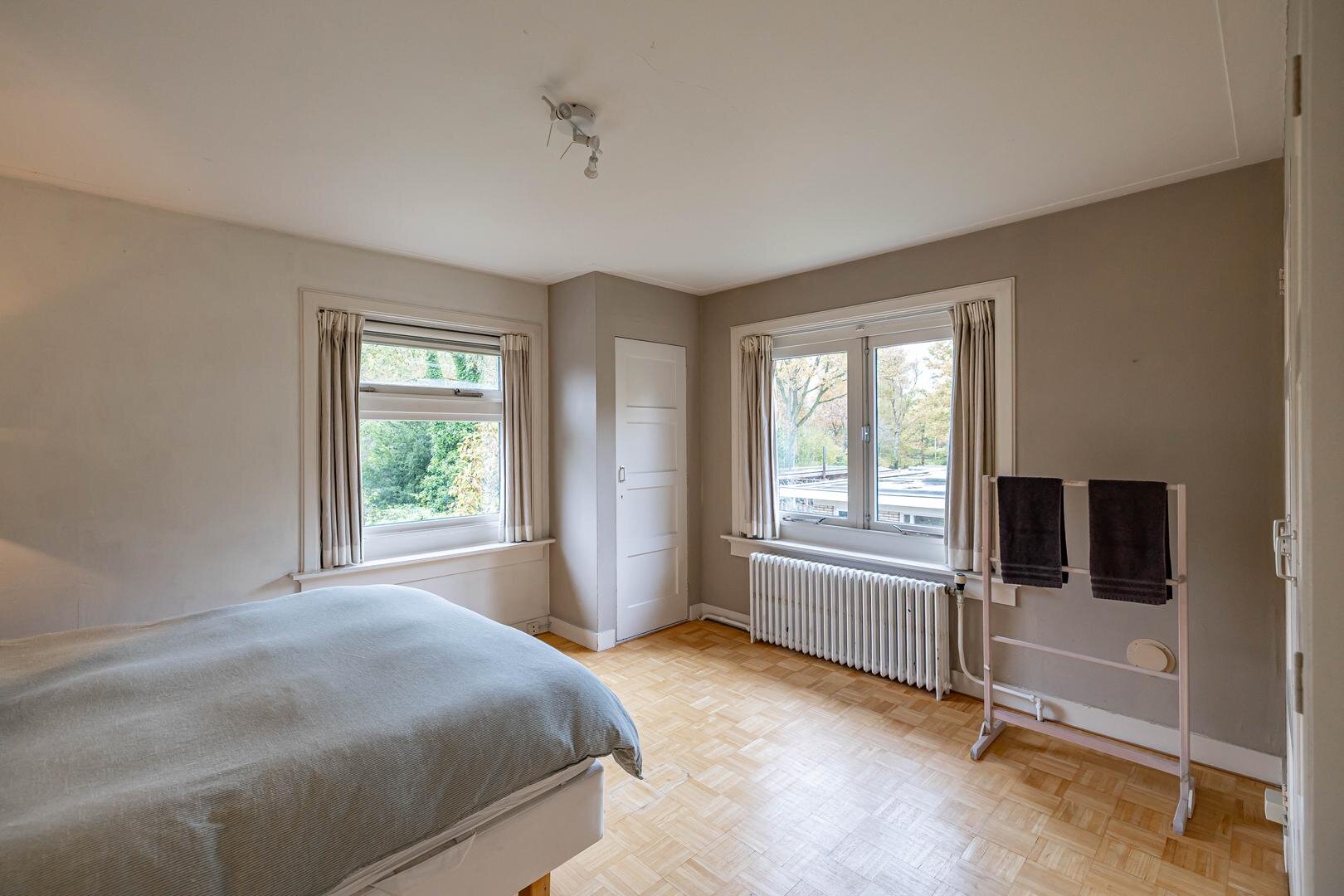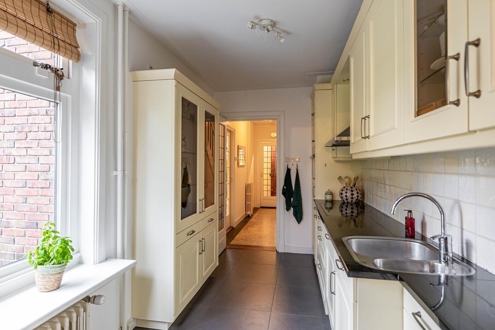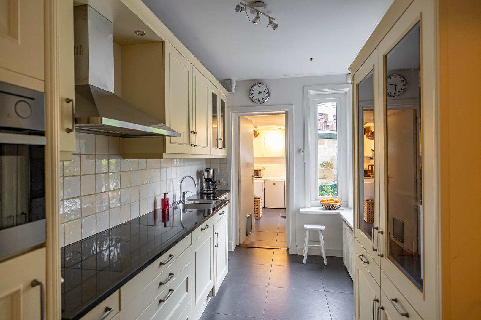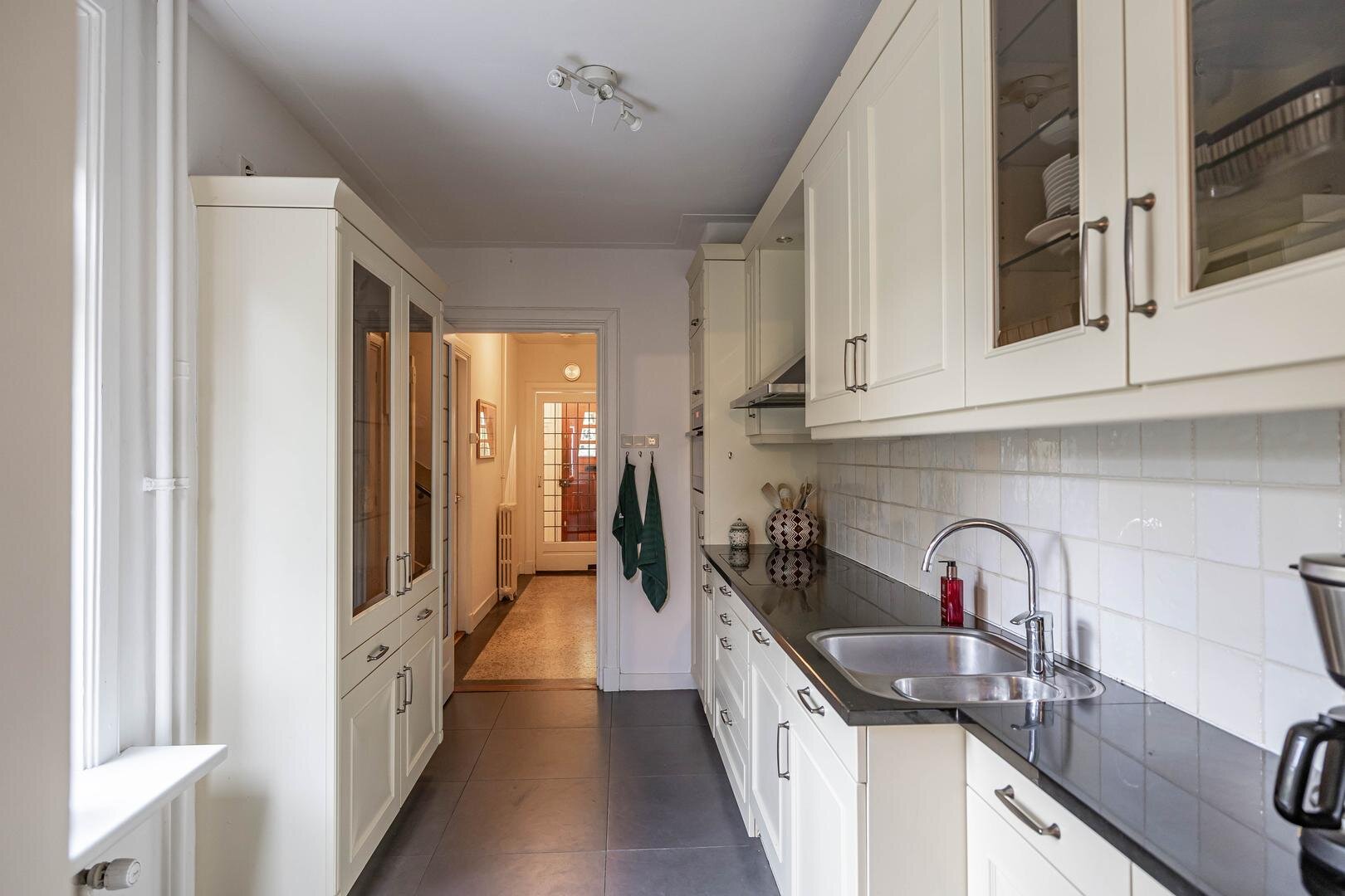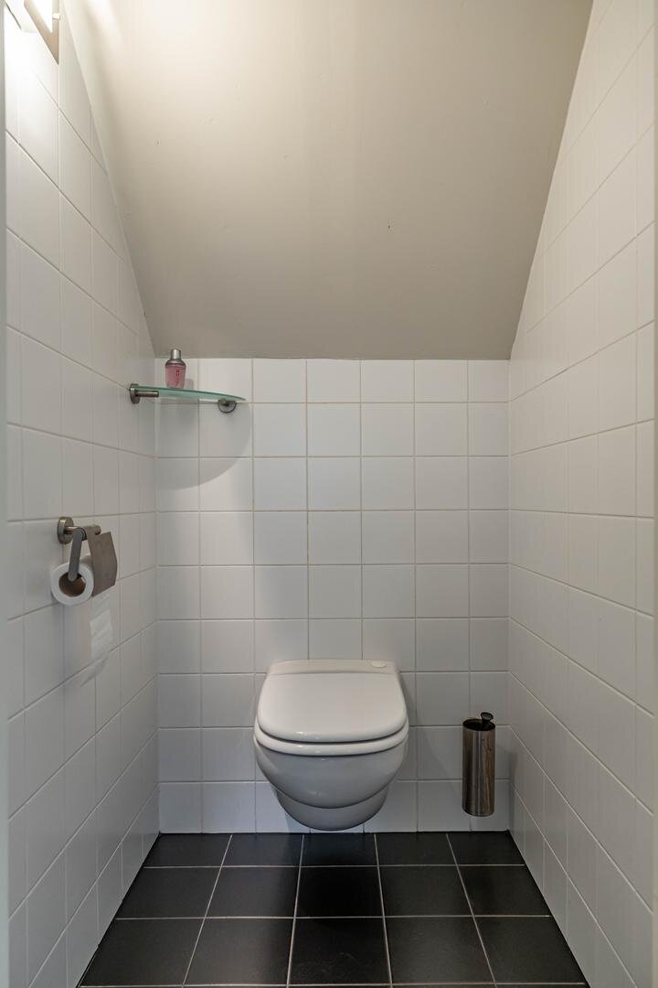 Grenzend aan de hal vinden we verder het moderne toilet en de kelder, die ruim en droog is. De keuken is uitgerust met een uitgebreide, functionele keukenopstelling. Een landelijke stijl voert hier de boventoon, passend bij het huis. De inbouwapparatuur bestaat uit een inductiekookplaat met afzuigkap, koelkast, oven (2018) en vaatwasser (2023). Verder is er volop kastruimte. De aangrenzende bijkeuken heeft een uitgebreide opstelling voor witgoed en biedt veel bergruimte. Vanuit hier kun je de achtertuin bereiken.Eerste verdieping: overloop met toegang tot de in 2022 gemoderniseerde badkamer met inloopdouche, tweede hangtoilet en waskom op meubel, uitgevoerd met zwart-witte accenten en bijpassende tegelvloer. Vanaf hier is er toegang tot een balkon van ca. 5 m². Op deze verdieping zijn twee grote slaapkamers: ca. 16 m² aan de achterzijde met vaste kasten, en ca. 21 m² aan de voorzijde, met toegang tot het balkon van 3,6 m². Beide kamers zijn voorzien van een mooie mozaïek-parketvloer. Verder is er nog de werk-/slaapkamer van ca. 5,2 m² met vaste kast en glas-in-looddeur als toegang.Tweede verdieping: overloop, derde toilet (sanibroyeur) en twee royale slaapkamers met sfeervolle elementen dankzij de kapconstructie: ca. 12 m² met vaste boekenkasten en 13 m² met Velux-dakramen voor extra lichtinval. Beide kamers zijn voorzien van vaste kasten. De badkamer op deze woonlaag beschikt over een douchecabine en een breed wastafelmeubel met wastafel – ideaal voor logés of tieners die hun eigen plek in huis zoeken.