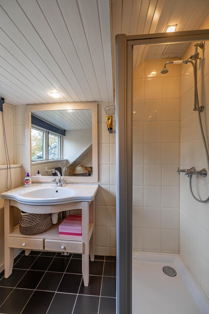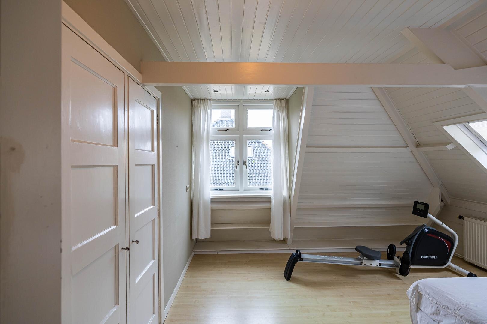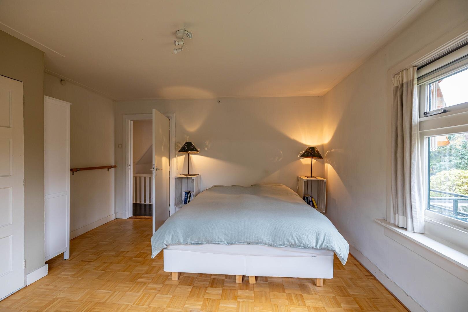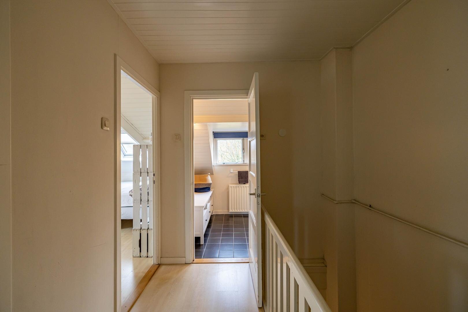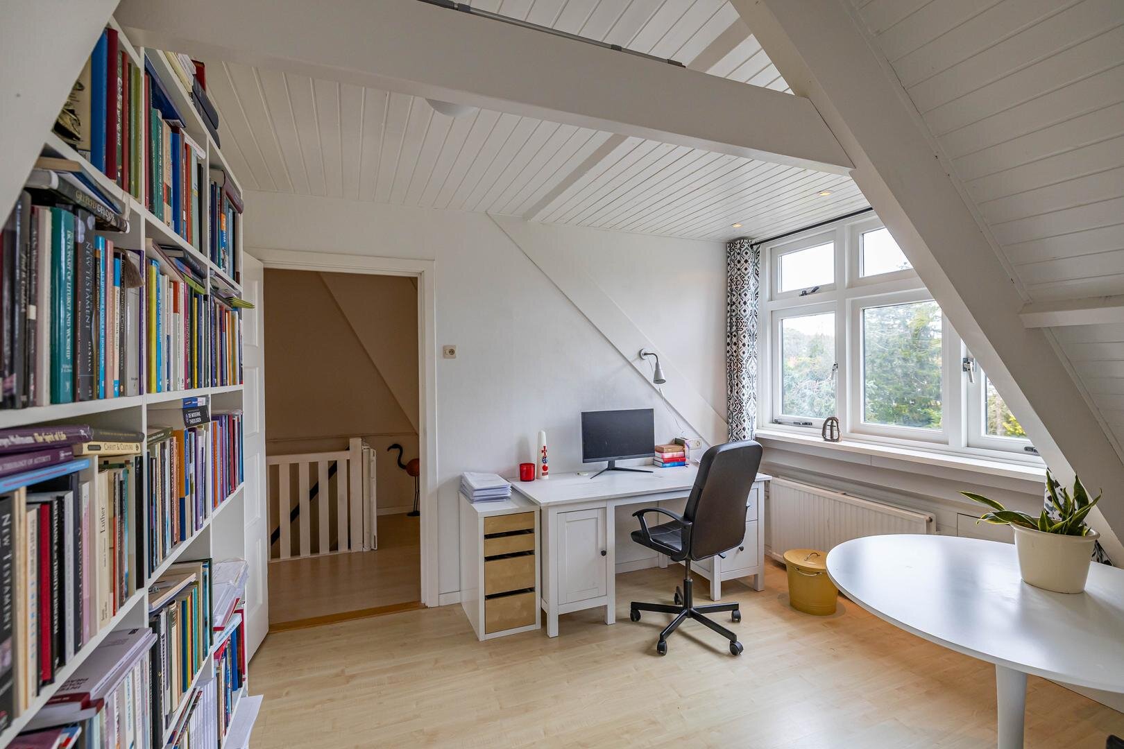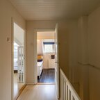 Grenzend aan de hal vinden we verder het moderne toilet en de kelder, die ruim en droog is. De keuken is uitgerust met een uitgebreide, functionele keukenopstelling. Een landelijke stijl voert hier de boventoon, passend bij het huis. De inbouwapparatuur bestaat uit een inductiekookplaat met afzuigkap, koelkast, oven (2018) en vaatwasser (2023). Verder is er volop kastruimte. De aangrenzende bijkeuken heeft een uitgebreide opstelling voor witgoed en biedt veel bergruimte. Vanuit hier kun je de achtertuin bereiken.Eerste verdieping: overloop met toegang tot de in 2022 gemoderniseerde badkamer met inloopdouche, tweede hangtoilet en waskom op meubel, uitgevoerd met zwart-witte accenten en bijpassende tegelvloer. Vanaf hier is er toegang tot een balkon van ca. 5 m². Op deze verdieping zijn twee grote slaapkamers: ca. 16 m² aan de achterzijde met vaste kasten, en ca. 21 m² aan de voorzijde, met toegang tot het balkon van 3,6 m². Beide kamers zijn voorzien van een mooie mozaïek-parketvloer. Verder is er nog de werk-/slaapkamer van ca. 5,2 m² met vaste kast en glas-in-looddeur als toegang.Tweede verdieping: overloop, derde toilet (sanibroyeur) en twee royale slaapkamers met sfeervolle elementen dankzij de kapconstructie: ca. 12 m² met vaste boekenkasten en 13 m² met Velux-dakramen voor extra lichtinval. Beide kamers zijn voorzien van vaste kasten. De badkamer op deze woonlaag beschikt over een douchecabine en een breed wastafelmeubel met wastafel – ideaal voor logés of tieners die hun eigen plek in huis zoeken.
