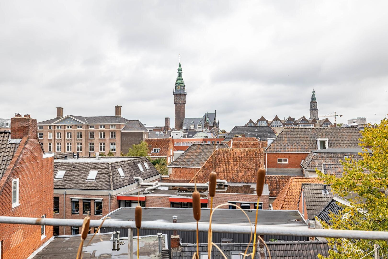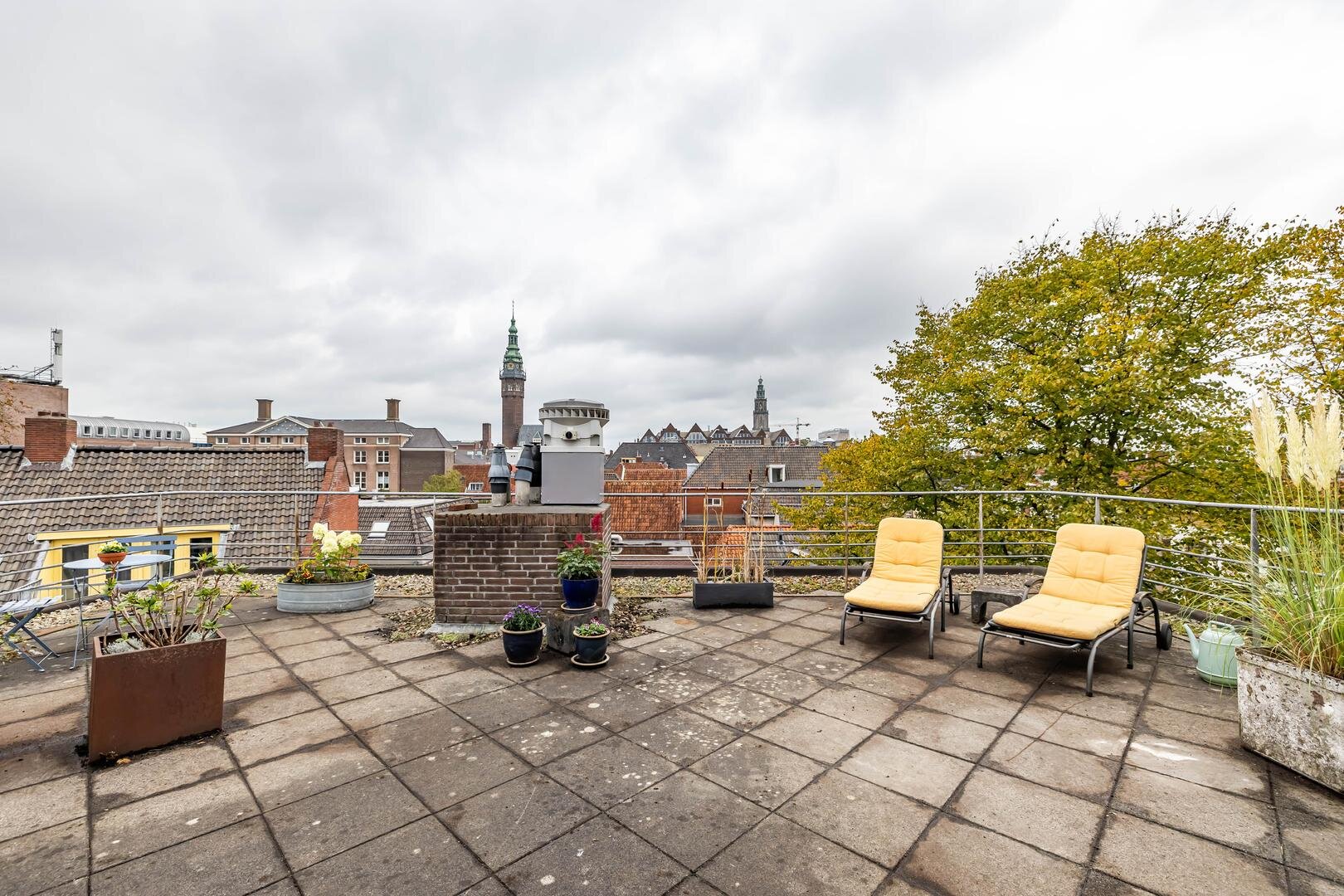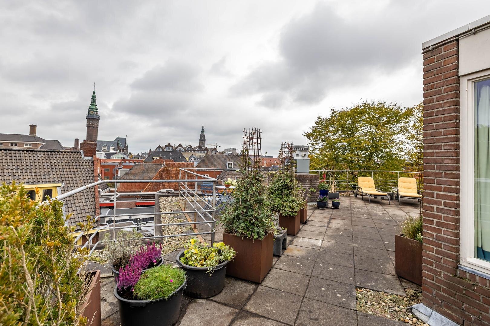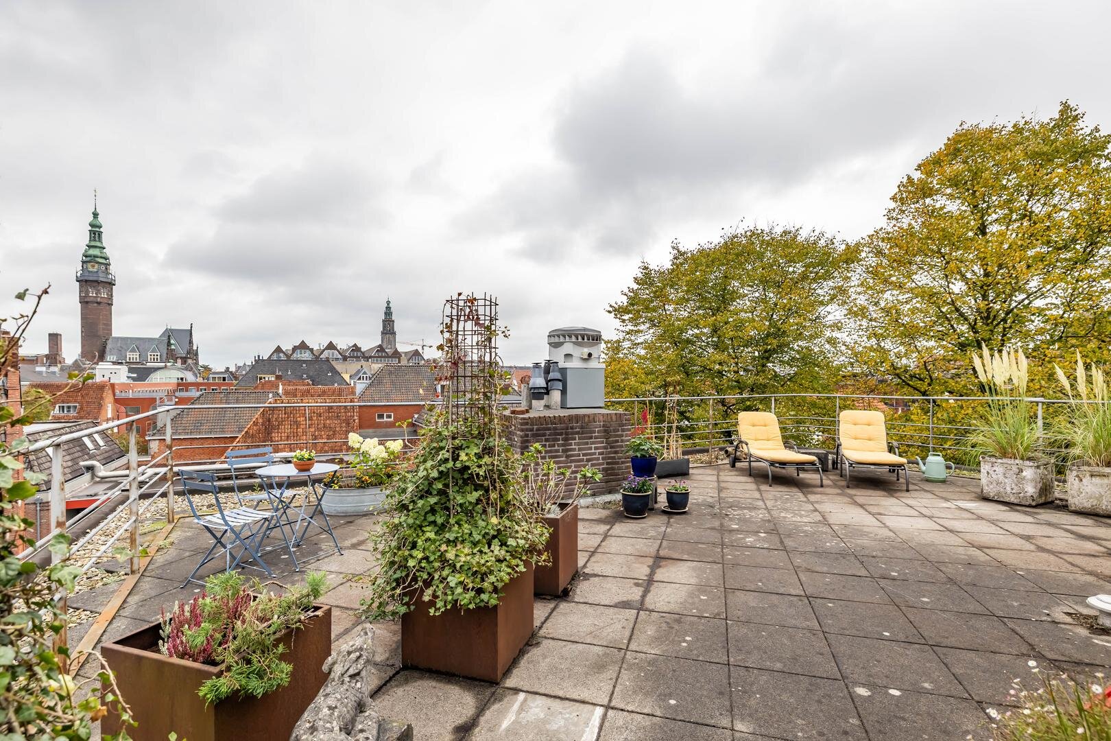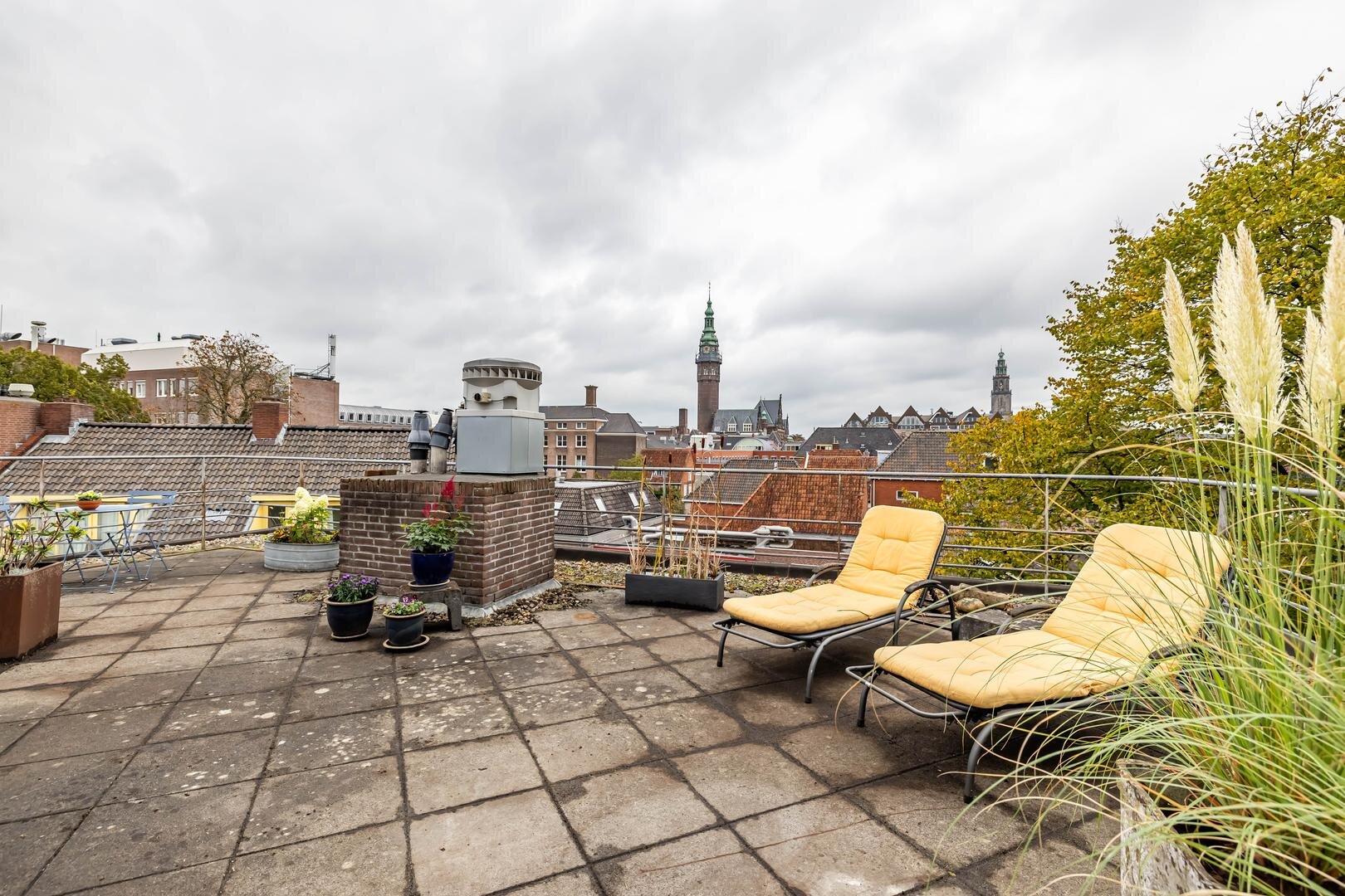 In het stadshart van Groningen, om de hoek van de Hoge der A, is het heerlijk wonen op de 3e en 4e verdieping, mét privé dakterras van 83 m². Een fantastische plek met uitzicht, waar de echte stadsliefhebber alleen maar van kan dromen, met de bruisende stad letterlijk aan je voeten. Met maar liefst 105 m² woonoppervlak heb je binnen volop leefruimte, en dankzij de verdeling over twee woonlagen voelt het aan als een echt (t)huis. Zo zijn er drie slaapkamers aanwezig en heb je, naast dat geweldige dakterras, ook nog een balkon grenzend aan de living. Op de begane grond is niet alleen een eigen fietsenberging te vinden, maar ook een gezellige, gezamenlijke binnentuin waar je het hele jaar door van kunt meegenieten.Indeling derde verdieping:Entree/hal. Aan de rechterzijde lopen we de woonkeuken in van ca. 13,3 m², met een ruime keuken in hoekopstelling, voorzien van oven, inductiekookplaat en een losstaande Liebherr koel-/vriescombinatie. De wasruimte/berging van ca. 3 m² is vanuit hier bereikbaar en biedt plaats aan het witgoed, maar ook aan de cv-ketel (Intergas, 2024). De werkkamer van ca. 10 m² grenst eveneens aan de hal en is een fijne plek om je even terug te trekken. Deze kan ook prima dienstdoen als slaapkamer.De berging van bijna 2 m² in de hal zit naast het moderne toilet met fonteintje. Zo komen we aan bij de royale living van ca. 32 m², met volop raampartijen en de markante spiltrap als eyecatcher. Hier ervaar je de stadse stilte, terwijl je uitkijkt over de gezellige Turftorenstraat. Via de deur is er toegang tot het balkon, waar je beschut kunt zitten met zicht op de bomen.Vierde verdieping:Via de stalen spiltrap komen we op de vierde verdieping met overloop, een slaapkamer van ca. 13 m² met schuine zijde voor een knus gevoel, en een gemoderniseerde badkamer van 4,3 m² met ligbad/douche, wastafel en tweede toilet (sani-broyeur). De slaapkamer van 11 m² heeft een vaste kast met schuifdeuren en – als kers op de taart – toegang tot het dakterras van ca. 83 m²! Wij durven dan ook gerust van een daktuin te spreken, omdat "dakterras" de lading niet dekt. Hier heb je diverse zitjes en kun je genieten van de mooiste uitzichten over de stad. Wat een heerlijke plek om bij mooi weer te vertoeven – en dat helemaal privé.Alsof dat alles nog niet voldoende is, is er ook nog de gezamenlijke en groenrijke binnentuin op de begane grond, waar alle bewoners van het complex gebruik van mogen maken. Daarnaast is er een eigen fietsenberging met voldoende bergruimte van ca. 7 m².* toplocatie, om de hoek van Hoge der A