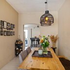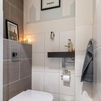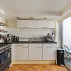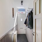 Entree/hal met toepasselijke houten lambrisering aan de wanden; een prettige binnenkomst met toegang tot de ruime en sfeervolle woonkamer van ca. 26 m². De woonkamer heeft een geschilderde houten vloer, een hoog plafond en grote raampartijen voor een fijne lichtinval. De voorzijde ligt op het zuiden, dus er stroomt volop licht naar binnen. De smaakvolle inrichting in hotelchique stijl komt hier goed tot zijn recht.Via het poortje komen we in de woonkeuken van ca. 12 m², met een hoge kastenwand aan de ene zijde en een hoekkeuken aan de andere zijde. De landelijke keuken is voorzien van een koelkast, vriezer, extra grote oven met twee deuren, een 6-pits gaskookplaat, afzuigkap en vaatwasser. Verder is er volop werk- en opbergruimte, mede dankzij de hoge kasten.De verbinding met de patio via de schuifpui geeft een mediterraan gevoel, en het is natuurlijk heerlijk om in de zomer alles open te kunnen zetten. De patio ligt beschut en biedt een fijne plek om te vertoeven. Ooit zat hier een trap naar het dakterras, dus die mogelijkheid is er zeker. De aangebouwde berging is ook bereikbaar vanaf hier en is voorzien van elektriciteit en wateraansluiting. Zodoende staat hier de wasmachine en/of droger.Wanneer we teruggaan naar de hal, is daar een tochtportaal dat toegang geeft tot de rest van de hal, met aansluitend het toilet met wastafeltje; dit is in 2018 gemoderniseerd.Verdieping: