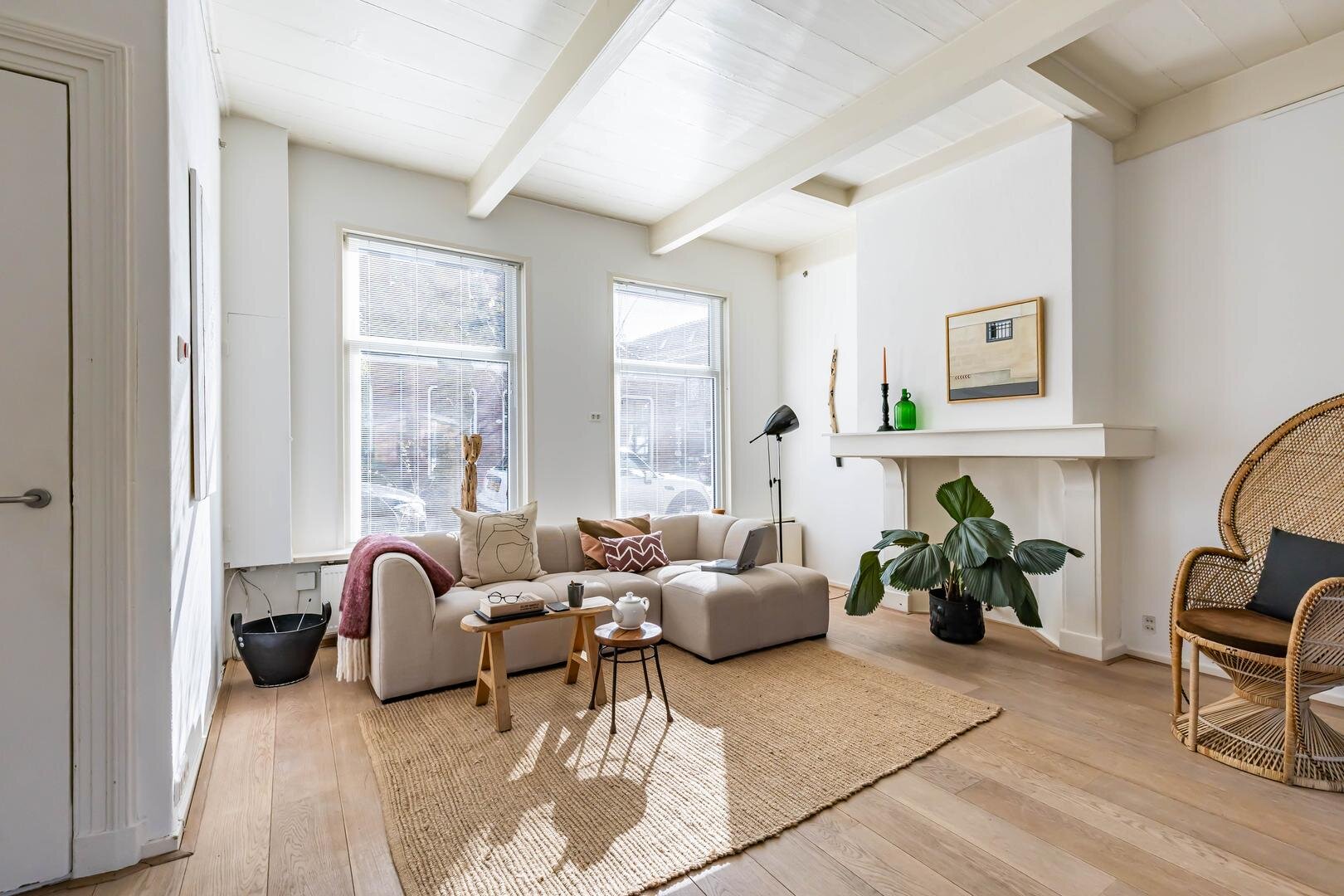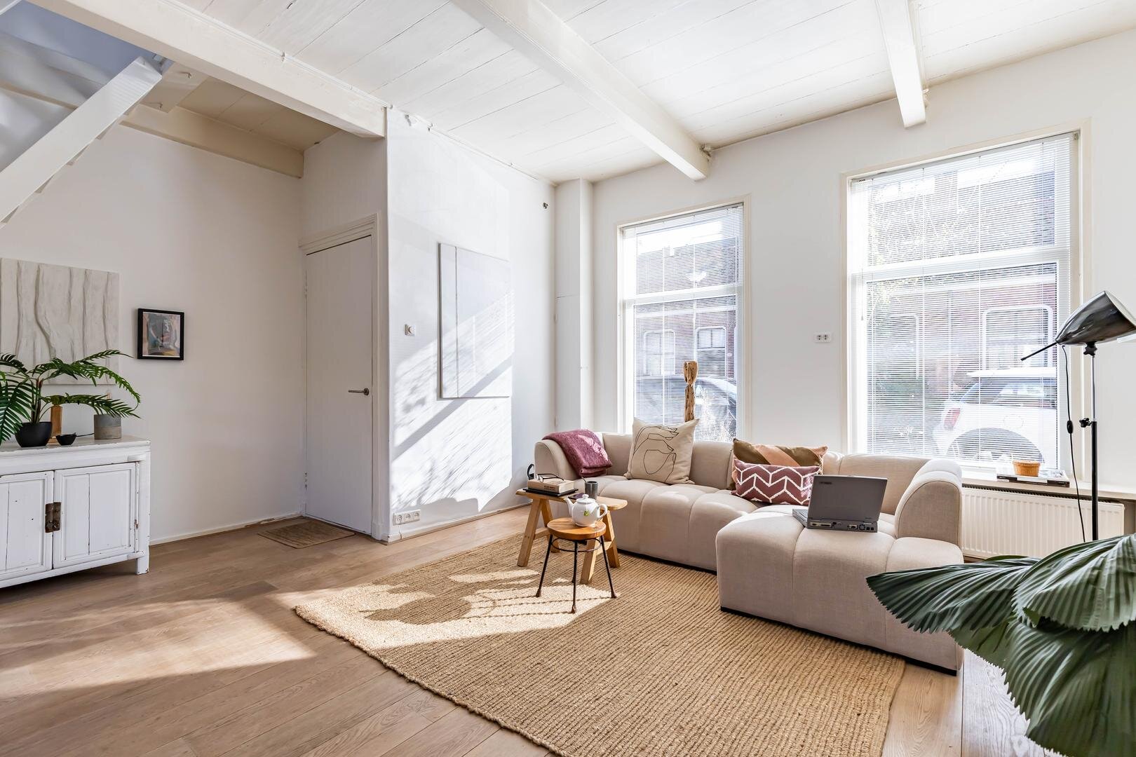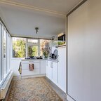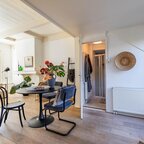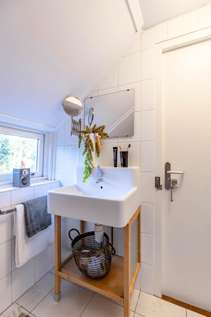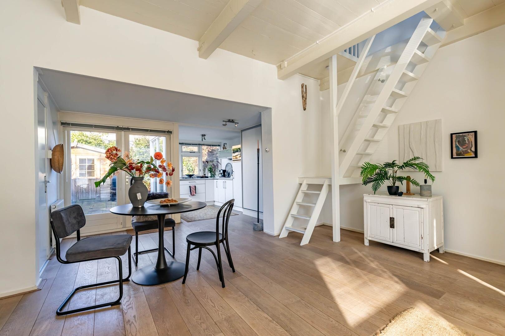 Via de entree/hal kom je in de verrassend ruime en lichte woonkamer van ca. 38,5 m² met open keuken. Het hoge balkenplafond (2,95 meter) versterkt het gevoel van ruimte en karakter. De houten vloer en de aanwezige schouw onderstrepen de authentieke sfeer. De indeling is ruimtelijk en je valt direct voor de geweldige lichtinval die van alle kanten door het huis stroomt.De open keuken ligt aan de tuinzijde en is uitgevoerd in een praktische hoekopstelling met veel kast- en werkruimte. Voorzien van een combi-oven, gaskookplaat en een koelkast met vriesvak (2025). Tijdens het koken kijk je via de vele raampartijen uit op de tuin. In de vaste schuifkast bevinden zich de cv-ketel en de aansluitingen voor wasmachine en droger.De badkamer is eenvoudig maar netjes en functioneel ingericht met een douchecabine, wastafel en toilet. Vanuit de living met eethoek geven openslaande deuren toegang tot de tuin. In de zomermaanden laat je binnen en buiten moeiteloos in elkaar overlopen – een heerlijke plek om te genieten. Via de trap in de hoek van de woonkamer bereik je vervolgens de slaapverdieping.Verdieping: