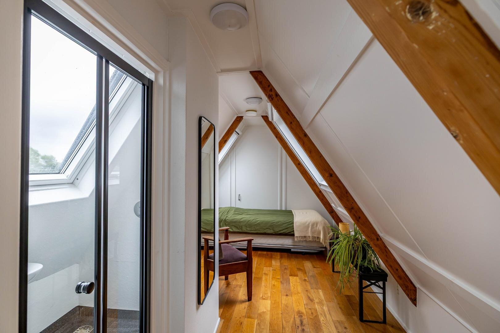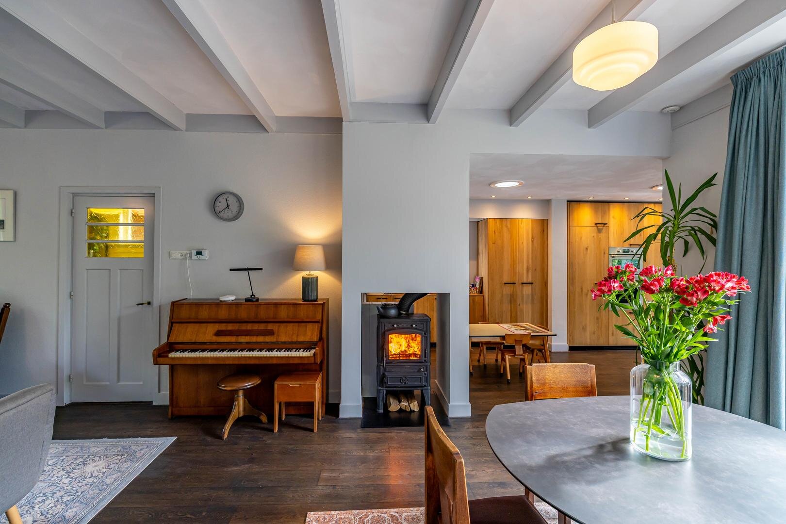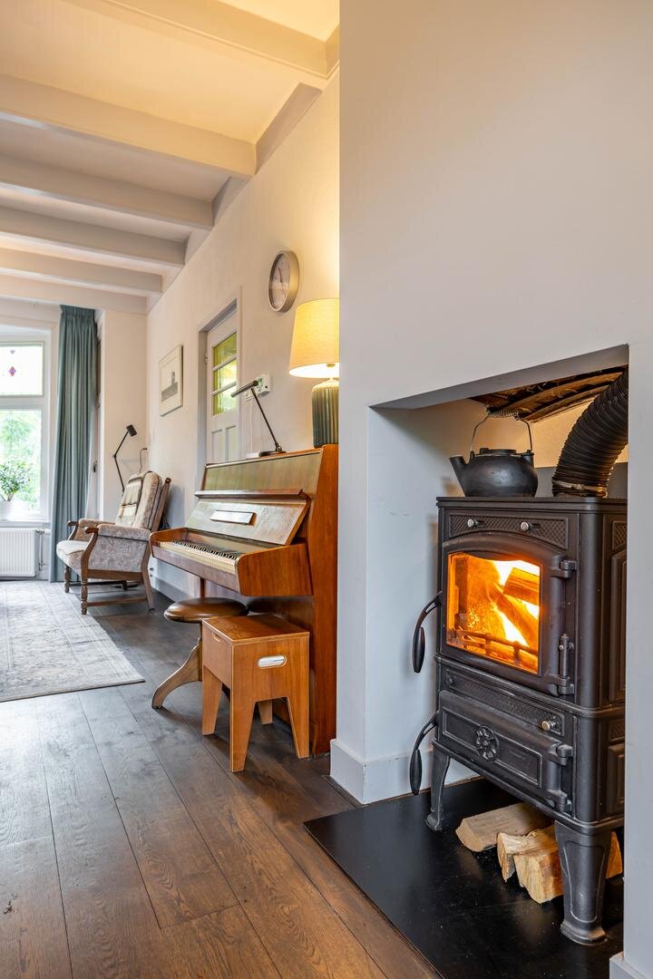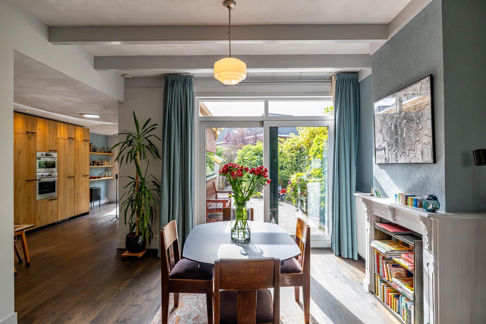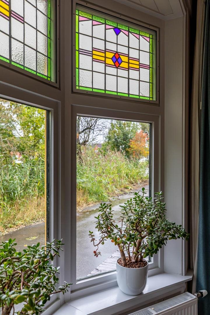 Aan het doorgaande vaarwater van het Damsterdiep ligt dit ruime, vrijstaande woonhuis uit 1928 met vrijstaande houten garage en tuin op het zuiden. Dit huis is wel heel bijzonder, met het karakter van eind jaren '20 en het hedendaagse comfort dankzij de verfijnde modernisering van de afgelopen jaren én de inzet van diverse duurzame maatregelen. Een fijn huis, een warm en liefdevol huis, dat zie je aan alles. Er is met smaak en gevoel voor stijl een nog betere versie gemaakt van het origineel. De authentieke elementen zijn daarbij bewaard gebleven, zoals glas-in-lood ramen, originele schouwen en de hoge balkenplafonds. Kom mee en laat u verrassen.De ligging is bovendien geweldig, aan een autoluw wijkje met zicht over het water en de voorzieningen van de stad Groningen binnen fietsbereik. Ook natuurgebied Kardinge en Noorddijk met haar prachtige molen liggen op loopafstand.Indeling: Entree/ruime hal met grindvloer, waar zich het toilet en de trapopgang naar boven bevinden. De woonkamer, die we vervolgens binnenstappen, brengt je met haar stijlvolle balken en houten vloer zo terug in de tijd – zeker wanneer je een blik werpt door de fraaie glas-in-loodramen van de erker. Tegelijkertijd voel je het comfort van de woning en zie je dat hier kosten noch moeite zijn gespaard om het geheel naar een hoger niveau te tillen. Dat gevoel wordt alleen maar sterker wanneer je richting de eethoek met grote schuifpui kijkt.Daar staat een fijne houtkachel, werkend op de cv, voor die gezellige koudere avonden – maar ook zeker om op energie te besparen, dankzij de koppeling met de verwarming. Vanuit de eethoek kun je naar de tuin, maar je komt hier ook bij de werkelijk prachtige open keuken (uit 2019), met een hoge houten kastenwand van licht eiken aan de ene zijde en een werk- en spoelwand in een donkere tint aan de andere zijde.Een echte eyecatcher van hoge kwaliteit, met een betonnen werkblad en voorzien van alle denkbare apparatuur: inductiekookplaat met afzuigkap, grote vriezer en koelkast, oven, combi-magnetron, Quooker (kokendwaterkraan) + Cube (gefilterd, gekoeld en bruisend water) en vaatwasser. Dankzij de vele raampartijen – ook in de hoek – is er volop lichtinval. Er is optimale bergruimte in de vele kasten en lades, maar ook in de provisiekelder die vanaf hier toegankelijk is. Aan het uiteinde van de keuken kun je plaatsnemen op een van de barkrukken, meekijken in de keuken of genieten van het zicht op de tuin.Eerste verdieping: Overloop, slaapkamer aan de voorzijde van ca. 14 m² met zicht op het water en een ruime kastenwand. De badkamer is ca. 5 m² – eenvoudig, maar functioneel – met een douchecabine, tweede toilet, vaste wastafel, designradiator en zelfs een ligbad. De twee andere slaapkamers zijn ca. 8 m² en 7 m² groot en liggen aan de achterzijde van de woning. De schuine kap geeft de kamers een knusse uitstraling, en de parketvloer op deze verdieping onderstreept dat.Tweede verdieping: Overloop met volop lichtinval dankzij de tripple glas dakramen. Op deze verdieping is nog een slaapkamer van ca. 7 m² bereikbaar, met een eigen douche, wastafel en toilet (sani-broyeur). Een efficiënte en lichtovergoten ruimte. Er ligt een mooie houten vloer, en het geheel is keurig afgewerkt. Aan de andere zijde is nog een fijne werkhoek bereikbaar, vanwaar je opnieuw een mooi uitzicht over het water hebt. Deze verdieping is in 2022 volledig vernieuwd en geïsoleerd. De ramen zijn voorzien van elektrisch bedienbare screens, net als de ramen aan de zuidzijde op de etages hier beneden.Achter het huis ligt een ruime, onderhoudsvriendelijke achtertuin van ca. 128 m², waar zon gegarandeerd is zodra hij schijnt – want de tuin ligt op het zuiden. Hier kun je dus echt genieten van het buitenleven, zonder al te veel te hoeven tuinieren. De houten garage is vrijstaand en bereikbaar via de mandelige weg.* met een heerlijk uitzicht over het water, zo richting het weiland met stadsmarkering.